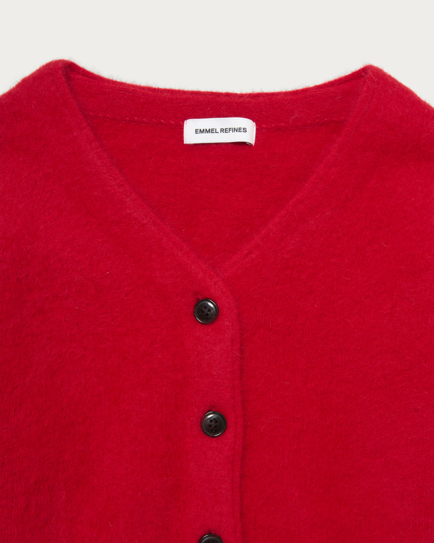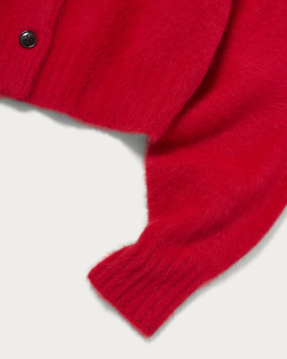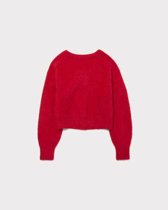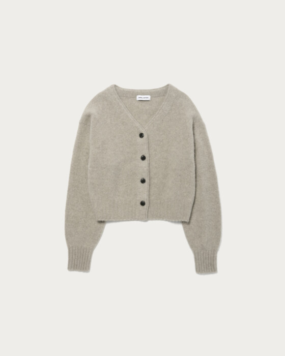 肌ざわりが気持ち良いふわふわの毛足が魅力なFOX混ニット。短丈ゆったりシルエットでフェミニンな糸使いも程よく抜け感のある印象で着て頂けます。ベーシックに使いやすいアイテム、配色釦がポイントになっています。風合いの良い柔らかいふわふわの毛足が魅力的。FOXに加えカシミヤも少し入っています。程よい肉感はありつつも軽いので着やすいです。