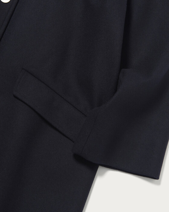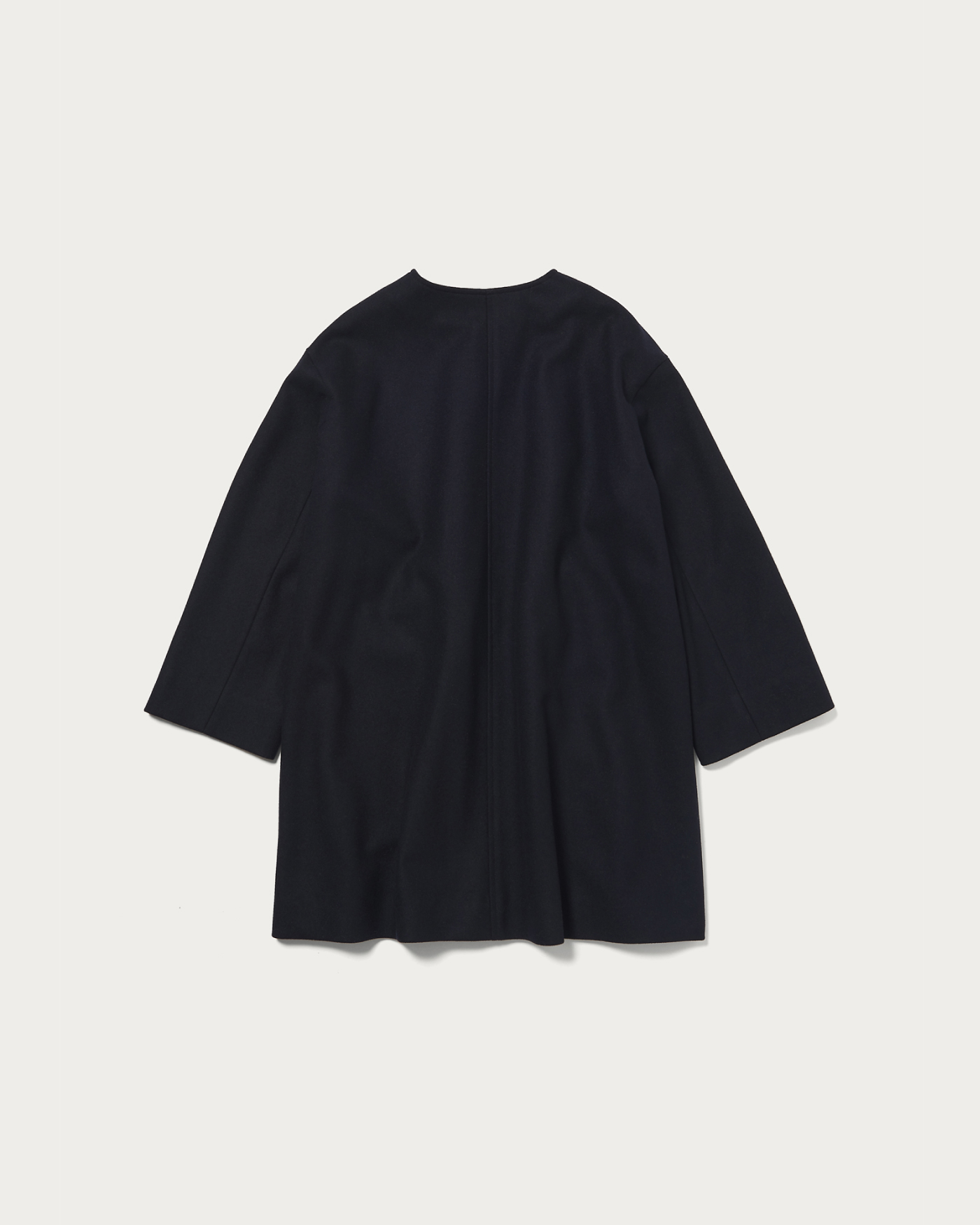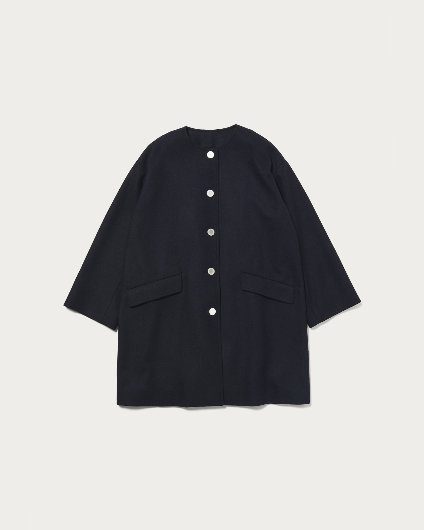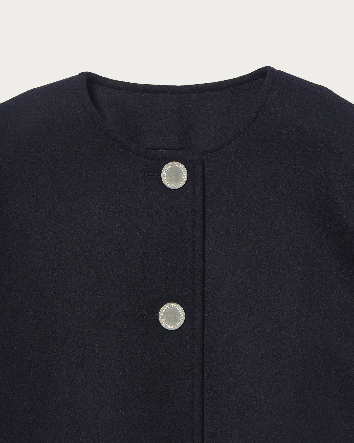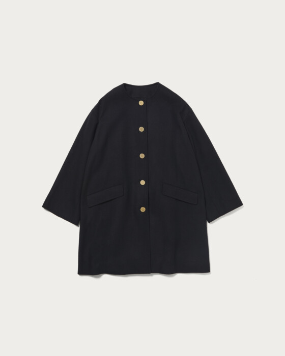 〈Traditional Weatherwear〉のインラインで展開のあるLINTONノーカラーコートをベースに別注した特別なコートです。丈を5cm短く調整することで、よりワイドなボトムスとの相性が合うバランスに仕上がっています。カラー毎でボタンにもこだわり、ブラックには上品なゴールドボタンを、ネイビーにはシルバーのボタンを採用しました。シンプルながらも細部にこだわったデザインが魅力の一着です。