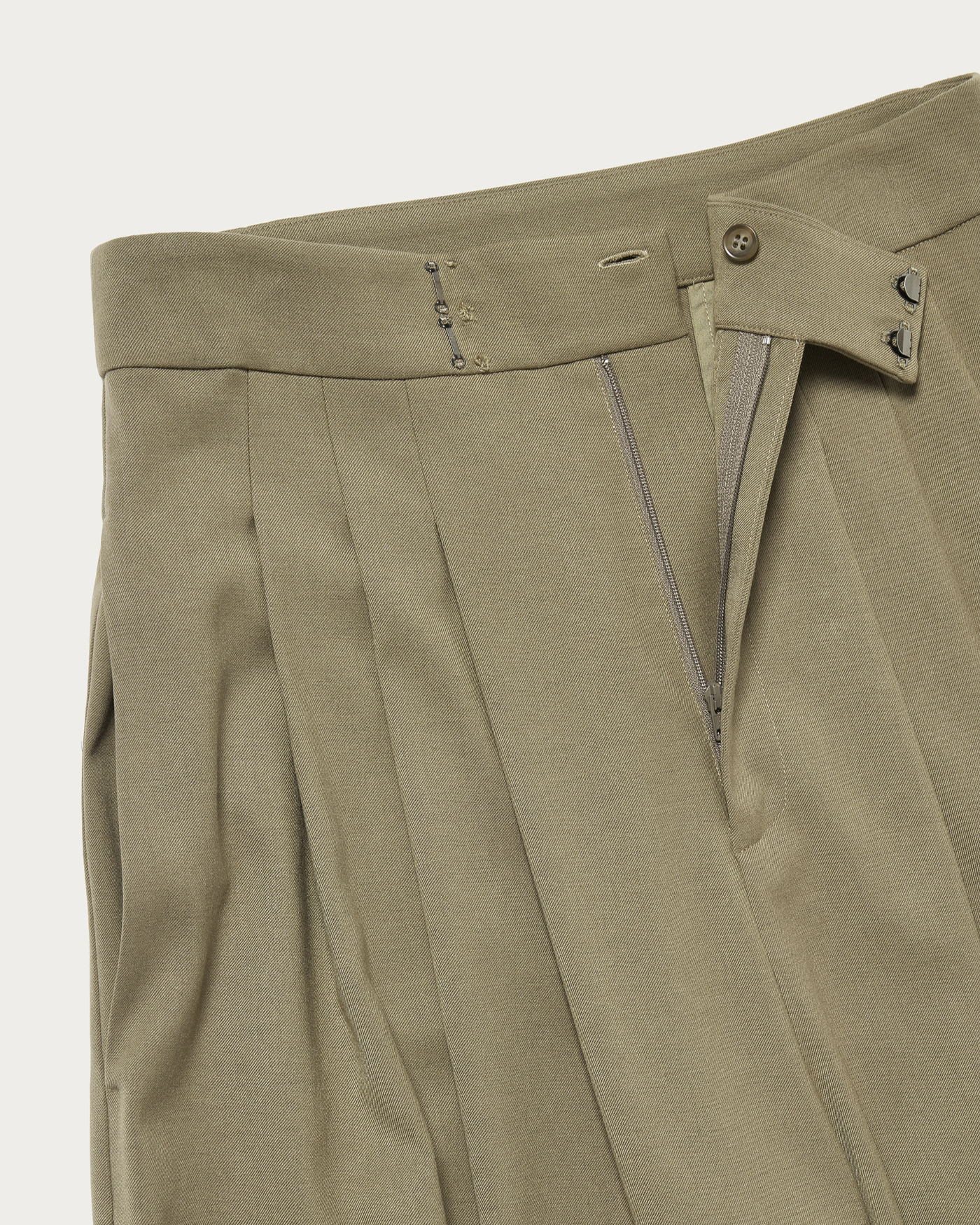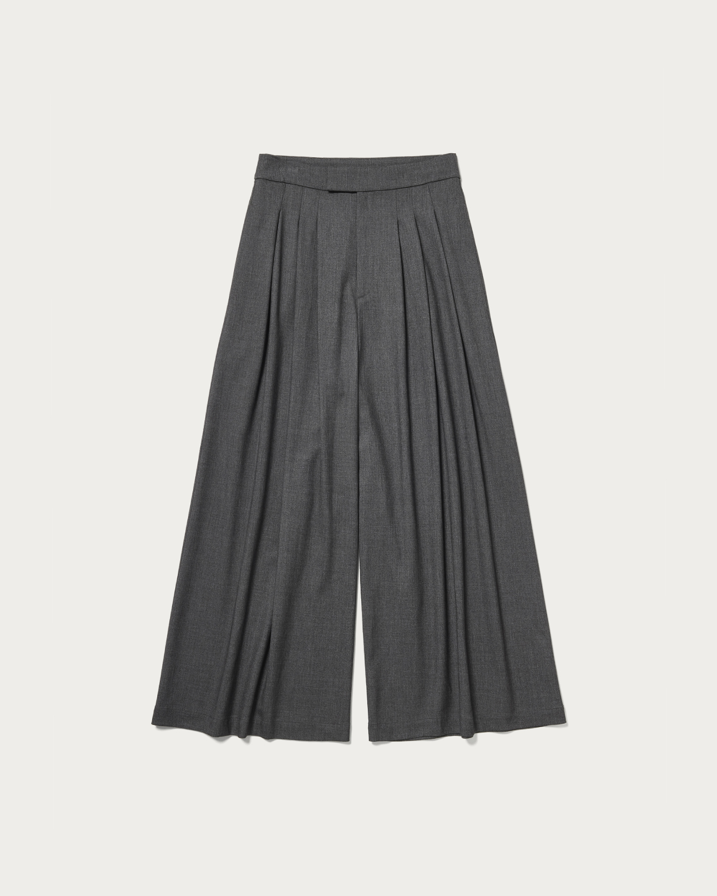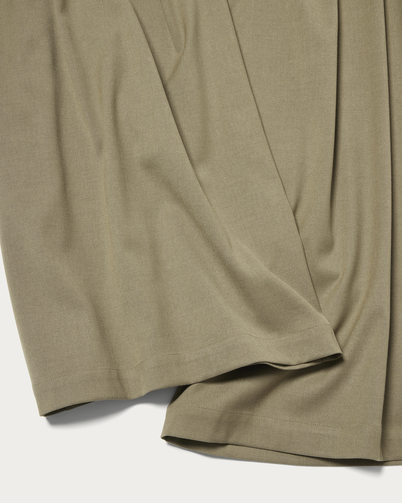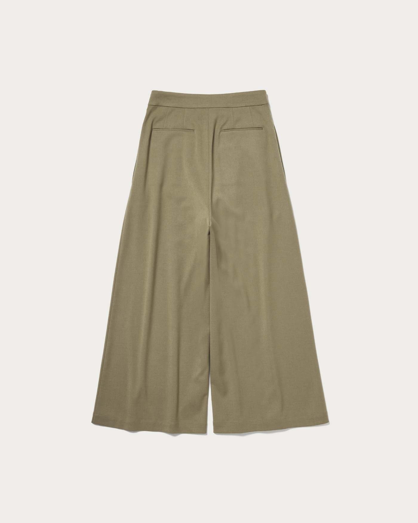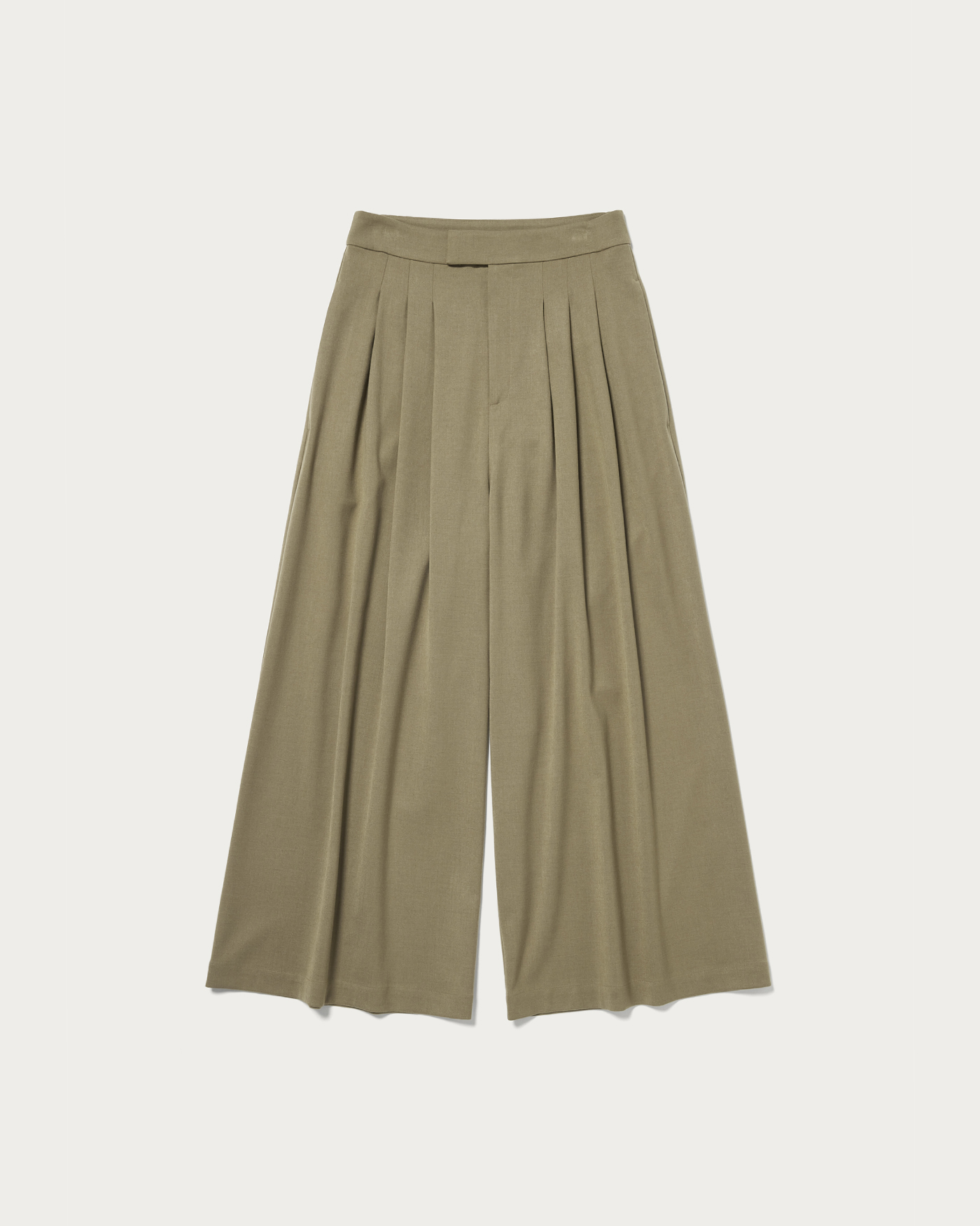 3本のタックが生む立体感で、動きのあるシルエットを生み出すワイドパンツ。贅沢に生地を使用しボリュームがありながらも、腰まわりはすっきりと仕上げました。スカートのような揺れ感が、装いに華やぎを演出。コンパクトなトップスと合わせて、バランスよく着こなして。