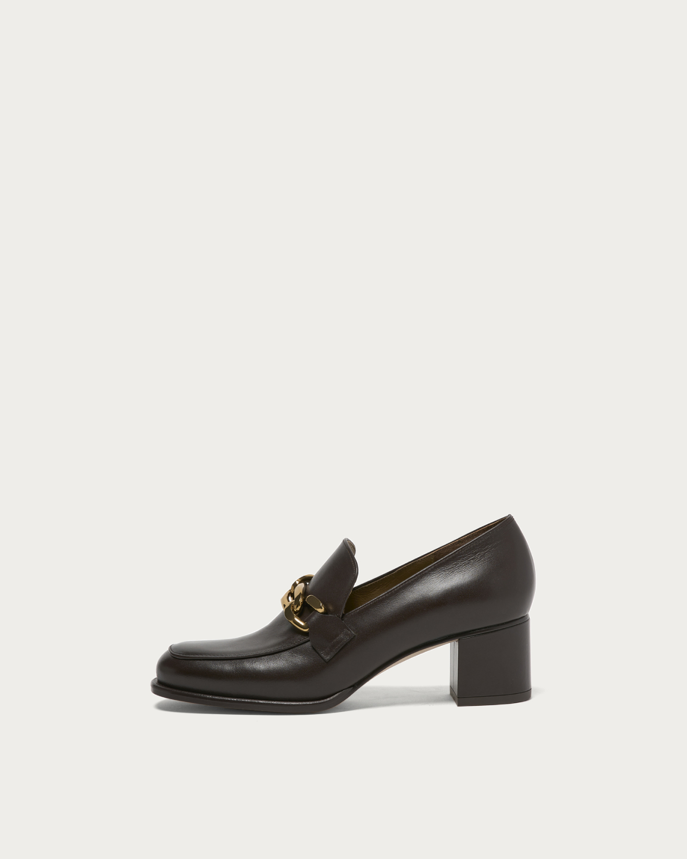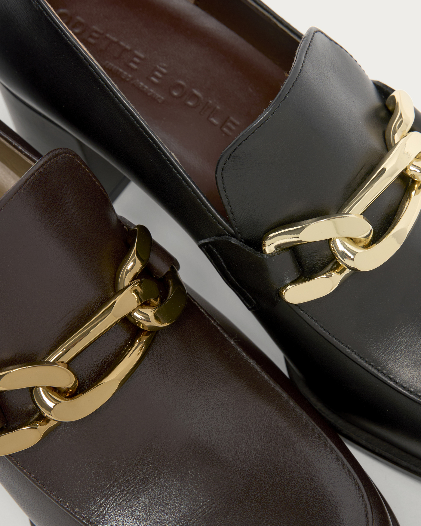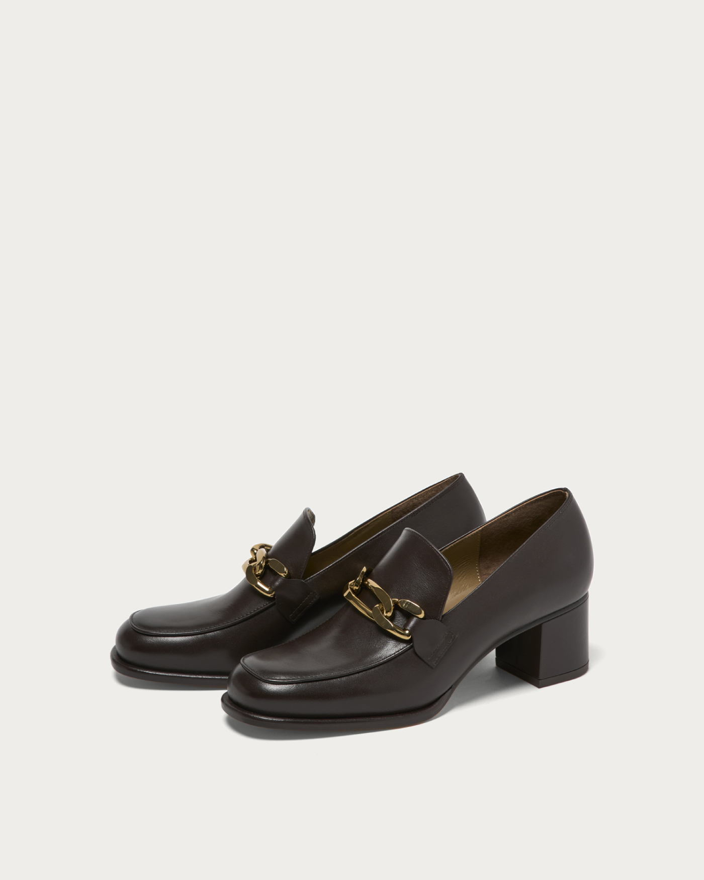 メタルチェーンが存在感を放つモダンローファー。厚みをもたせたラウンドスクエア木型が安定感と今っぽさを両立させ、55mmのヒールアップで脚長効果も。ブラックやブラウンなど落ち着いたカラーと合わせて、タートルニットやジャケットを合わせた冬コートスタイルにも映える一足です。