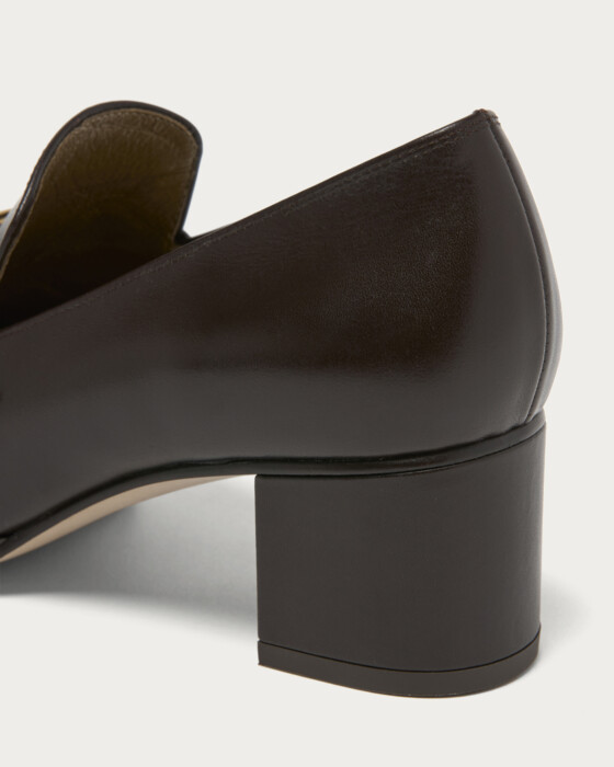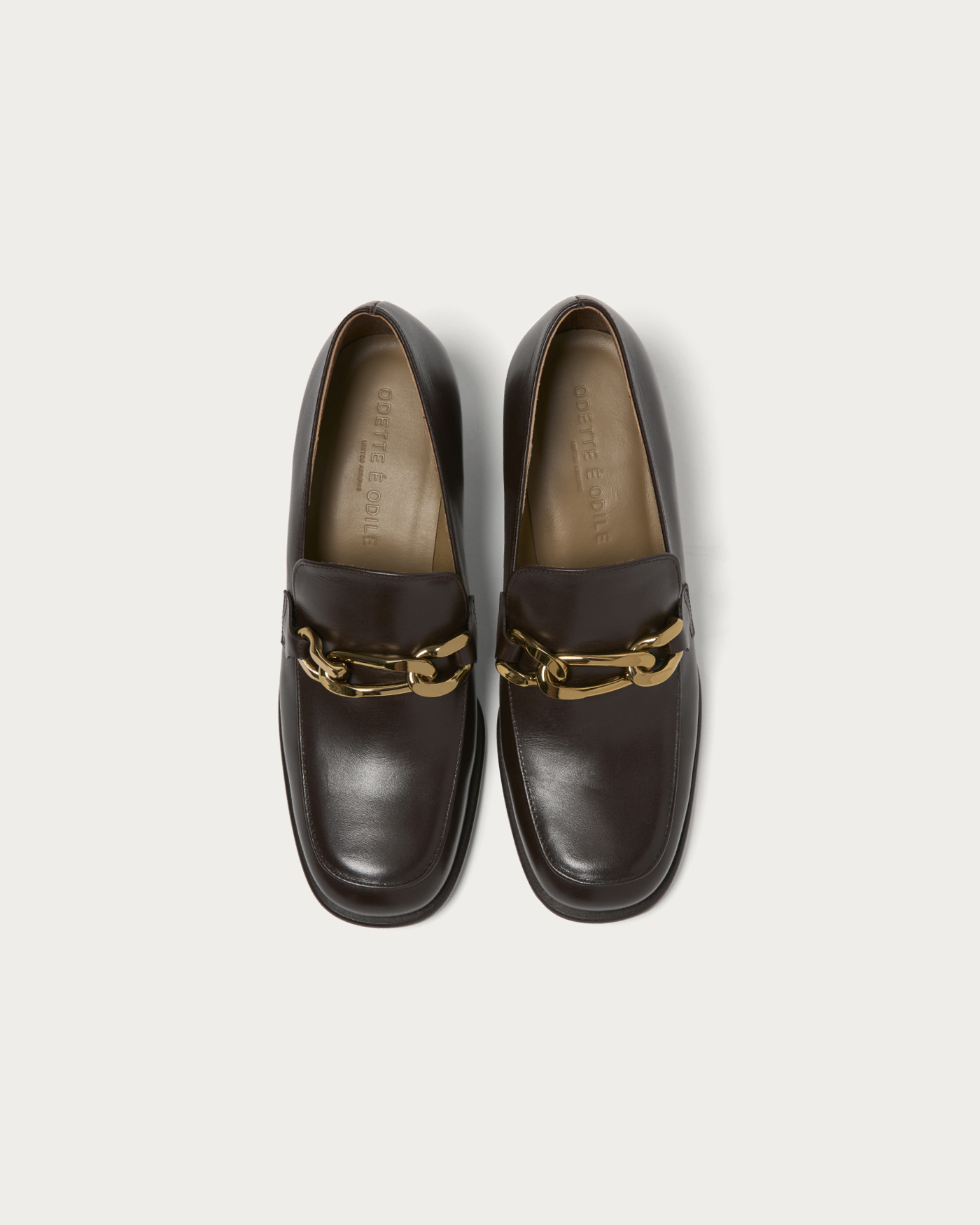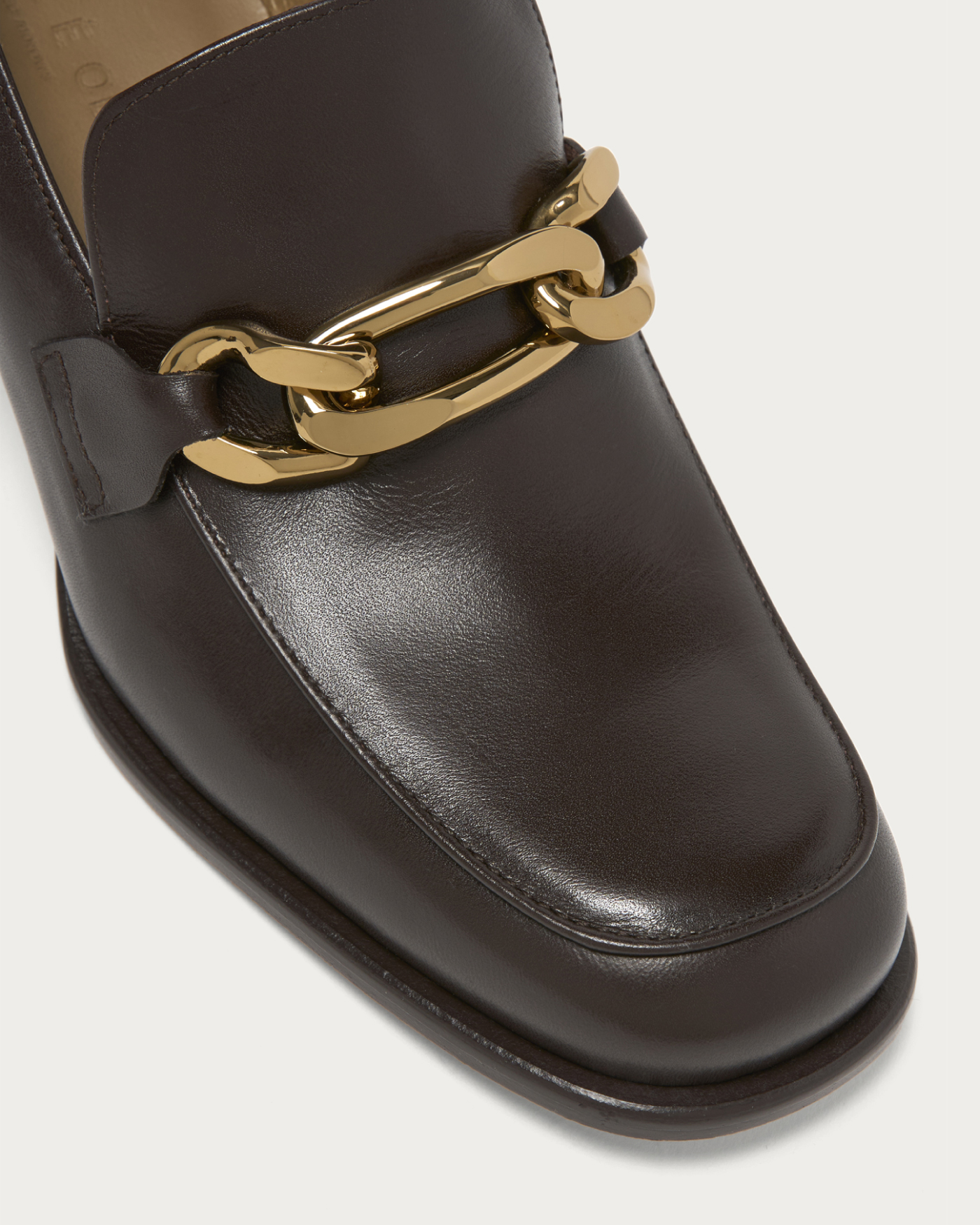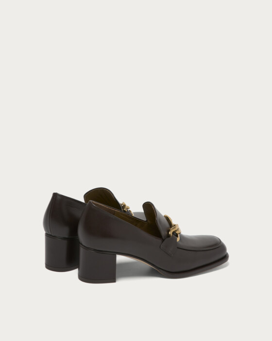 メタルチェーンが存在感を放つモダンローファー。厚みをもたせたラウンドスクエア木型が安定感と今っぽさを両立させ、55mmのヒールアップで脚長効果も。ブラックやブラウンなど落ち着いたカラーと合わせて、タートルニットやジャケットを合わせた冬コートスタイルにも映える一足です。