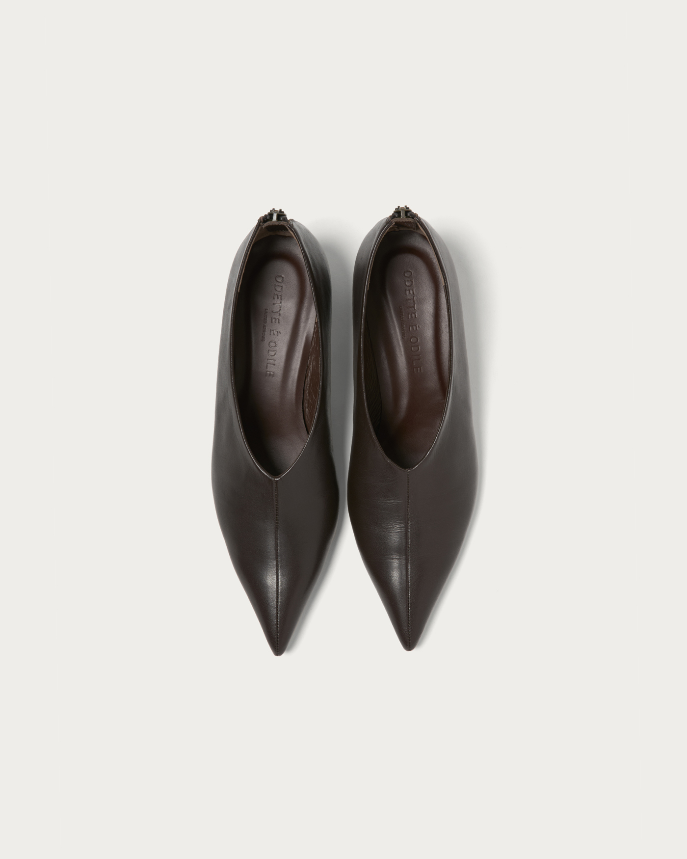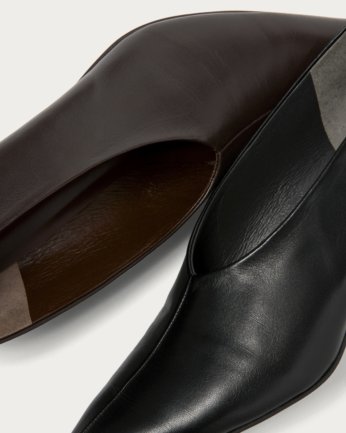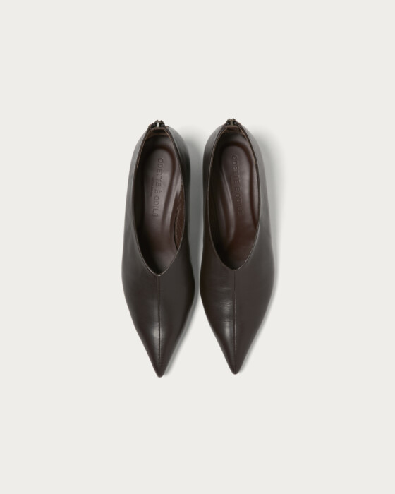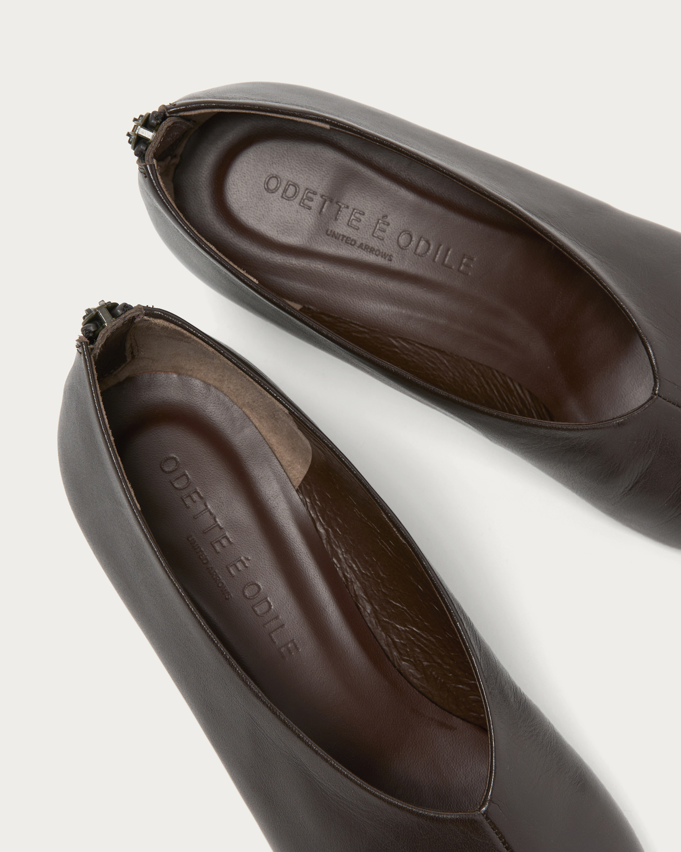 深めの甲が足を包み込むブーティータイプ。ノーズを長めにとったポインテッド木型が足のラインを美しく見せ、後ろは着脱しやすいバックファスナー仕様に。スライダーは下がり防止のロック付きで安心感もプラス。ワイドパンツのボリューム感とも好バランスで、モードな冬スタイルを引き締めてくれます。