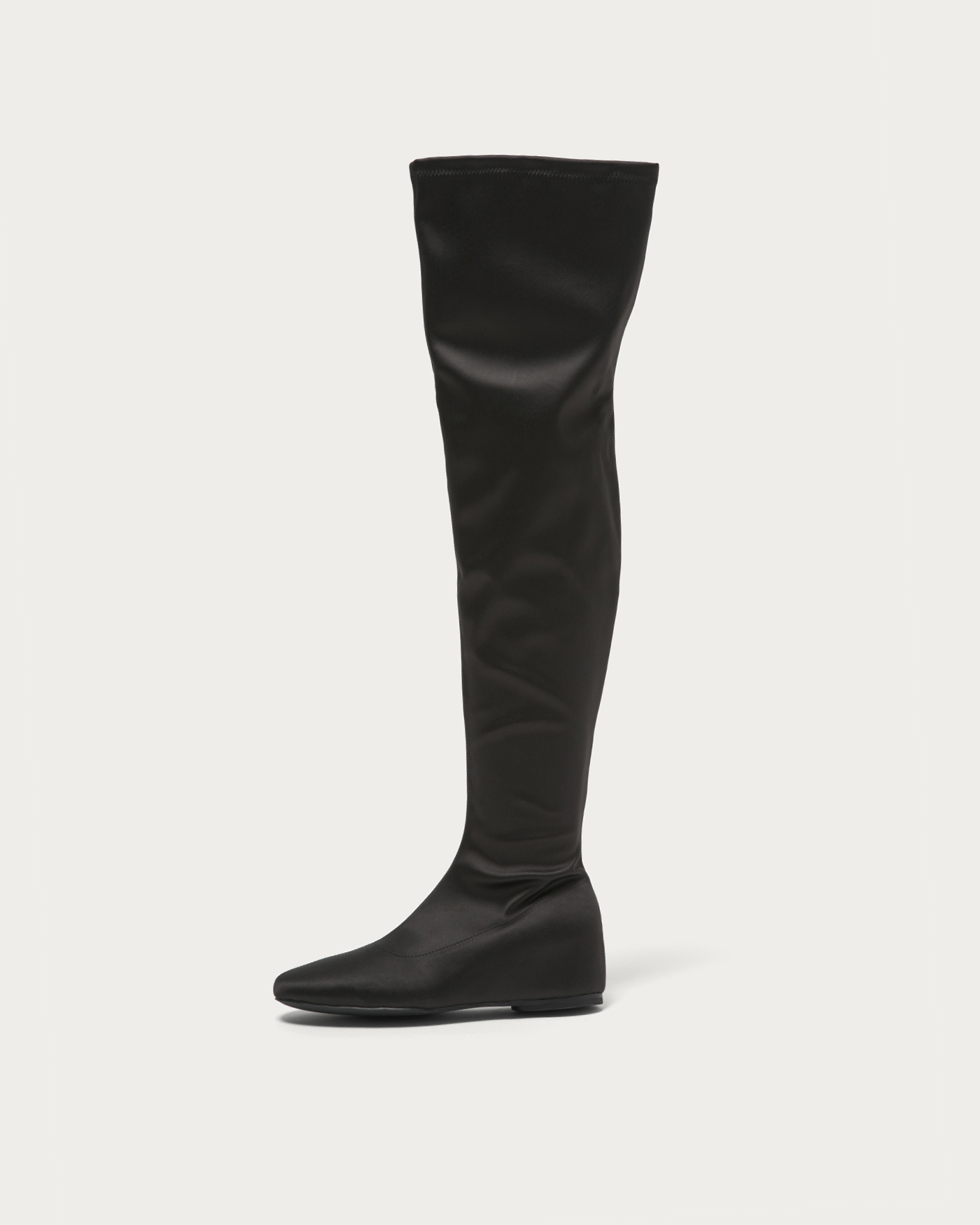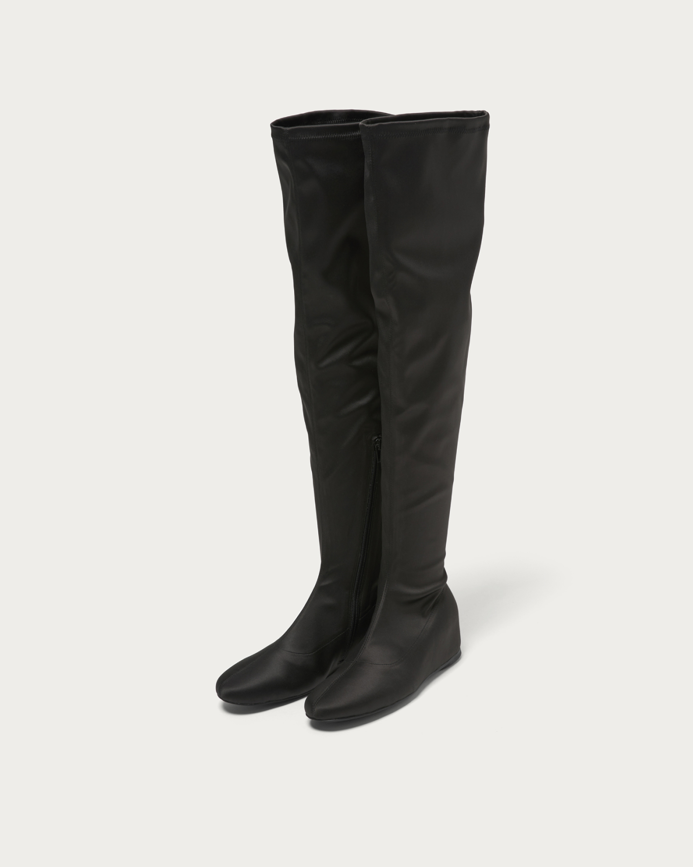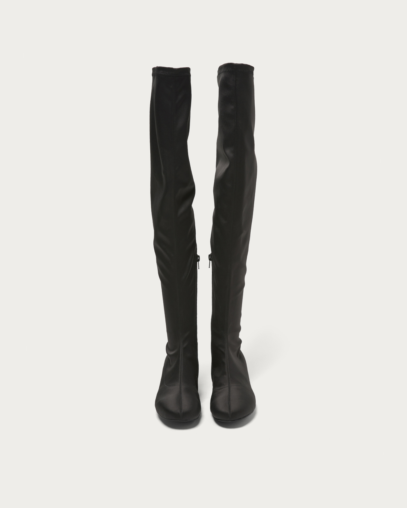脚に沿うストレッチ素材で仕立てたラウンドトゥのニーハイブーツ。3cmのインヒール入りでさりげなくスタイルアップも叶えます。シンプルながらインパクトのあるデザインは、ショート丈のボトムスやワンピースと合わせて、コーディネートの主役に。