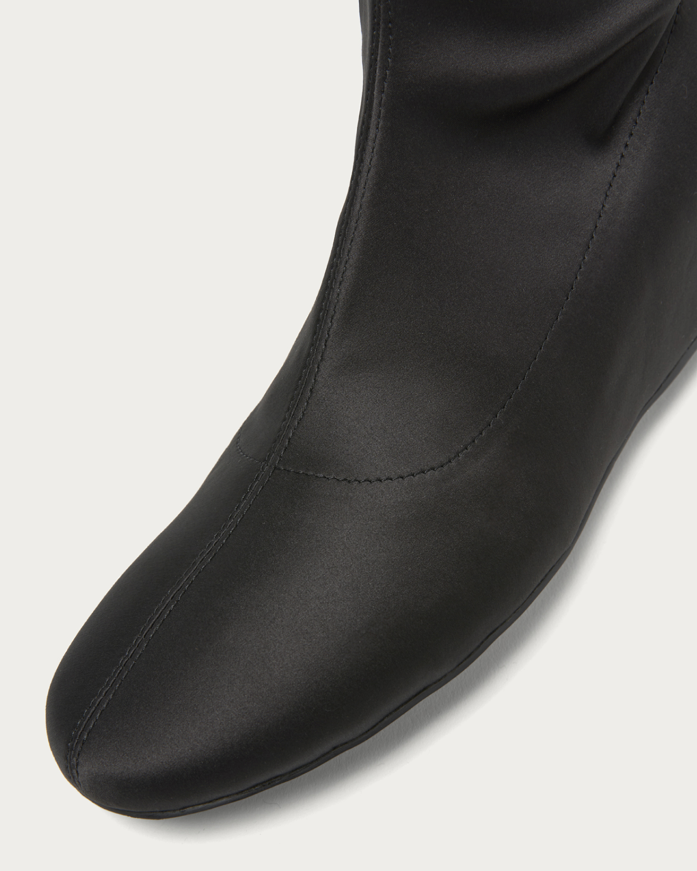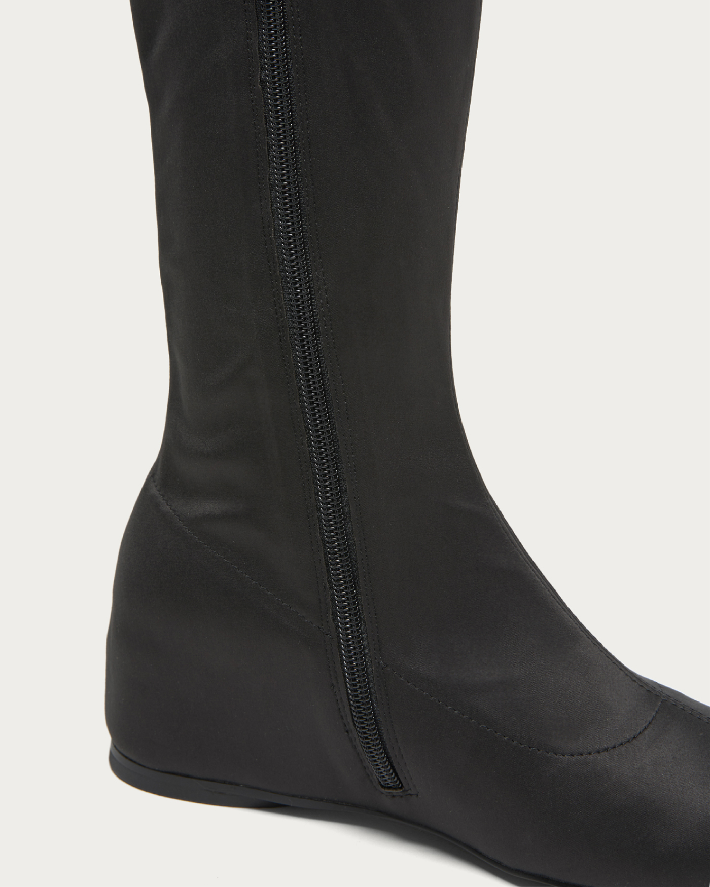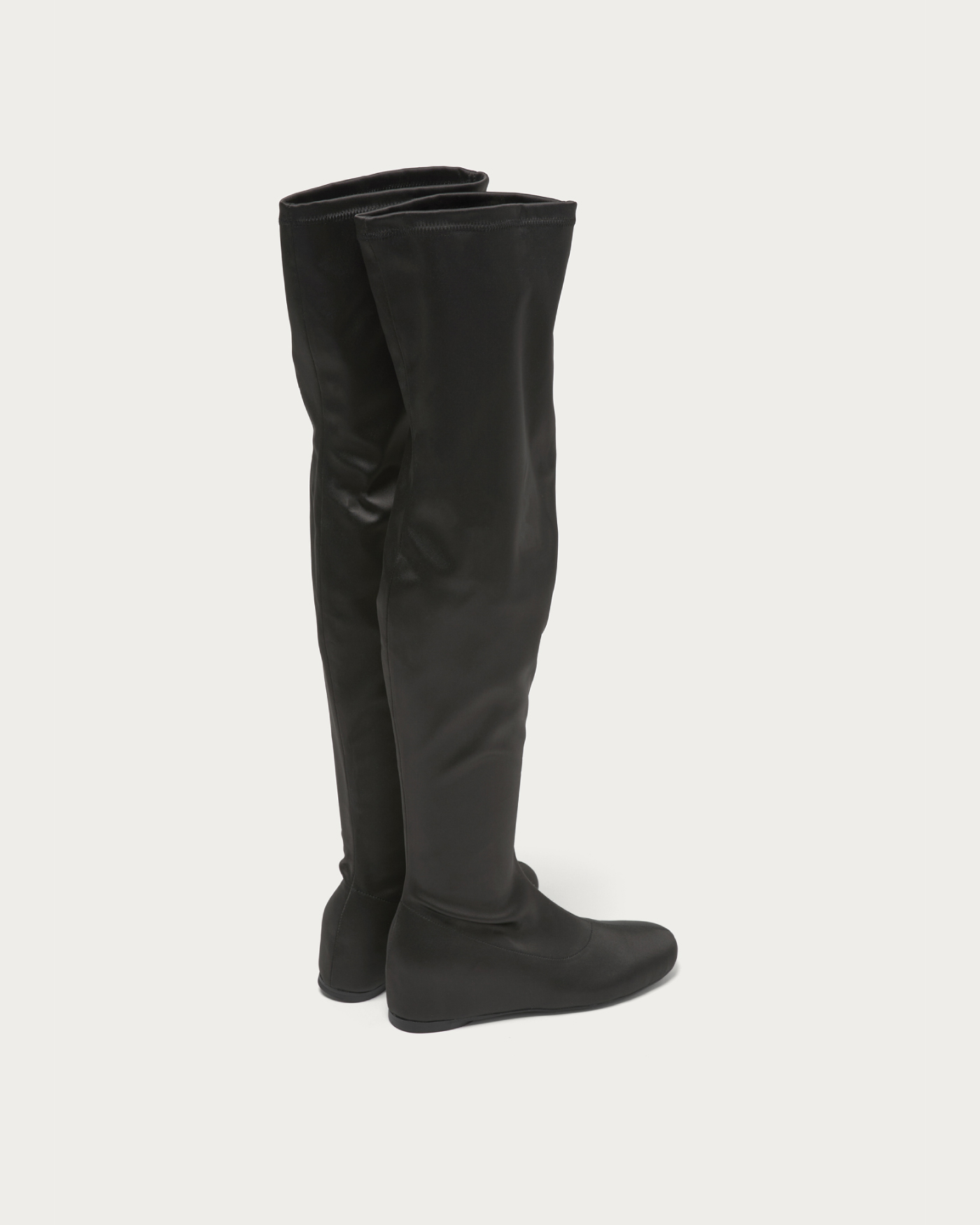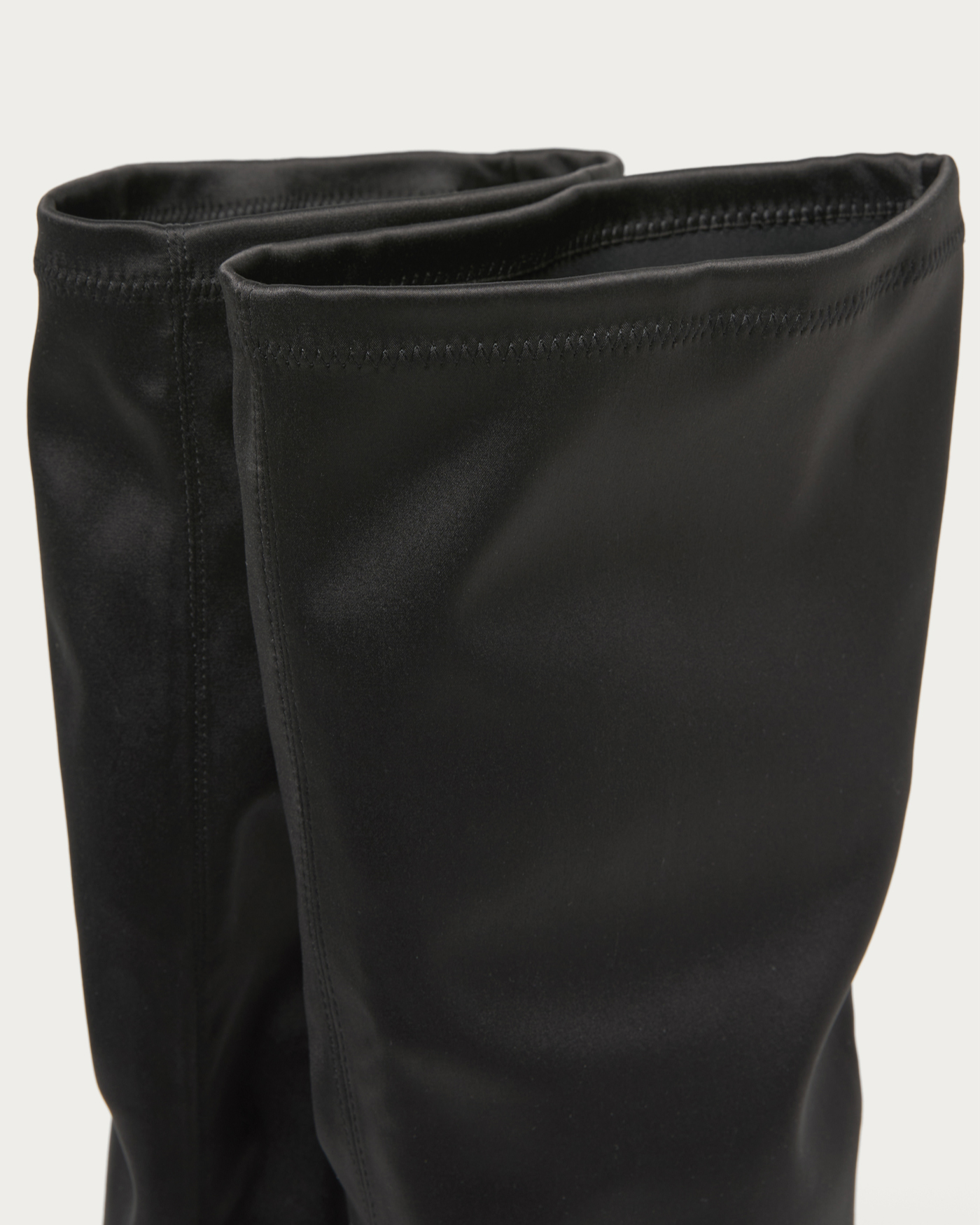 脚に沿うストレッチ素材で仕立てたラウンドトゥのニーハイブーツ。3cmのインヒール入りでさりげなくスタイルアップも叶えます。シンプルながらインパクトのあるデザインは、ショート丈のボトムスやワンピースと合わせて、コーディネートの主役に。