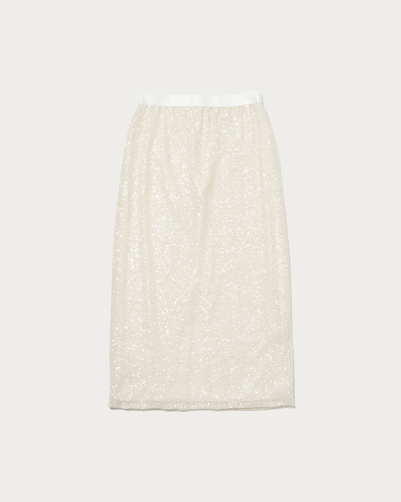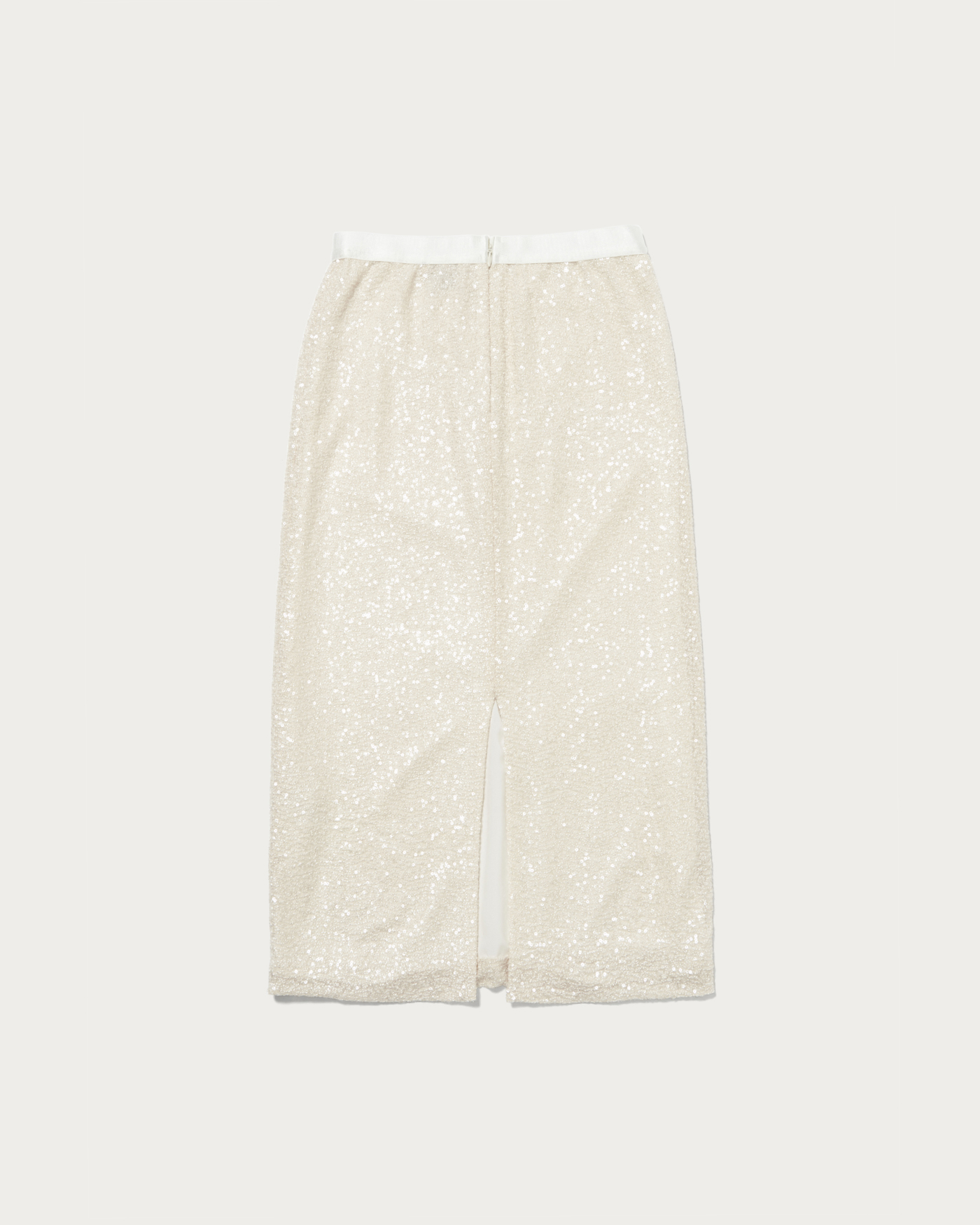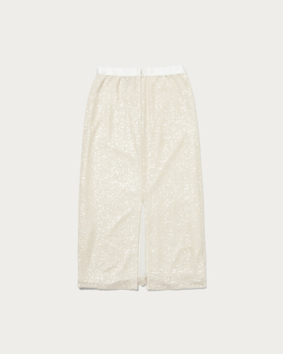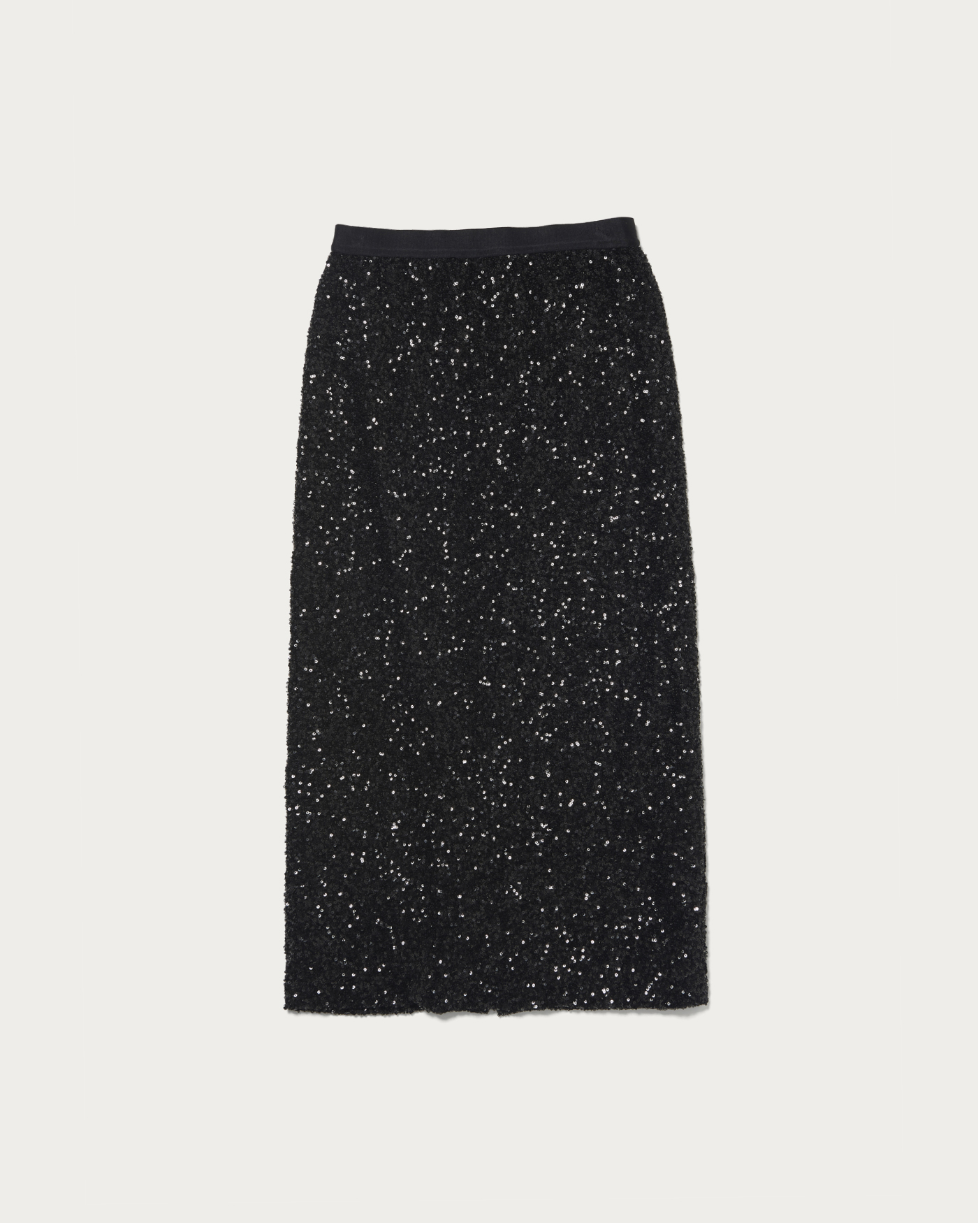 全体に施されたスパンコールが印象的なタイトスカート。一見遠目から見るとシンプルなIラインのスカートですが、ジャージベースの生地にスパンコールが施され、ラグジュアリー感溢れる一着は取り入れるだけで旬なスタイリングに。ウエストはゴムなので楽に着用できるのも嬉しいポイントです。