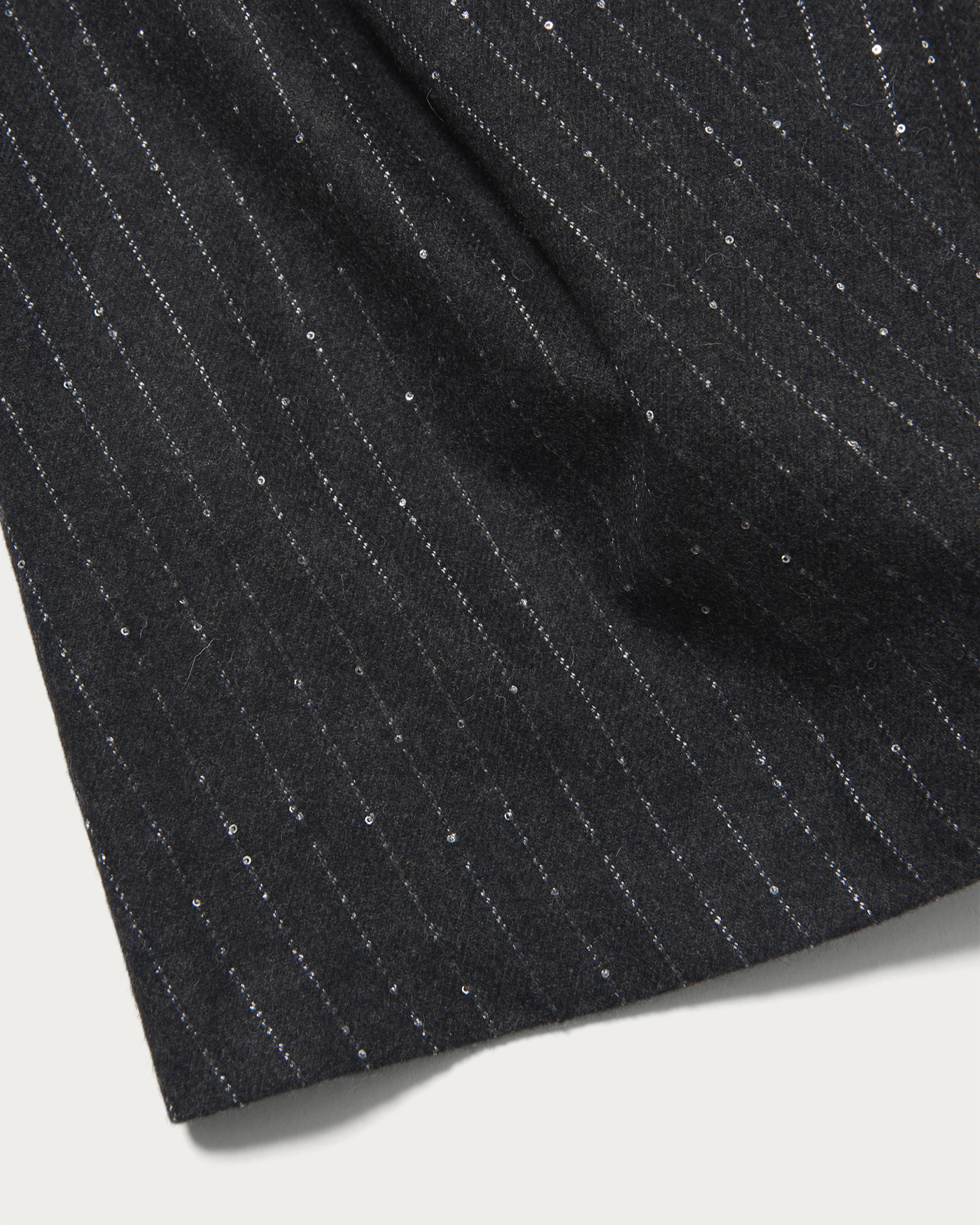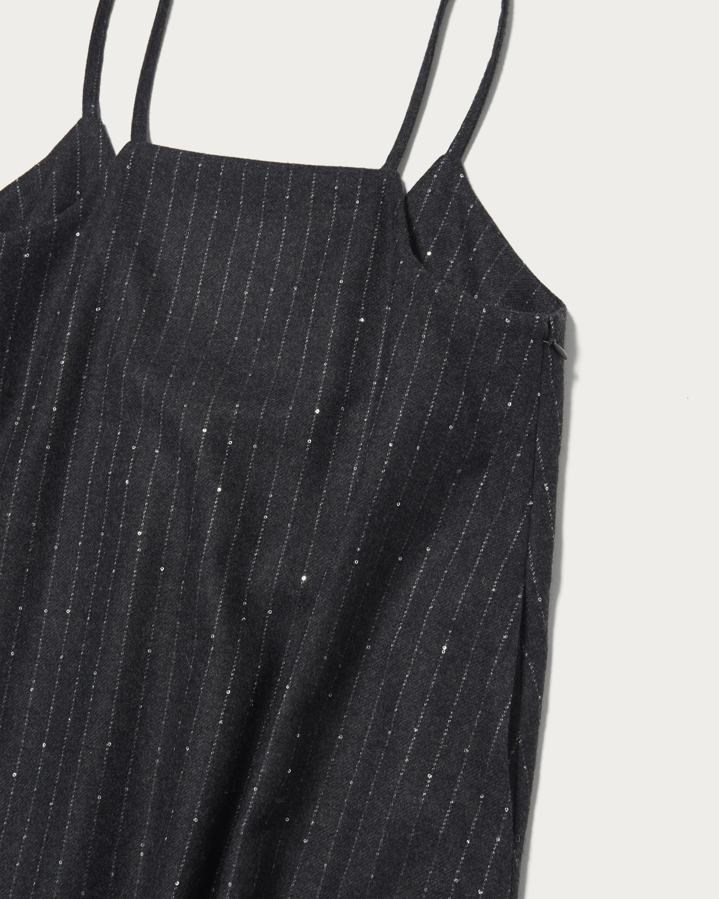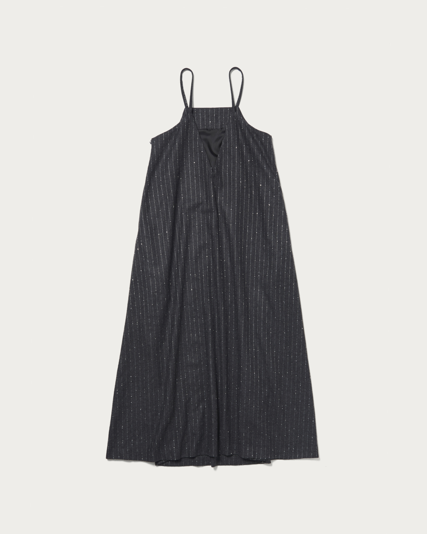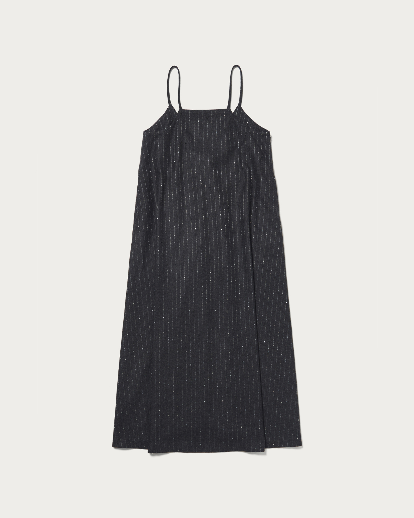 異なる表情が楽しめる2WAYキャミソールワンピース。ストライプ部分にスパンコール糸を使用し、上品でさりげない輝きを放つエレガントな雰囲気の一着。脇から緩やかに広がるAラインシルエットに加えて、ストレートな上端のアメリカンスリーブ風デザインと、やや深めのVネックラインを気分に合わせて着用可能です。