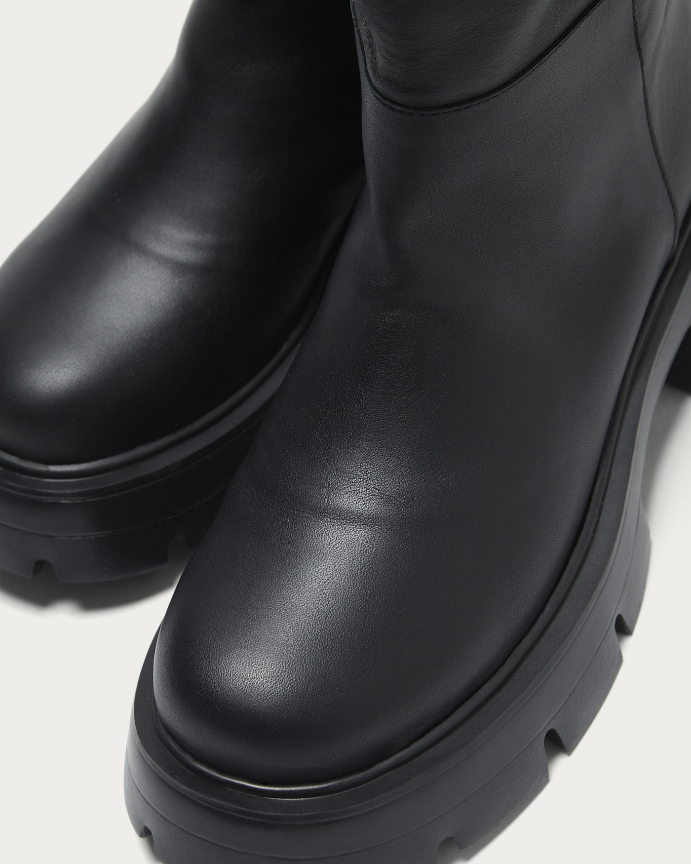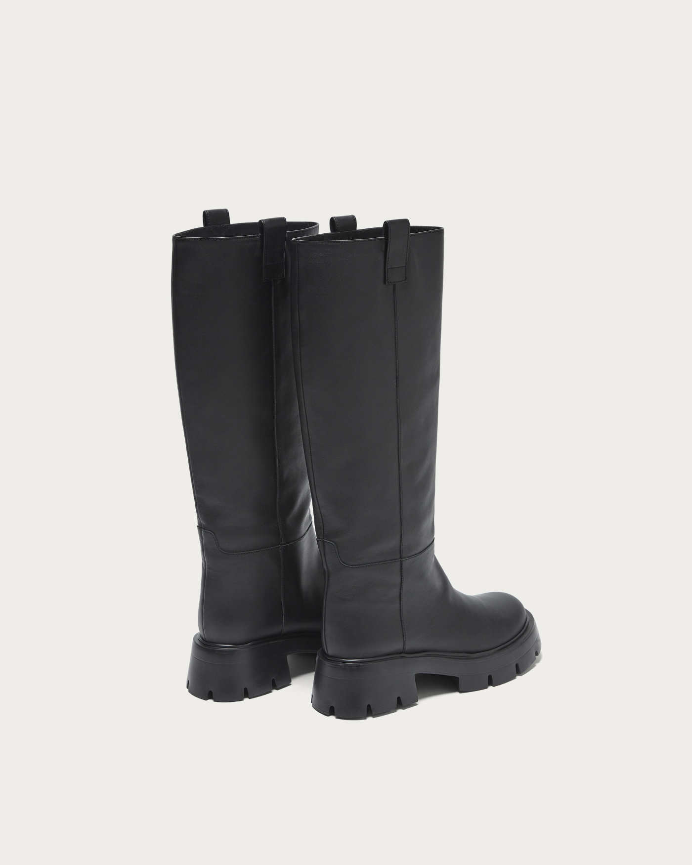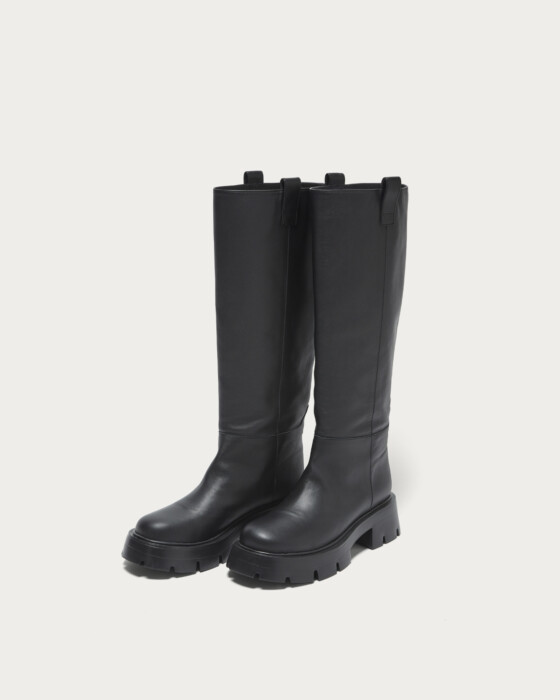 毎シーズン人気のボリュームのあるプラットロングブーツがさらに厚底にリニューアルして登場。トレンド感がありつつも上質な素材を使用し、エレガントな雰囲気に。履きやすい柔らかさも魅力です。足元にボリュームをプラスすることで、ロングコートやスカートのスタイルもバランスよく完成。筒にボトムスを入れて履くのもおすすめです。
