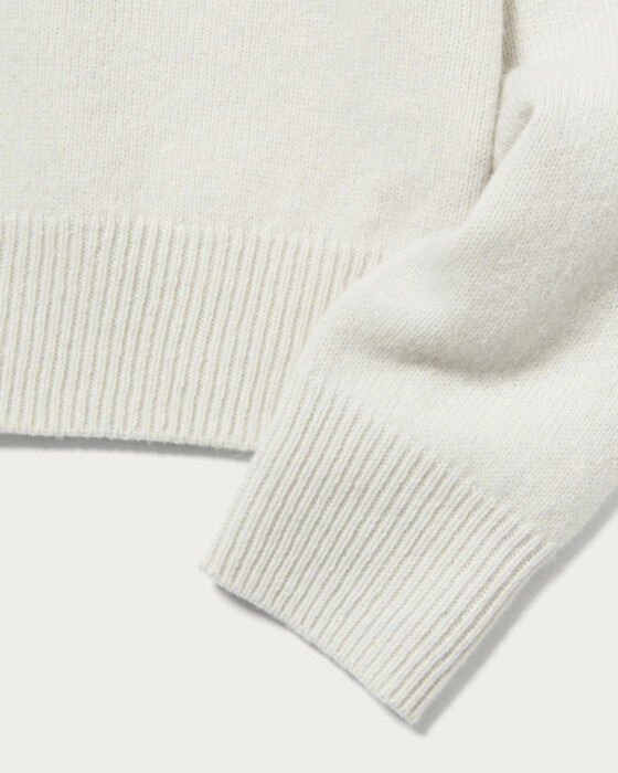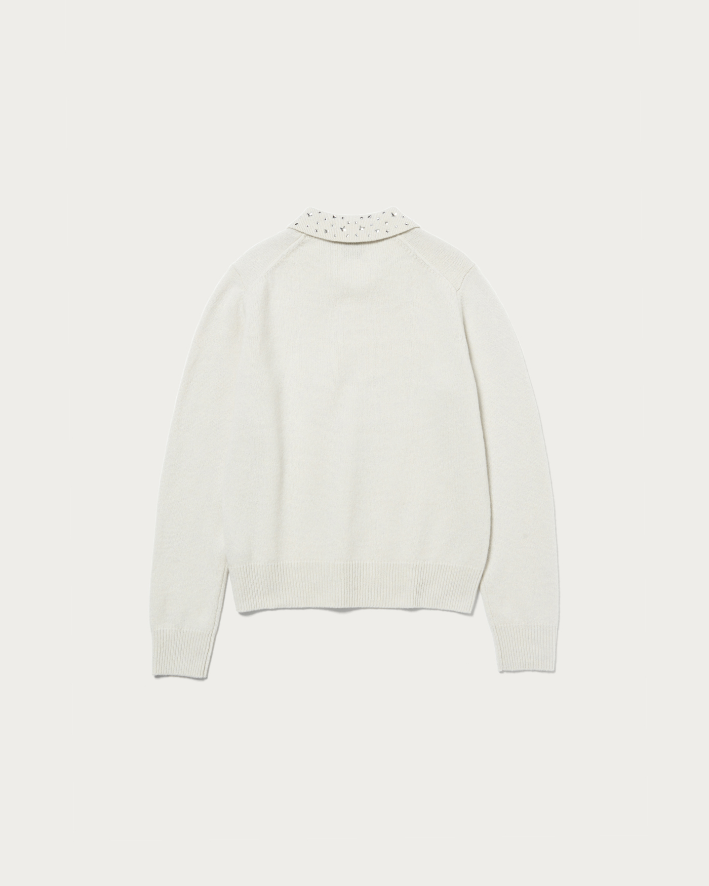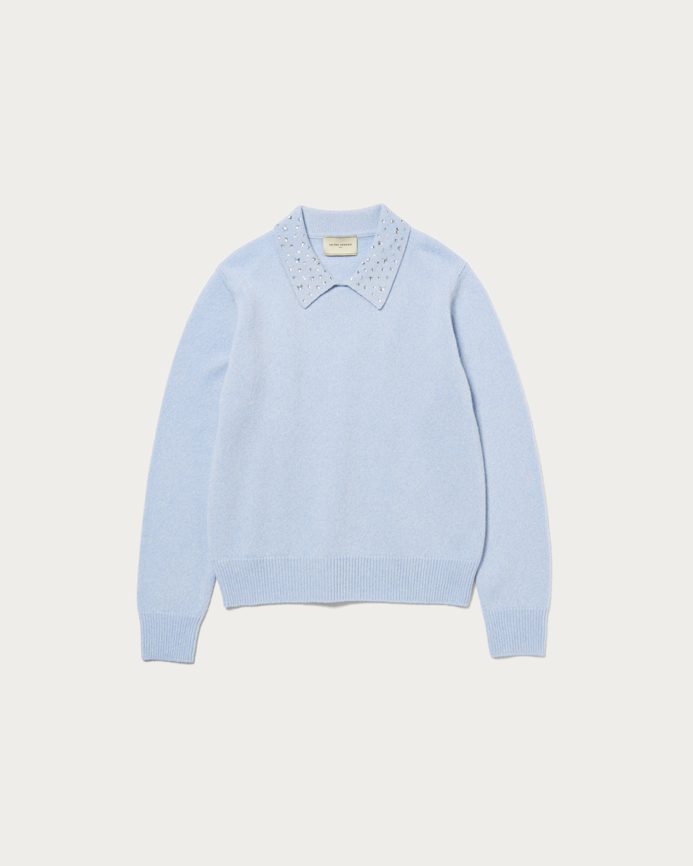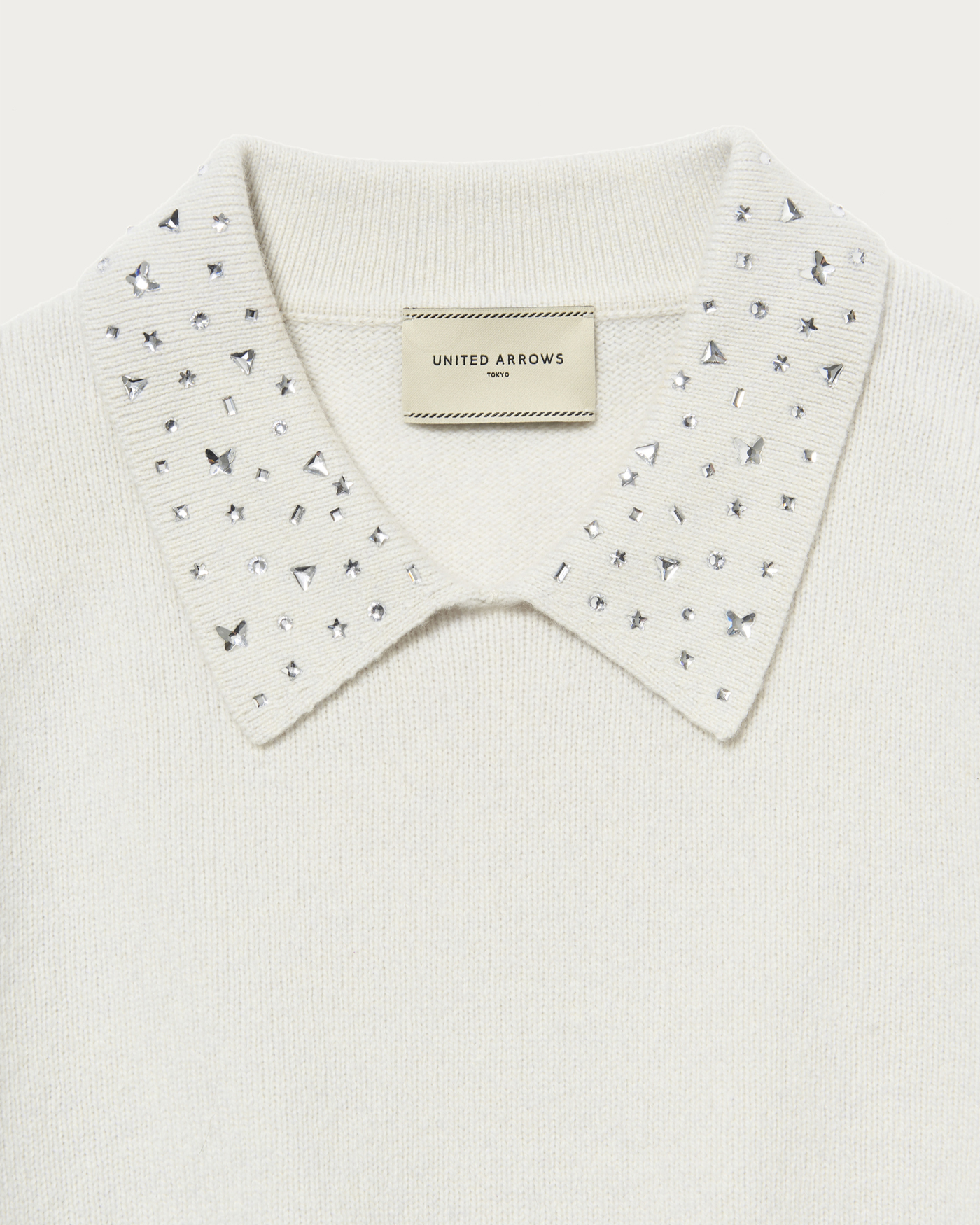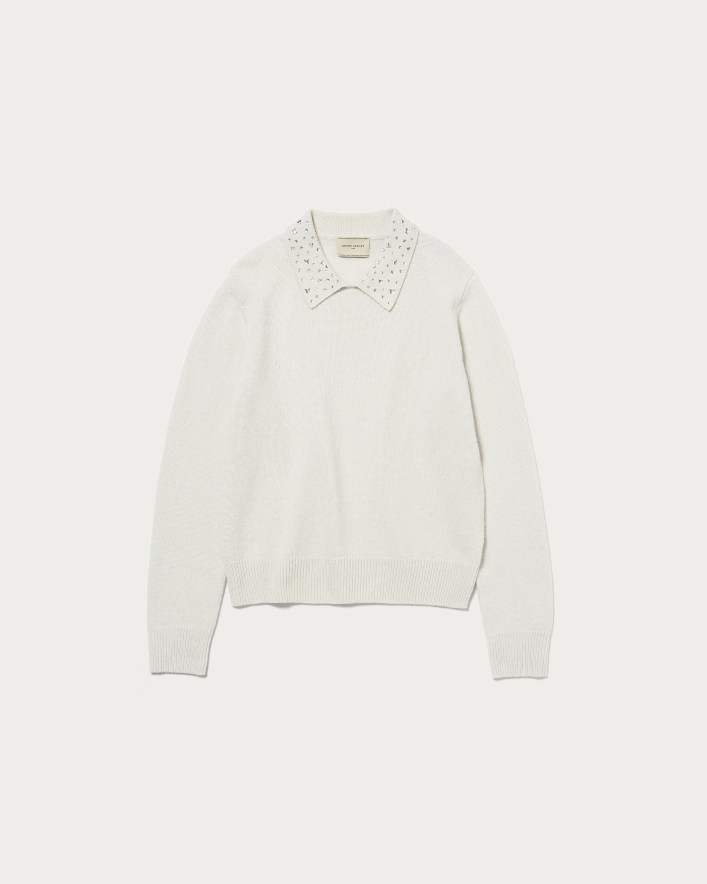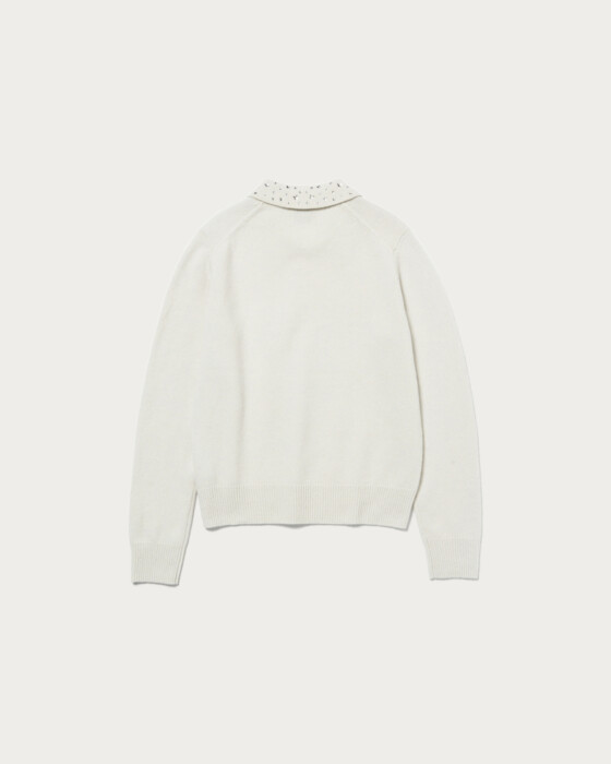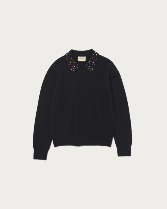 襟部分にいろいろな形の装飾をちりばめたニット。程よくゆとりのあるベーシックなボディに華やかなアクセントがポイントの一着。ブラックのみマルチカラーの装飾がついています。ウールカシミヤのブレンド素材でふっくらとした風合いに、柔らかなで肌触りのいいニットです。
