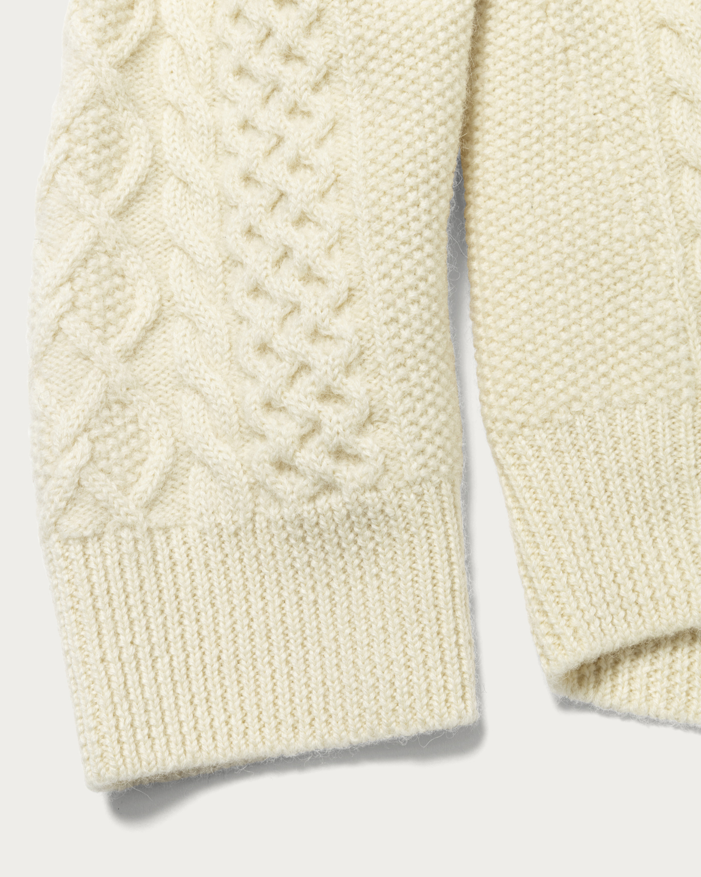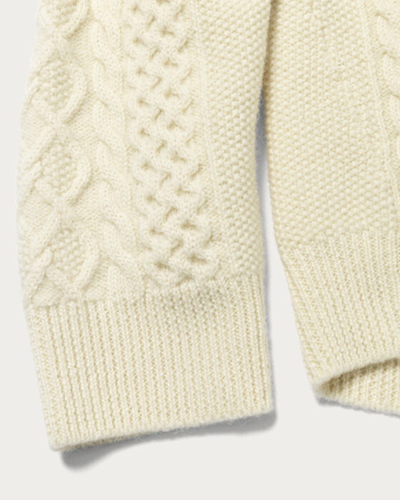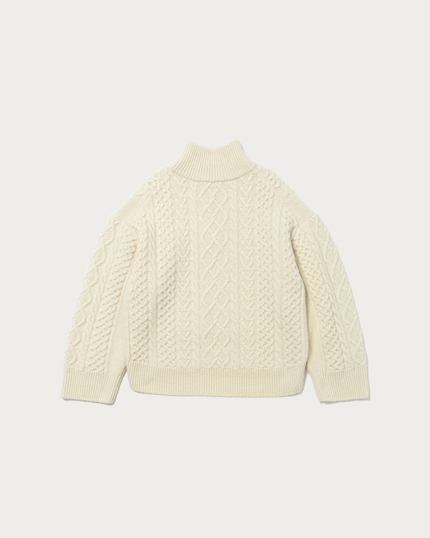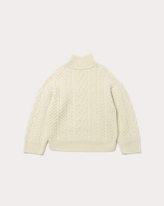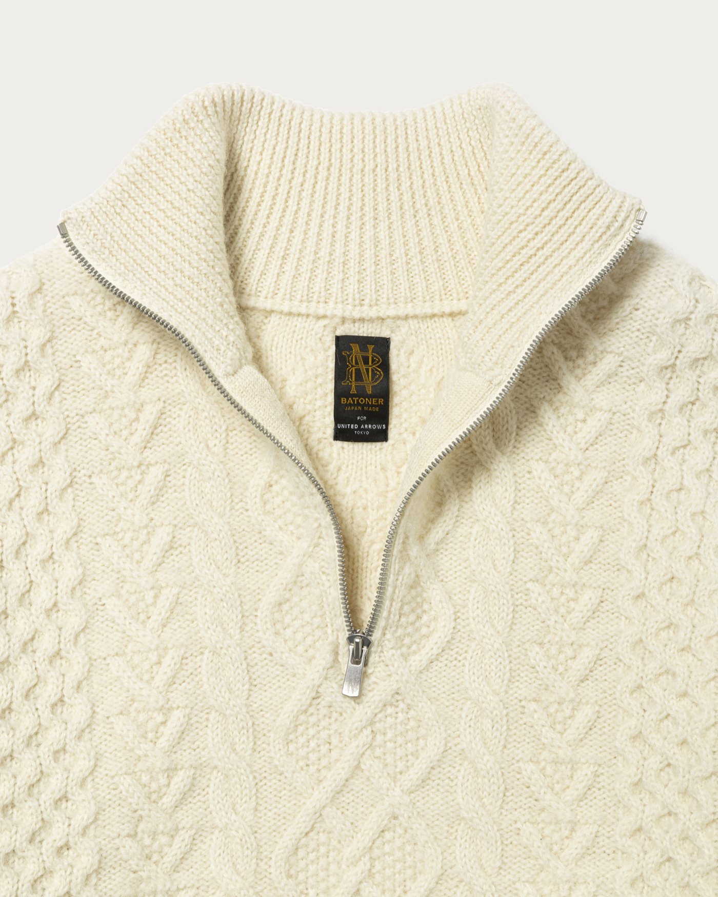 ニットの産地として知られる山形県で、2013年春夏から展開をスタートした奥山メリヤスのニットウェアブランド〈BATONER(バトナー)〉に別注したケーブルニット。ケーブル柄は過去に展開していたものに今のエッセンスをプラスし再構築しました。トレンドのハーフジップ型でゆったりとしたサイズ感、ややボリュームを持たせた袖に仕上げフェミニンなシルエットにこだわった一着です。