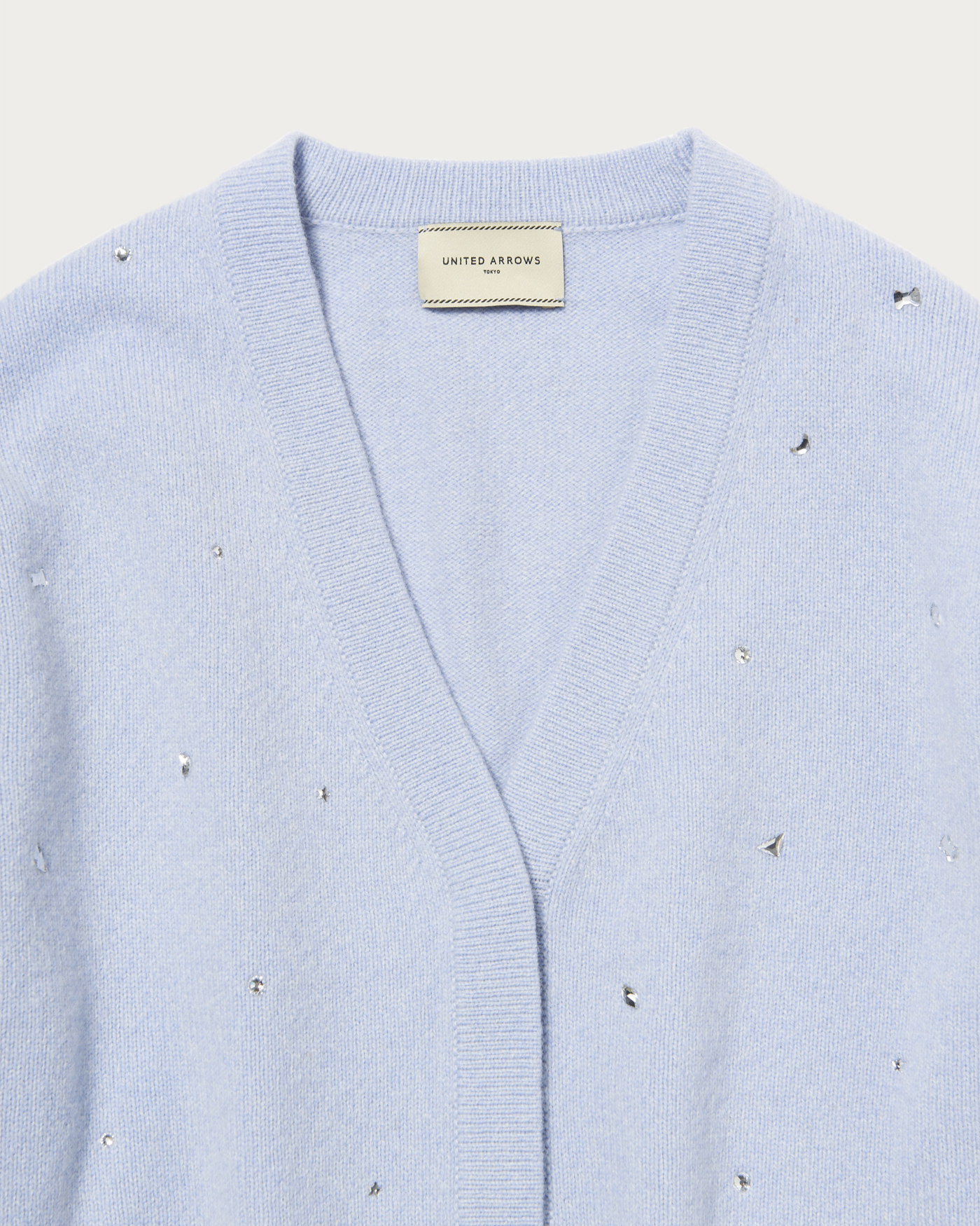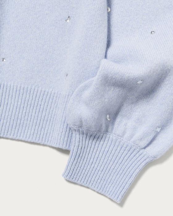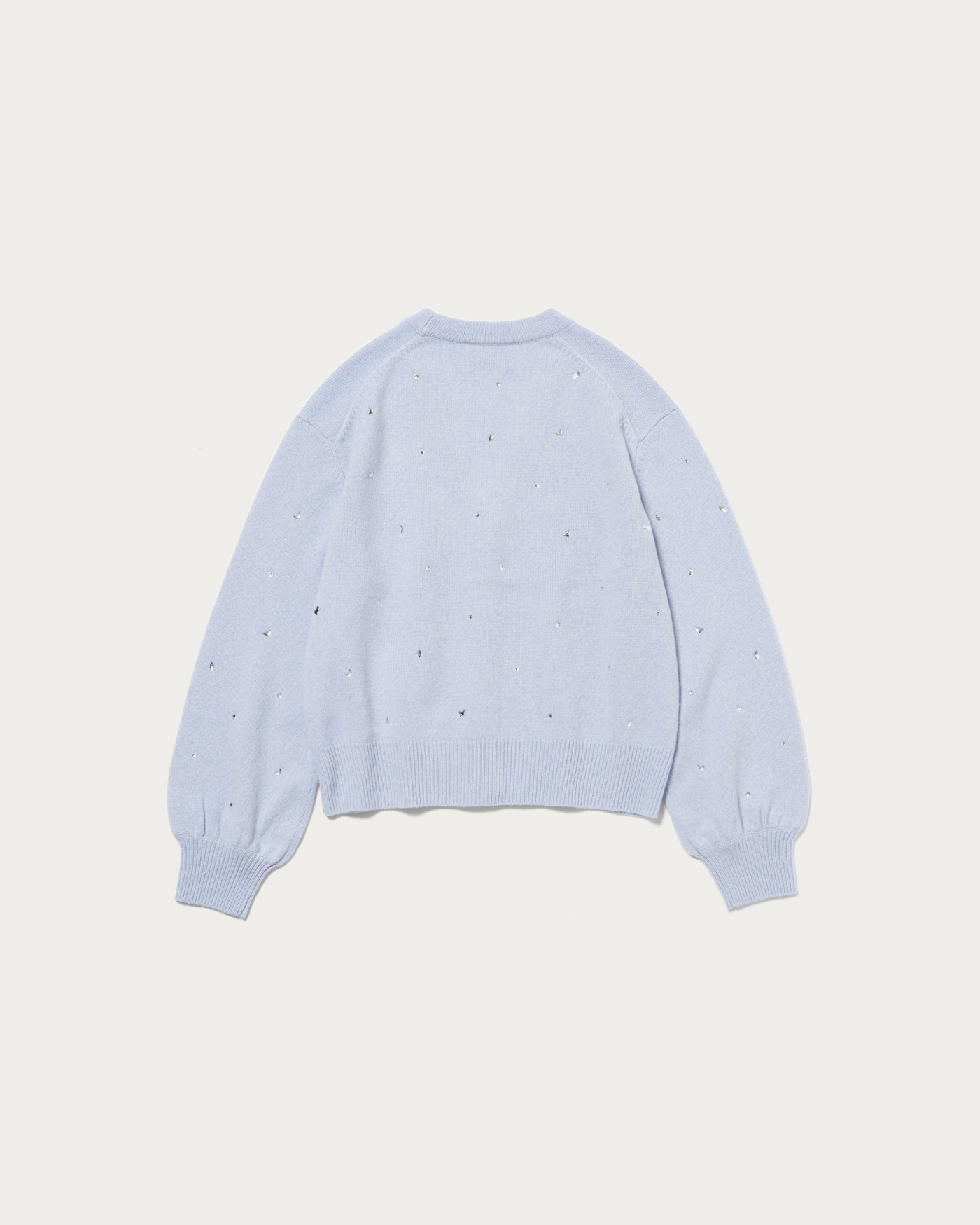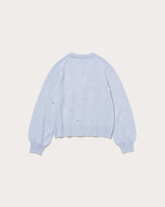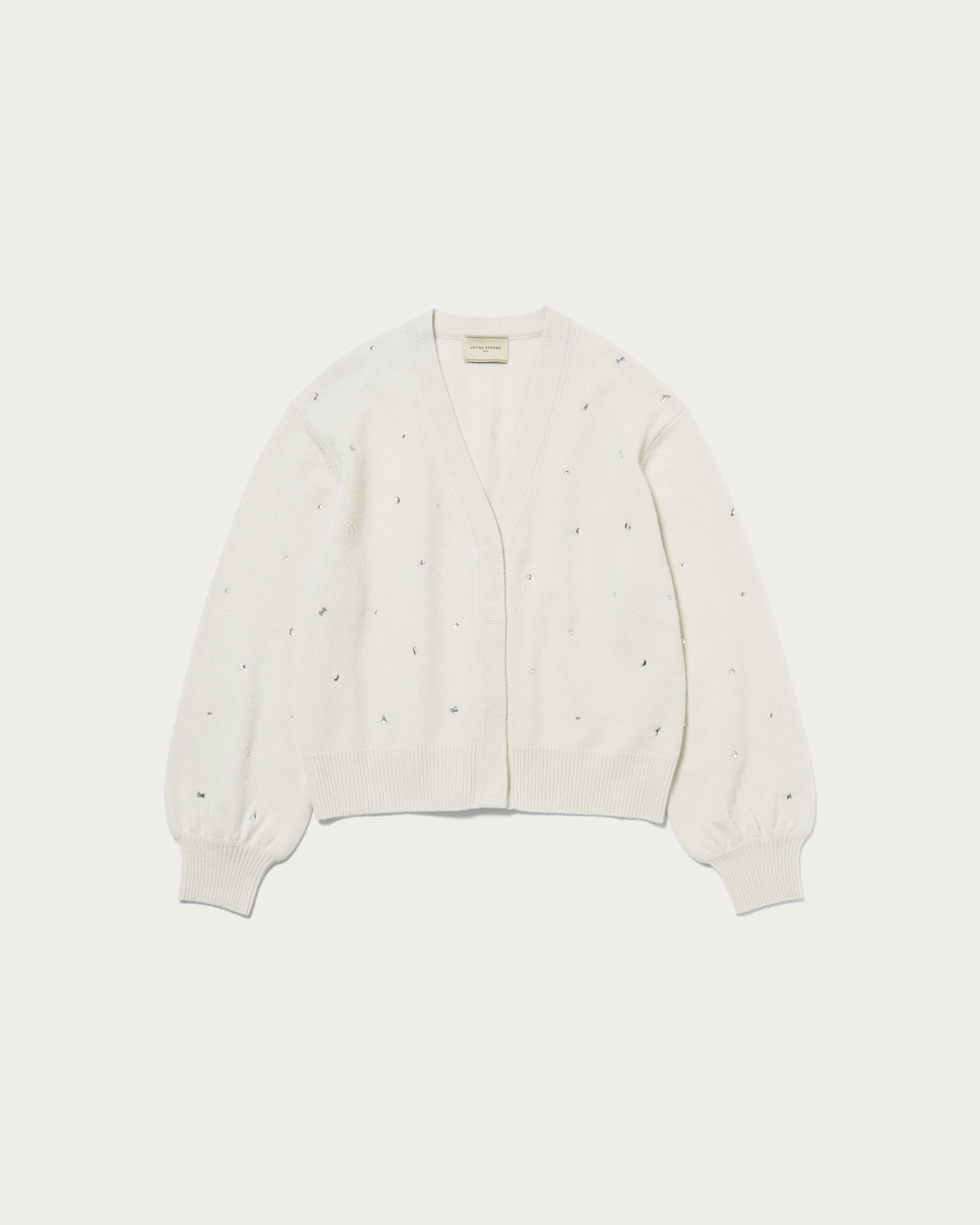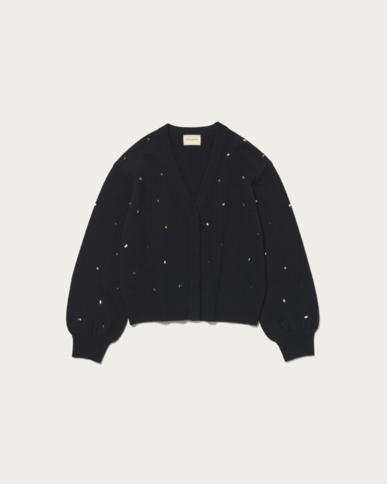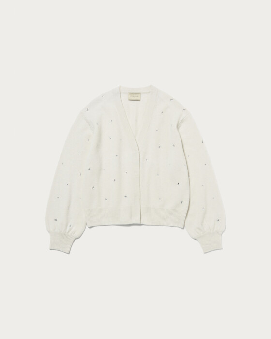 全体にいろいろな形の装飾を散りばめたカーディガン。ウール/カシミヤのブレンド素材でふっくらとした風合いに、柔らかで肌触りのいい一着。カーディガンは、ウエスト周りがもたつかないすっきりとした短めの着丈で太めのパンツやボリュームのあるスカートと相性よく着用していただけます。