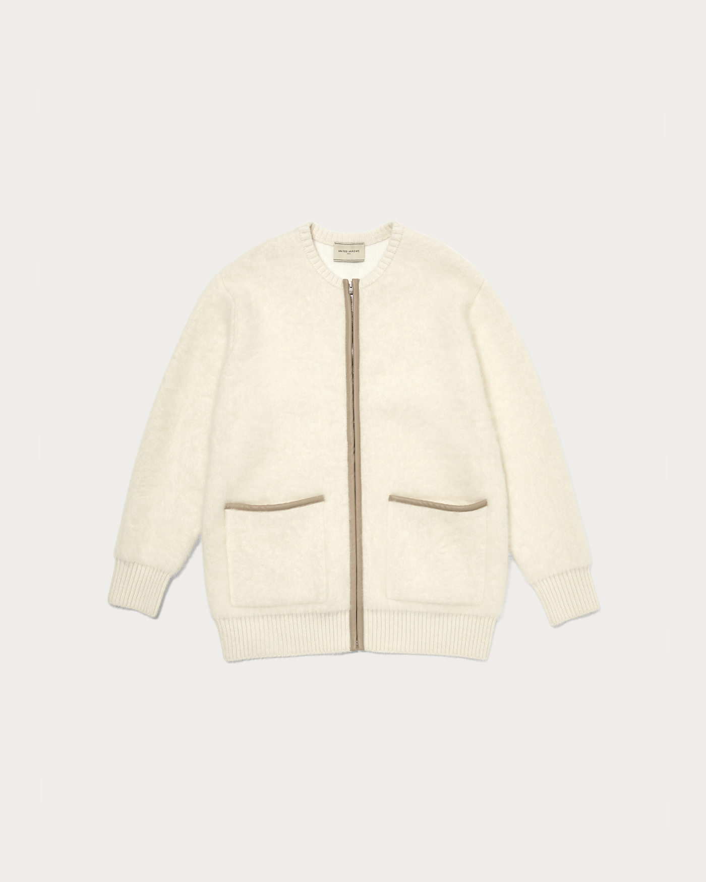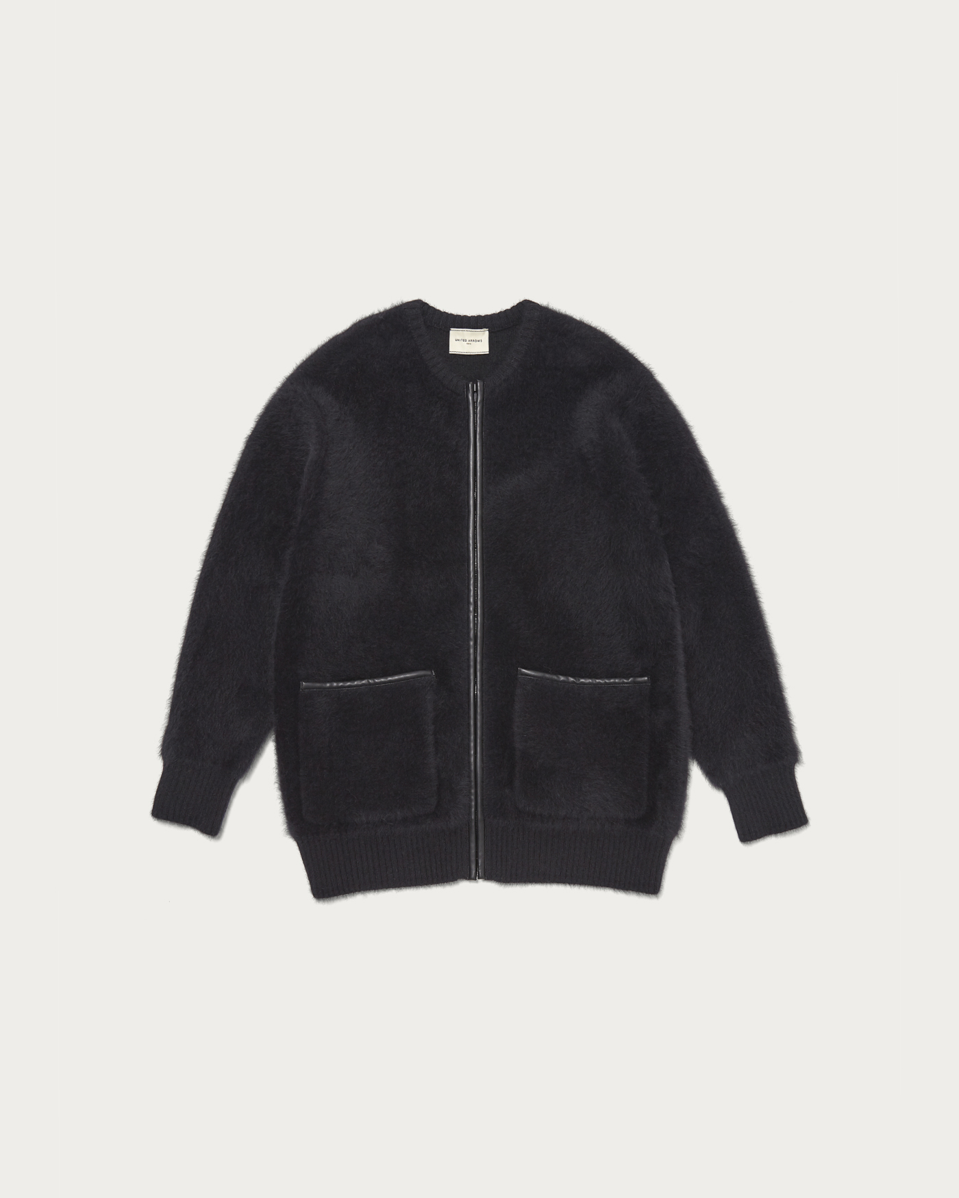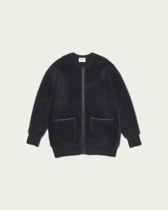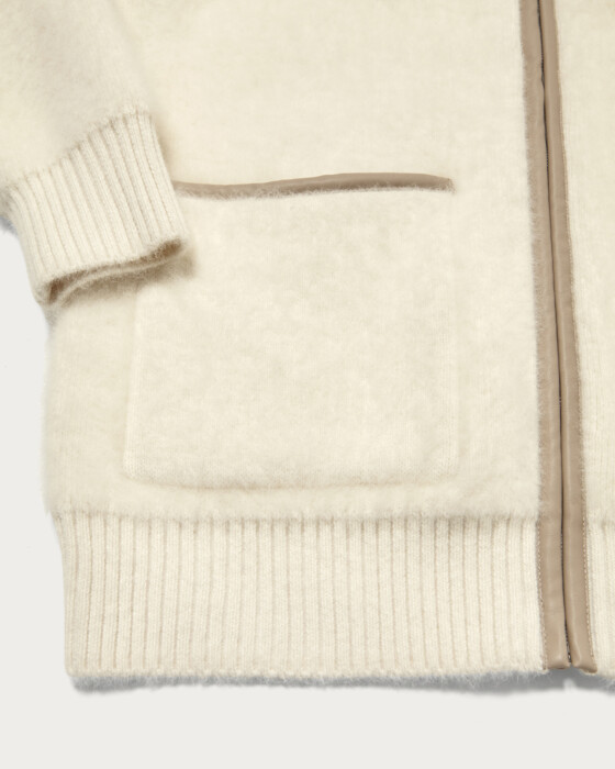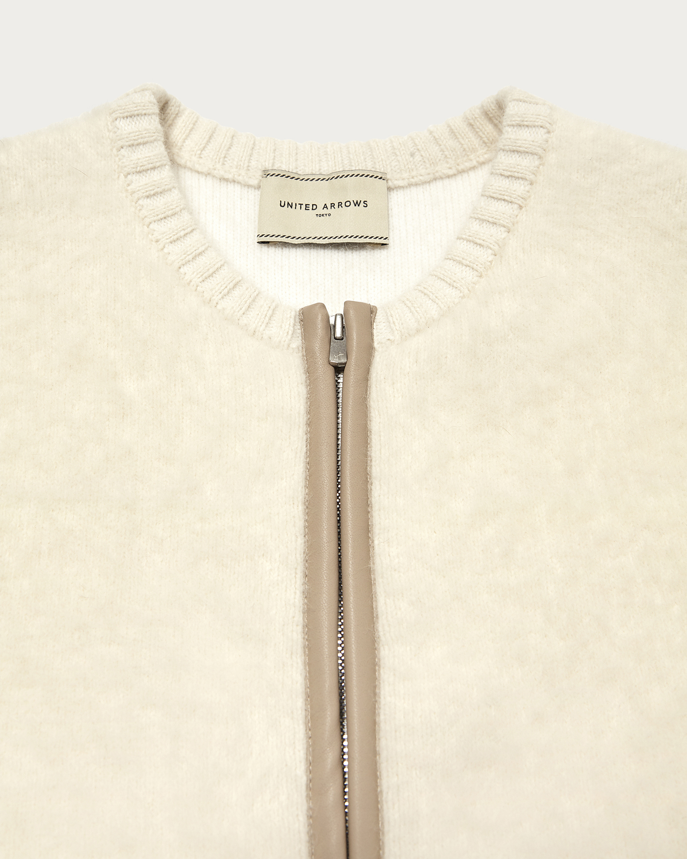 毎シーズンご好評いただいているフォックスカシミヤシリーズよりアウター見えする異素材コンビのニット羽織りが登場。贅沢な毛足に艶と光沢のあるリッチ感が最大の特徴です。とにかく滑らかで肌触りがよく、そして軽くてあたたかい。すっきりとしたファスナー開きで前中心とポケット口のレザー調トリムがアクセントに。程よい抜け感がありながらも品のある佇まいで、デイリーに寄り添う一着です。
