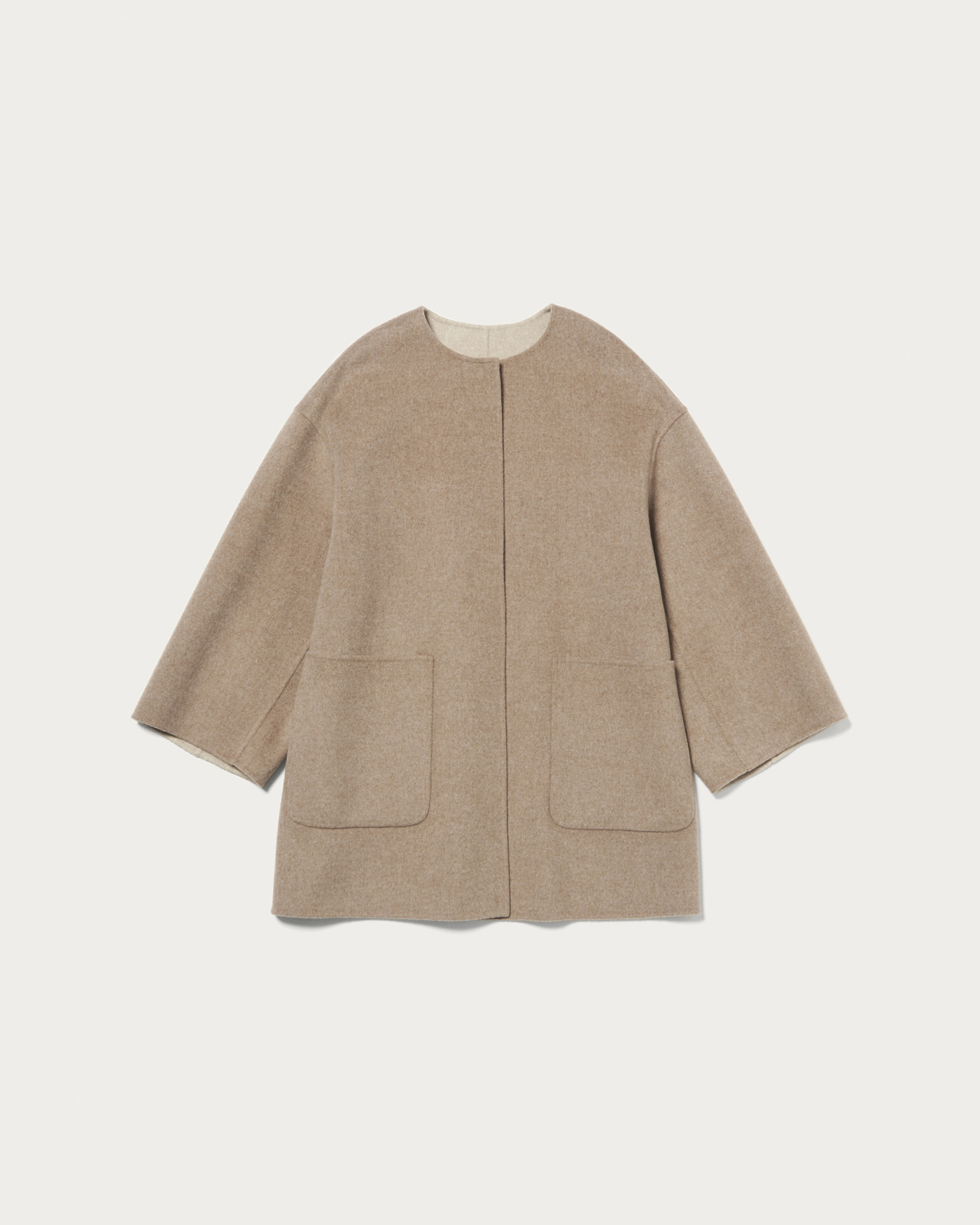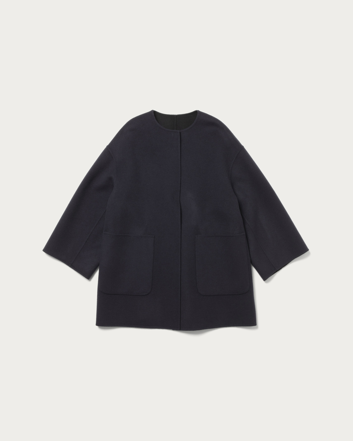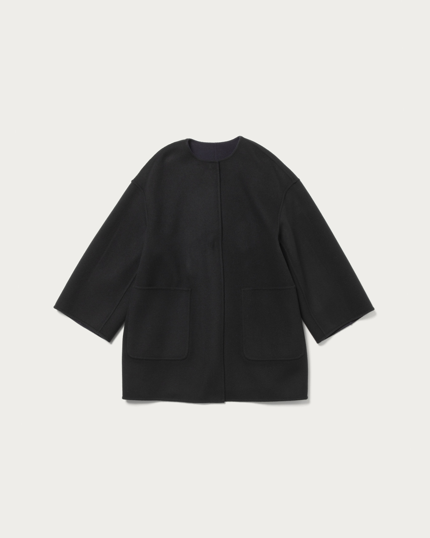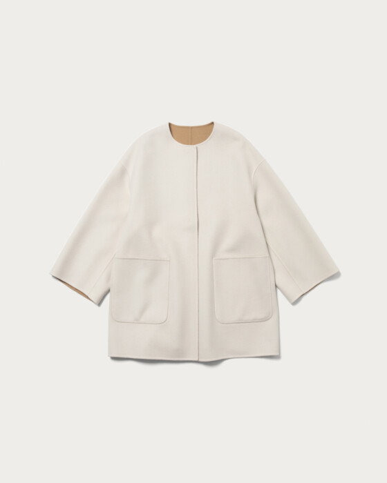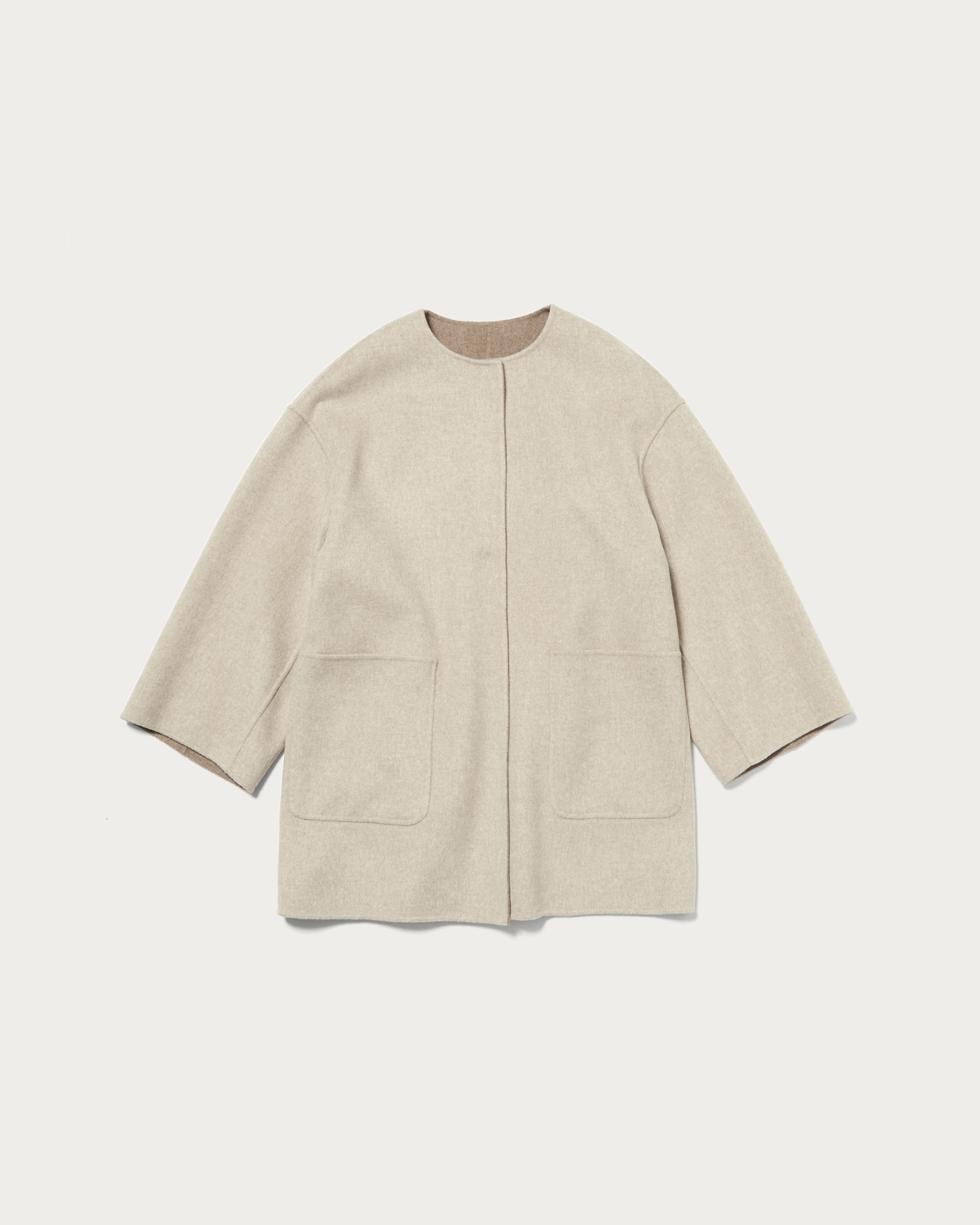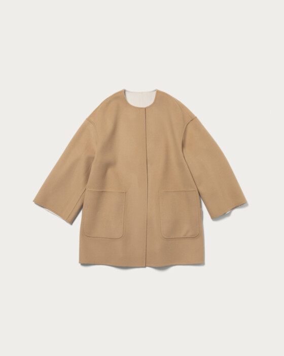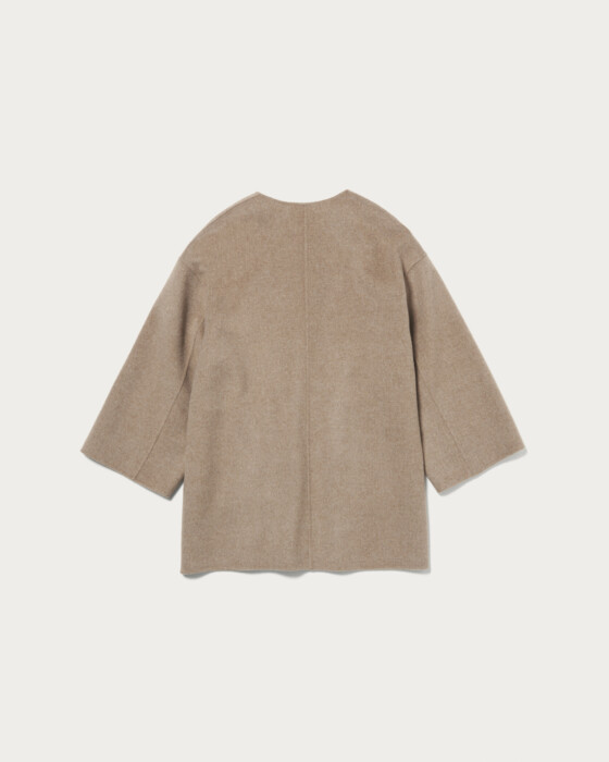 ストールを羽織っているかのように軽く、シーズン手前から着やすいミドル丈が魅力のノーカラーコートです。全体的にゆとりをもたせたAラインのシルエットで、裾の両サイドにベントを入れマント風に仕上げました。バストやアームホールにもゆとりがあるため、ボリュームニットも合わせやすくシーズンを長く楽しめます。