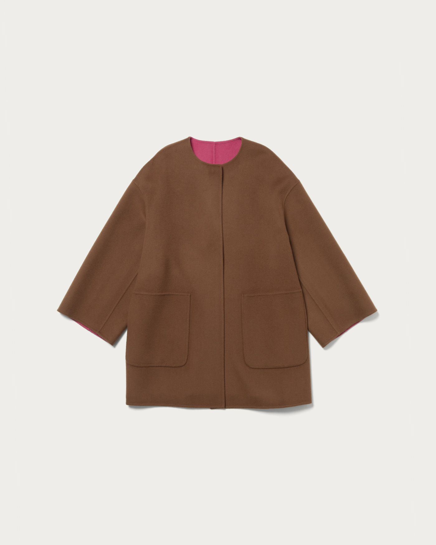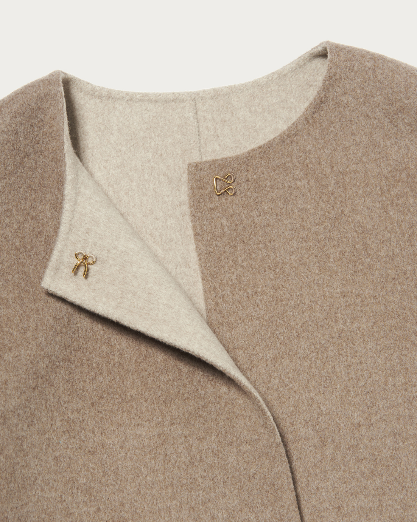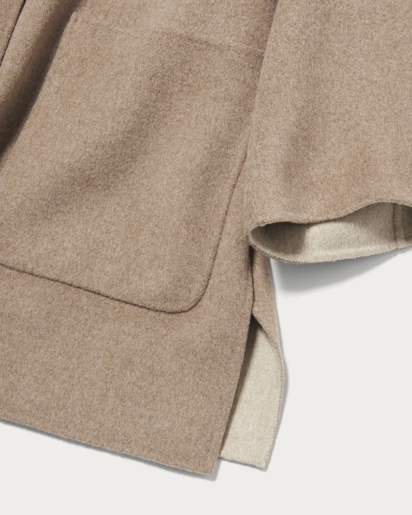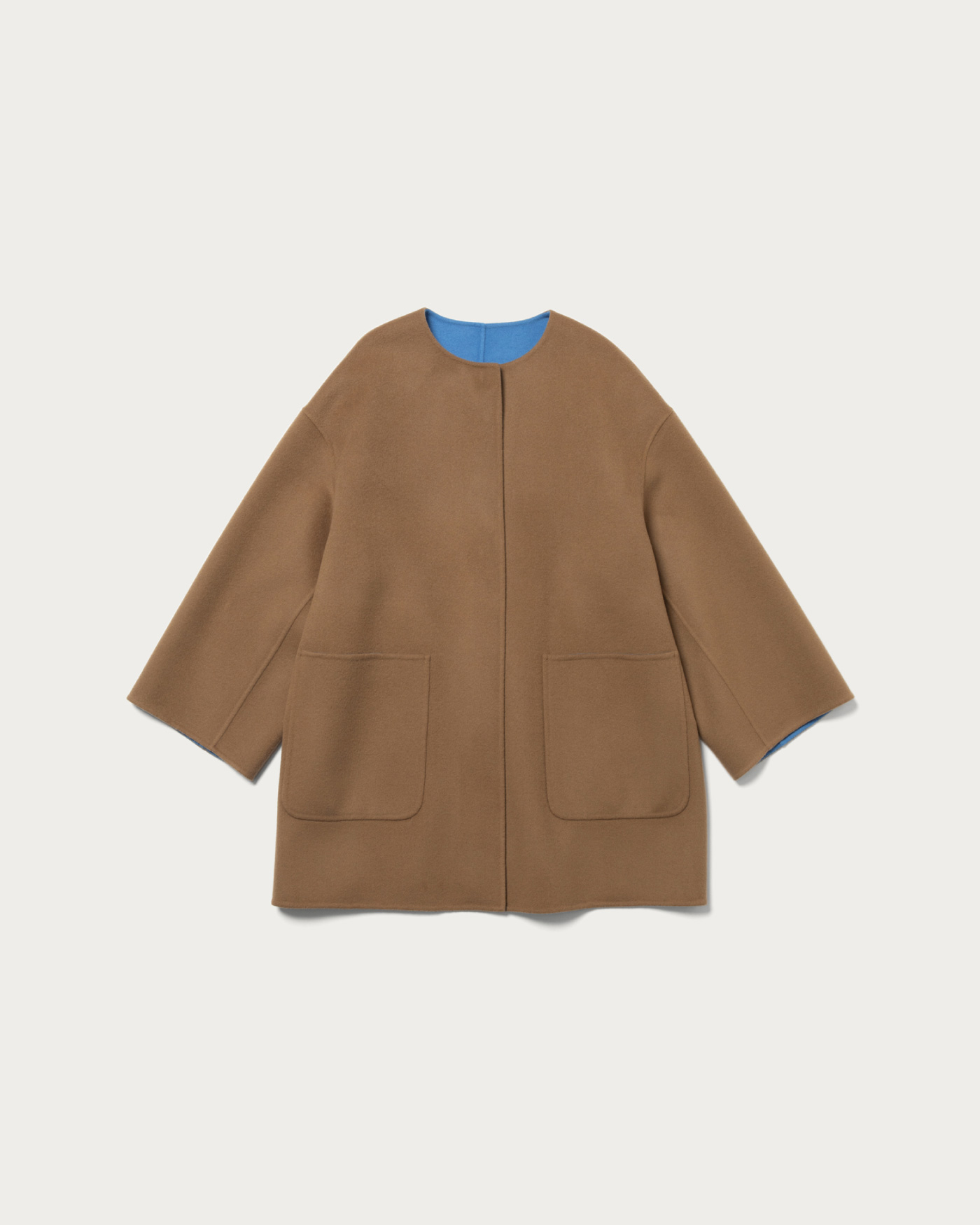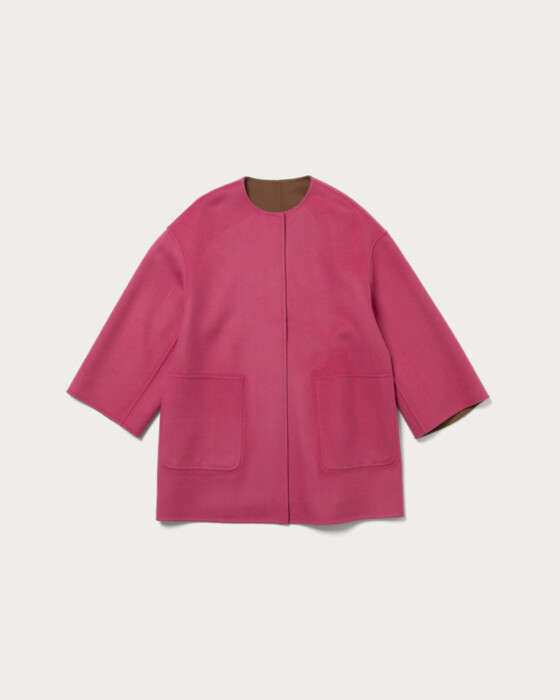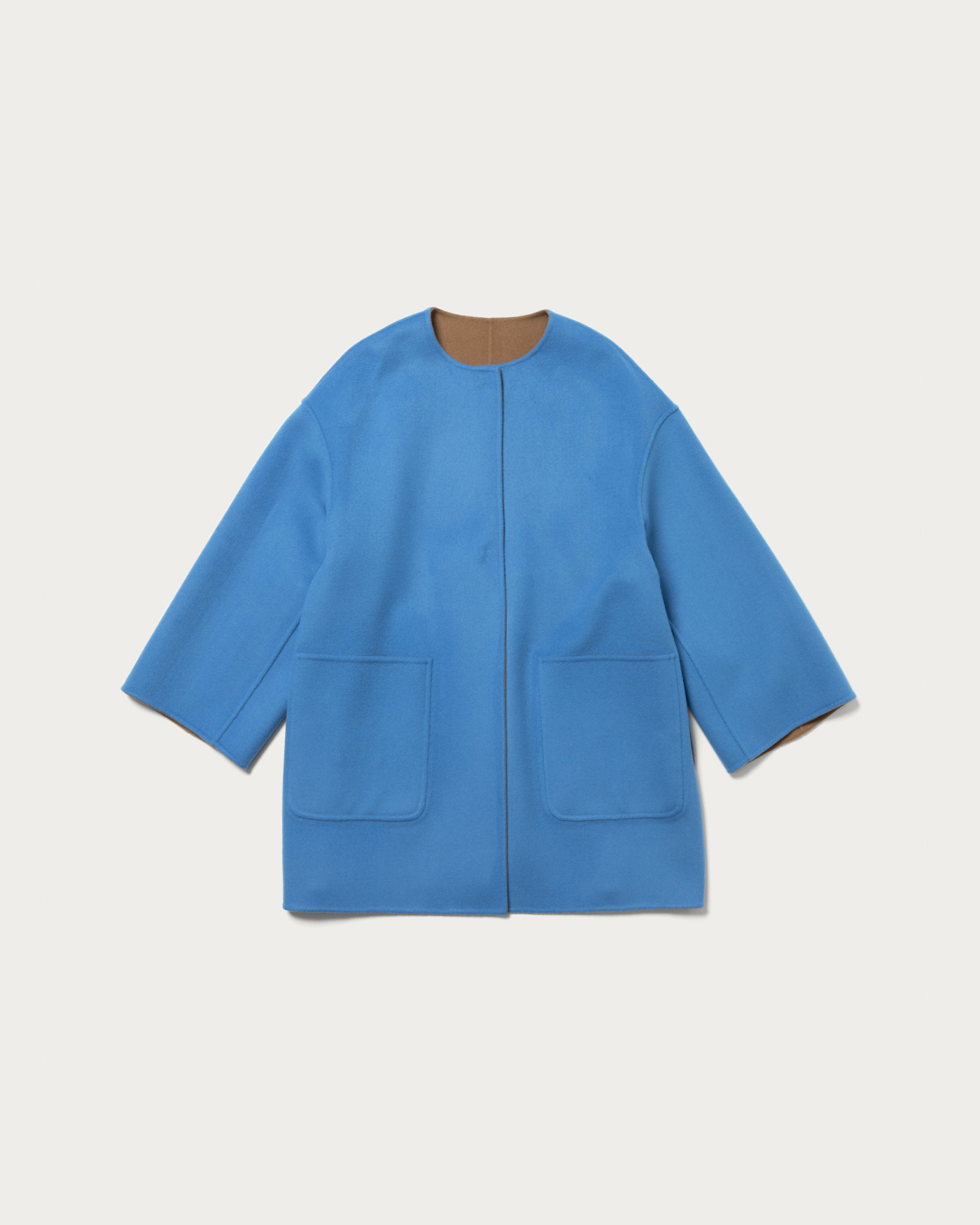 ストールを羽織っているかのように軽く、シーズン手前から着やすいミドル丈が魅力のノーカラーコートです。全体的にゆとりをもたせたAラインのシルエットで、裾の両サイドにベントを入れマント風に仕上げました。バストやアームホールにもゆとりがあるため、ボリュームニットも合わせやすくシーズンを長く楽しめます。