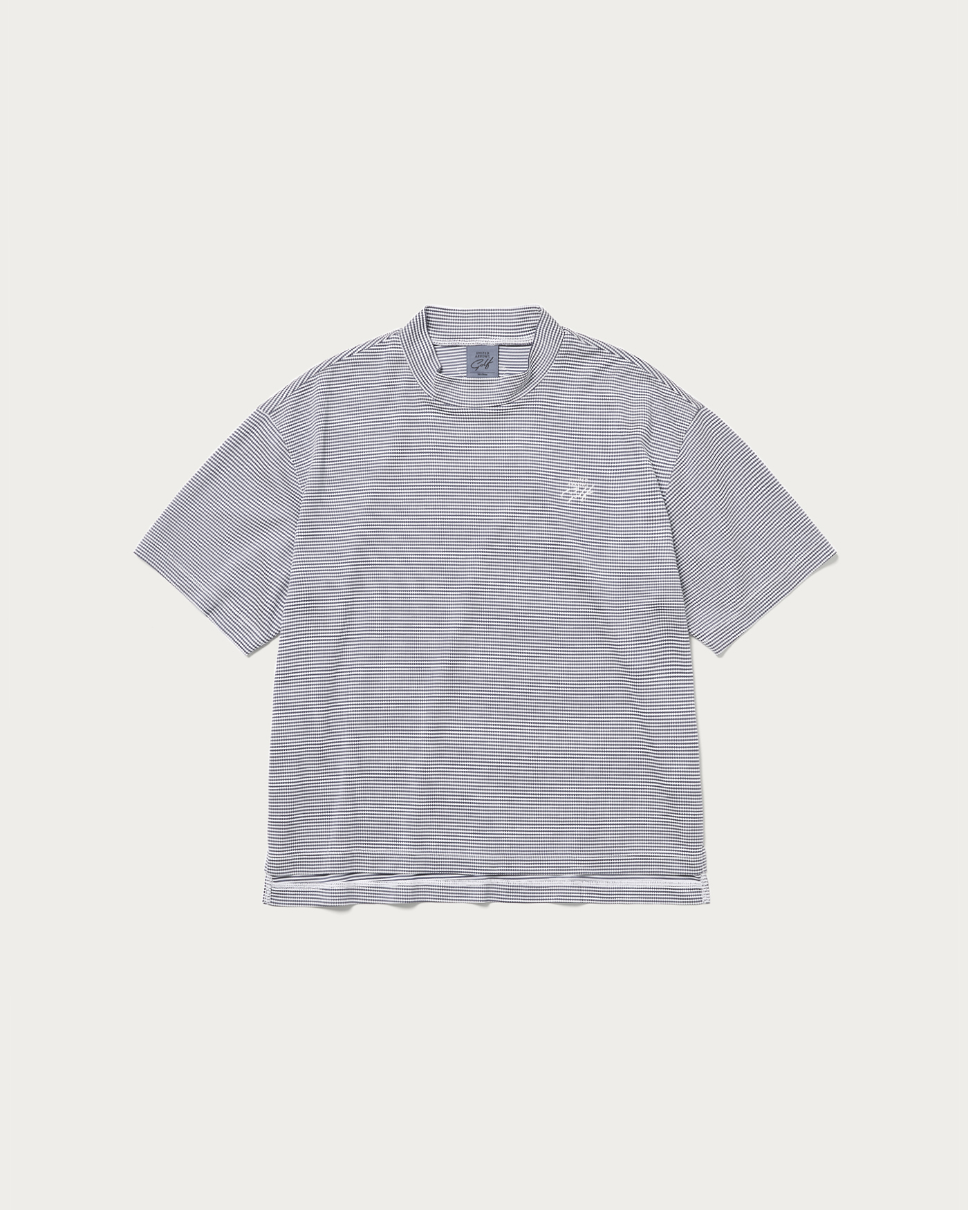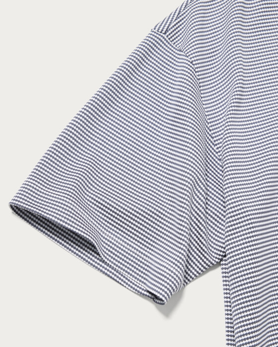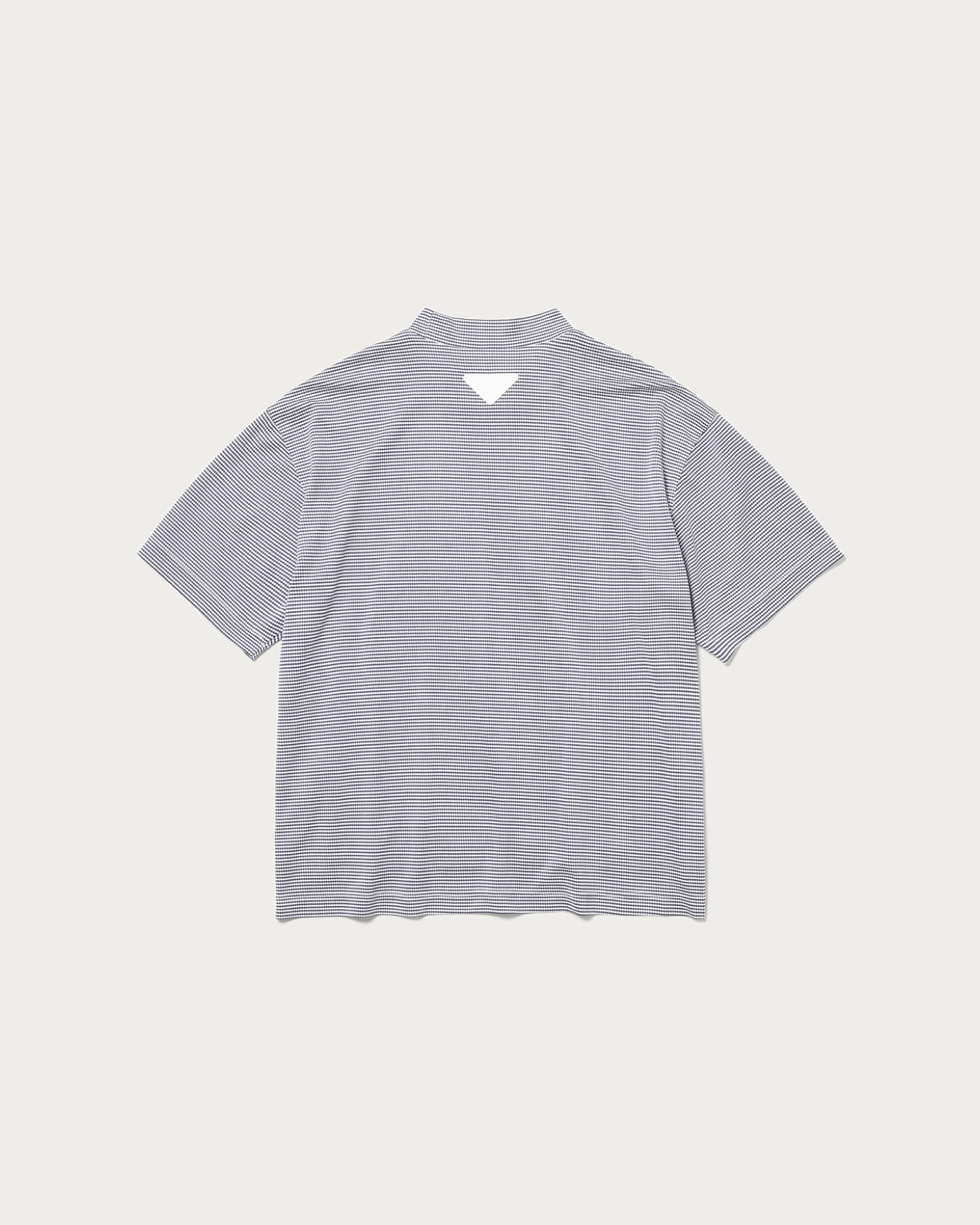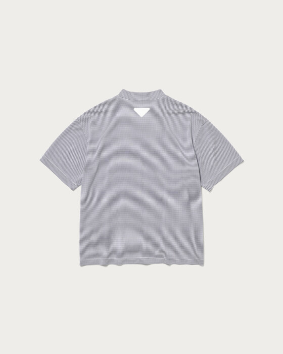 ミジンBORDERのPLシャツ。単調になりがちな夏場のコーディネイトに細かなピッチのボーダーで一枚で着用しても様になるアイテムです。