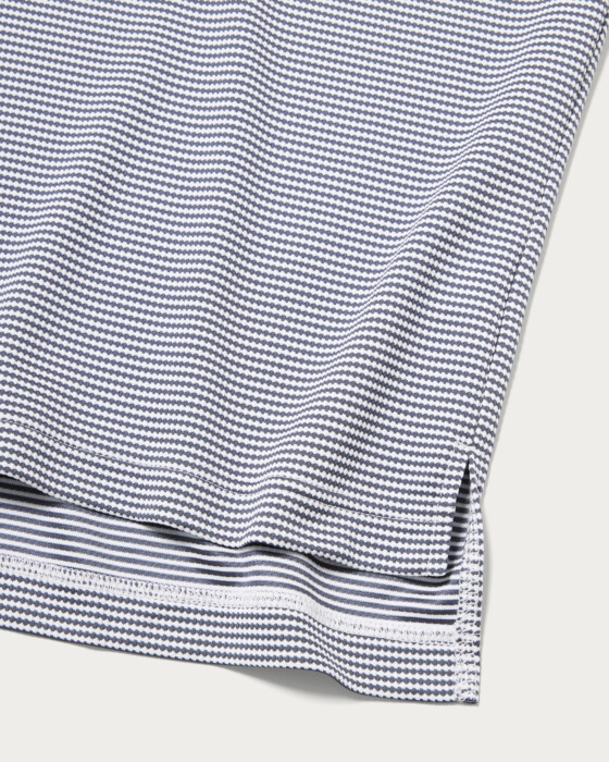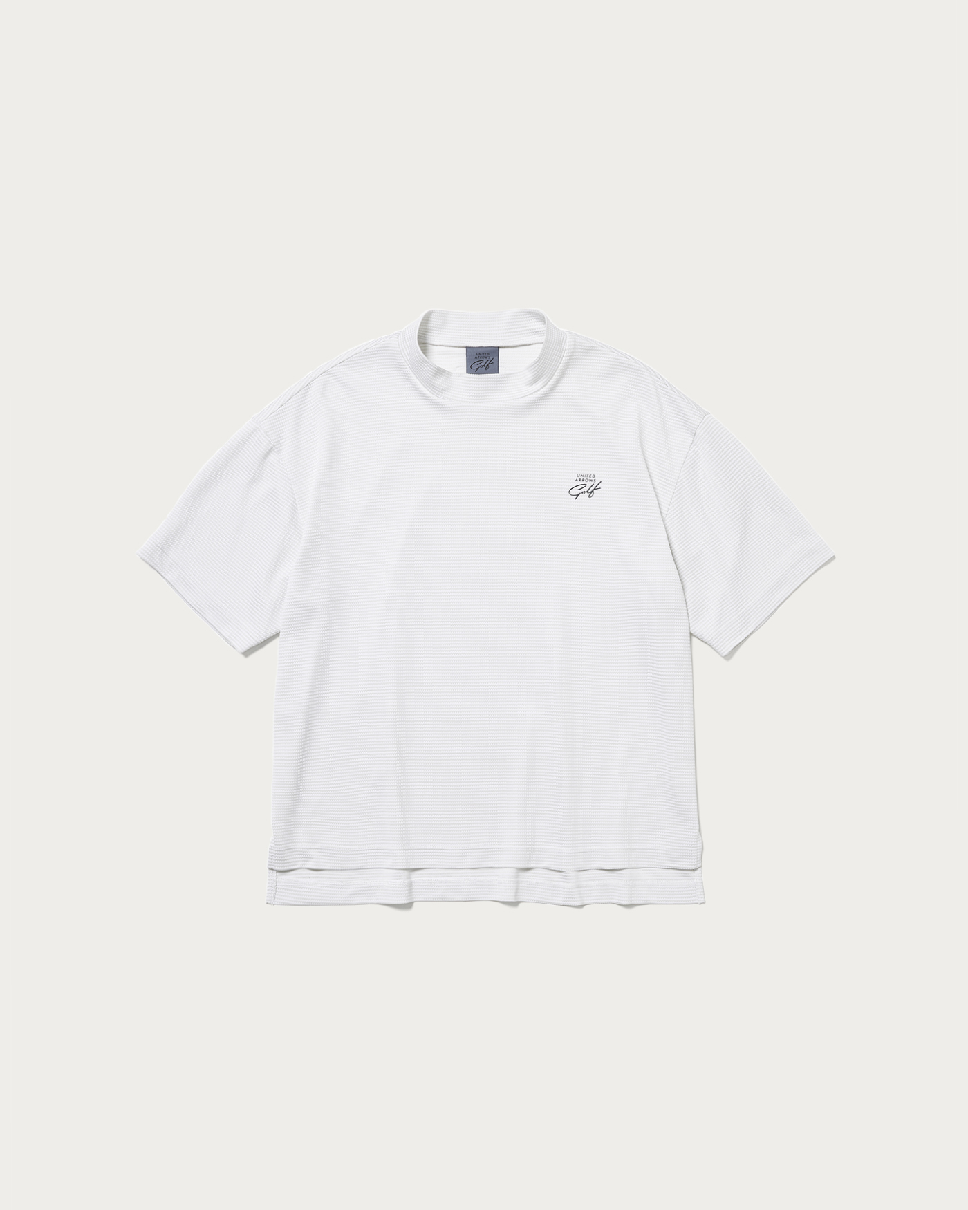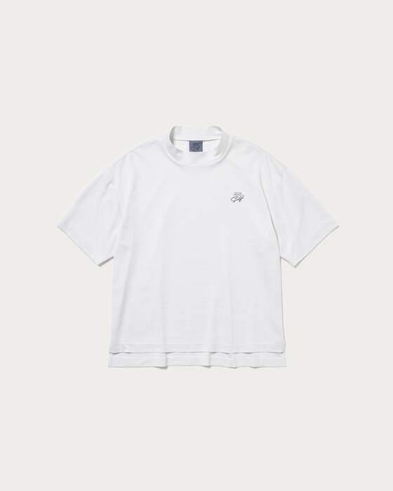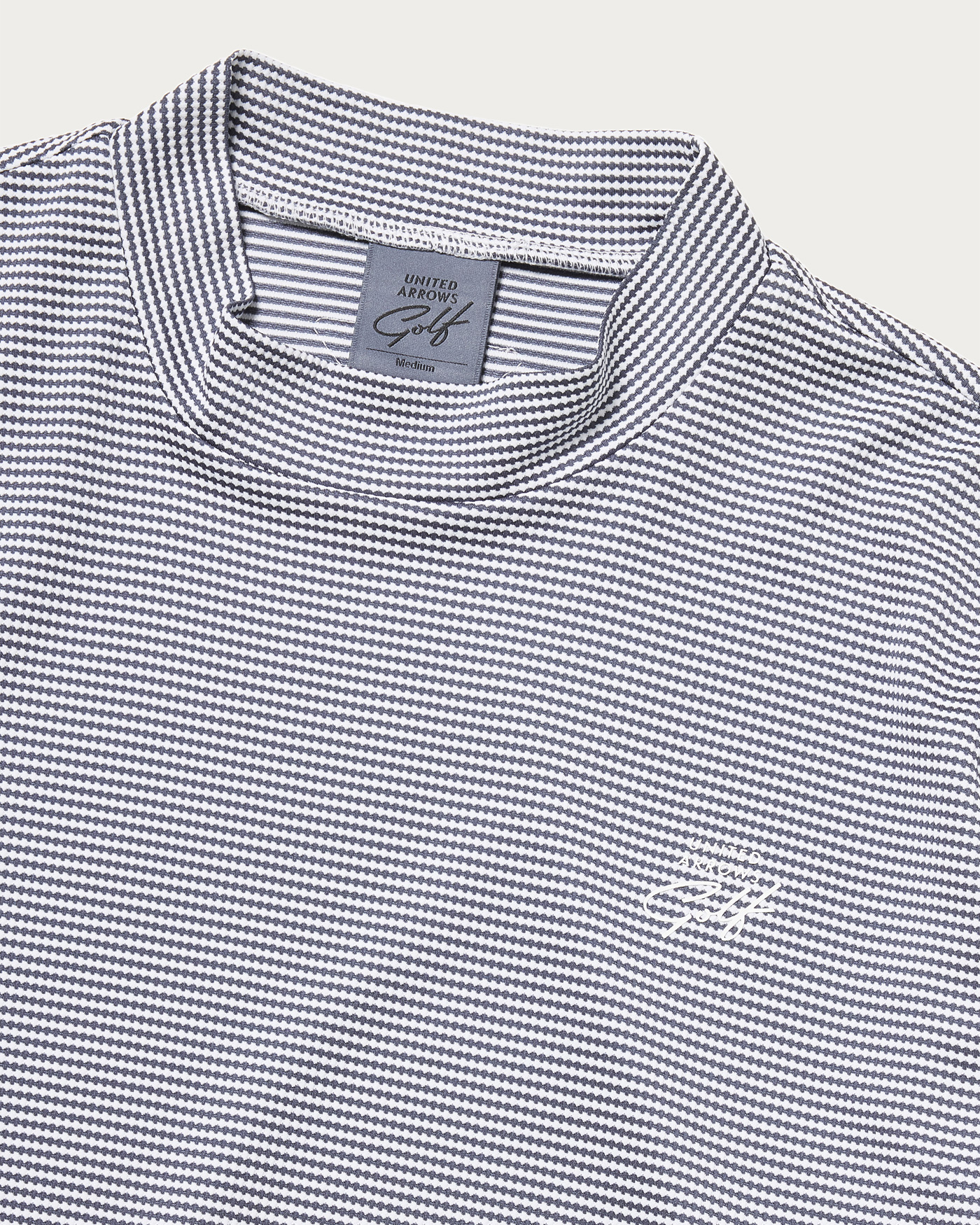 ミジンBORDERのPLシャツ。単調になりがちな夏場のコーディネイトに細かなピッチのボーダーで一枚で着用しても様になるアイテムです。