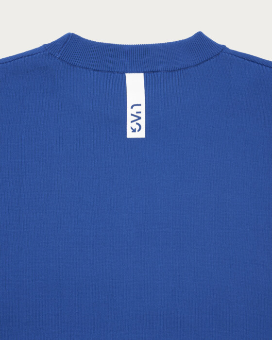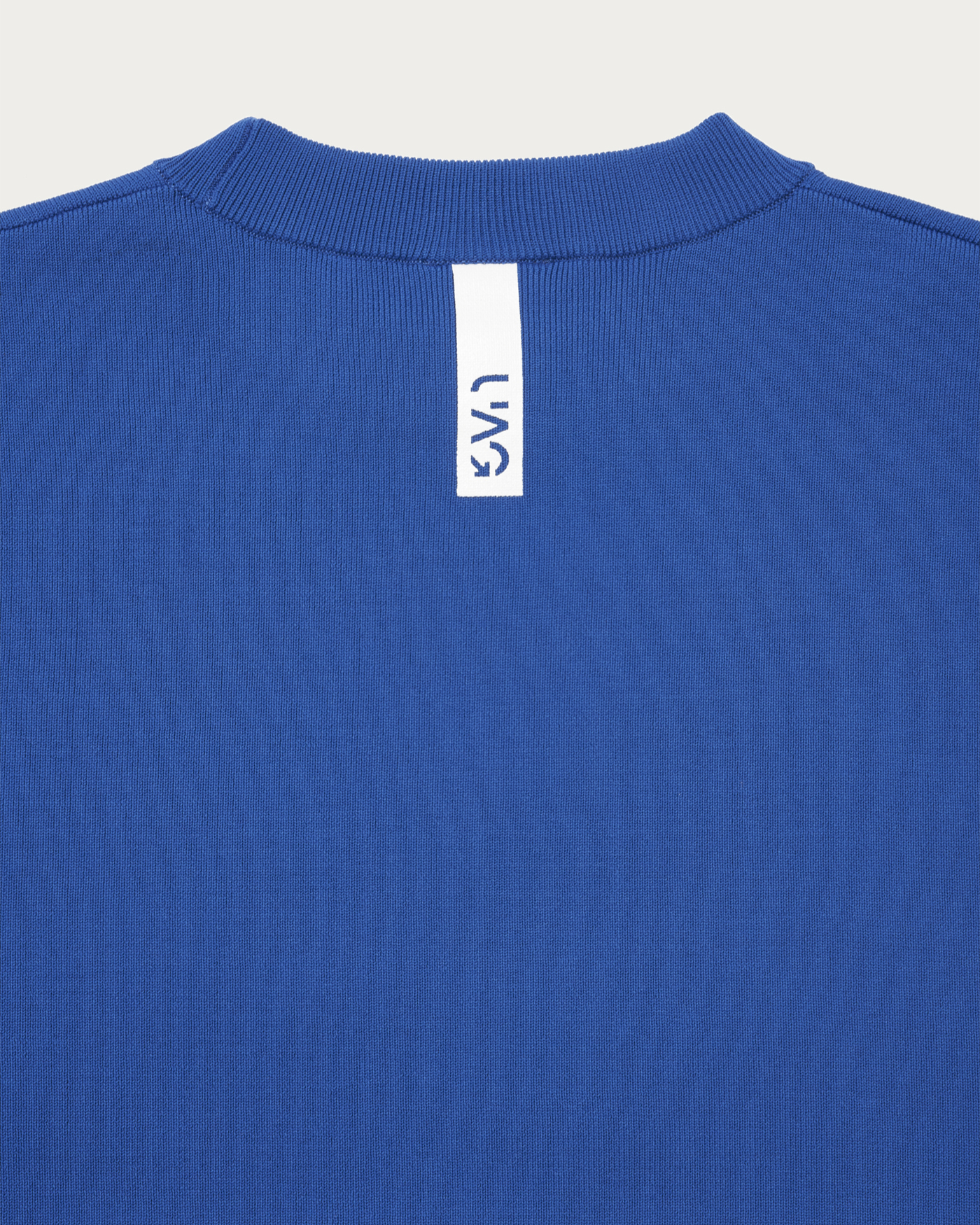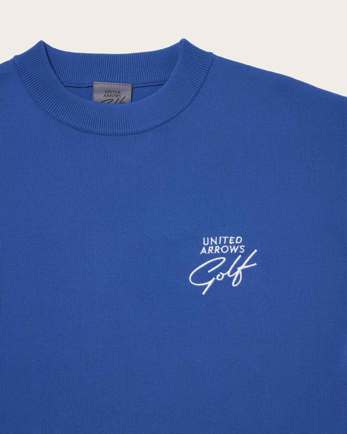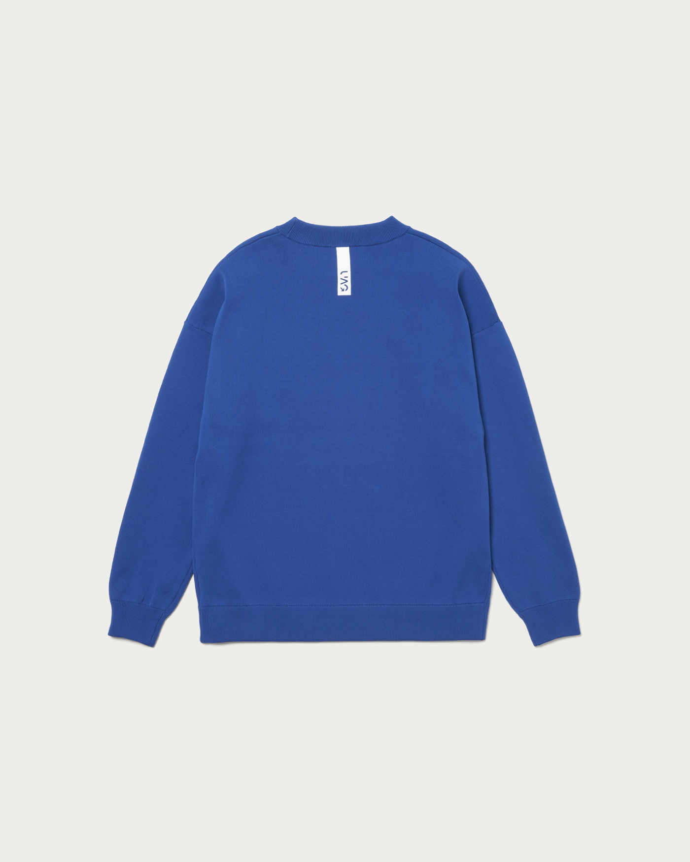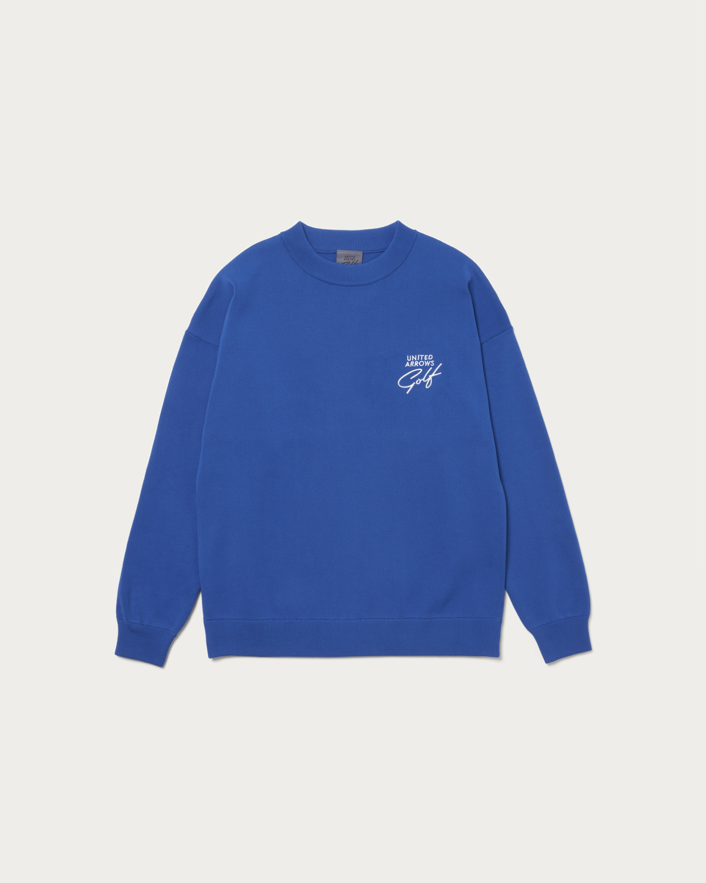 ややハリのある化繊素材を使用し、スポーティーなニットに仕上げました。胸にはやや大きめのLOGOを配し強調していますが、全体的にはシンプルなクルーネックニットです。鮮やかなブルーは淡いトーンでもモノトーンの挿し色としても活躍します。