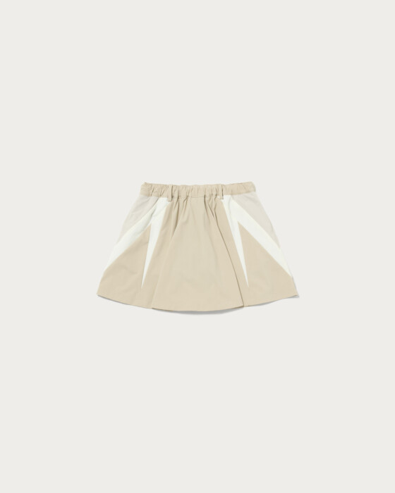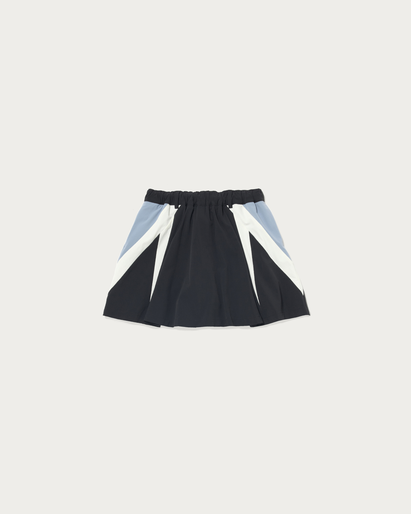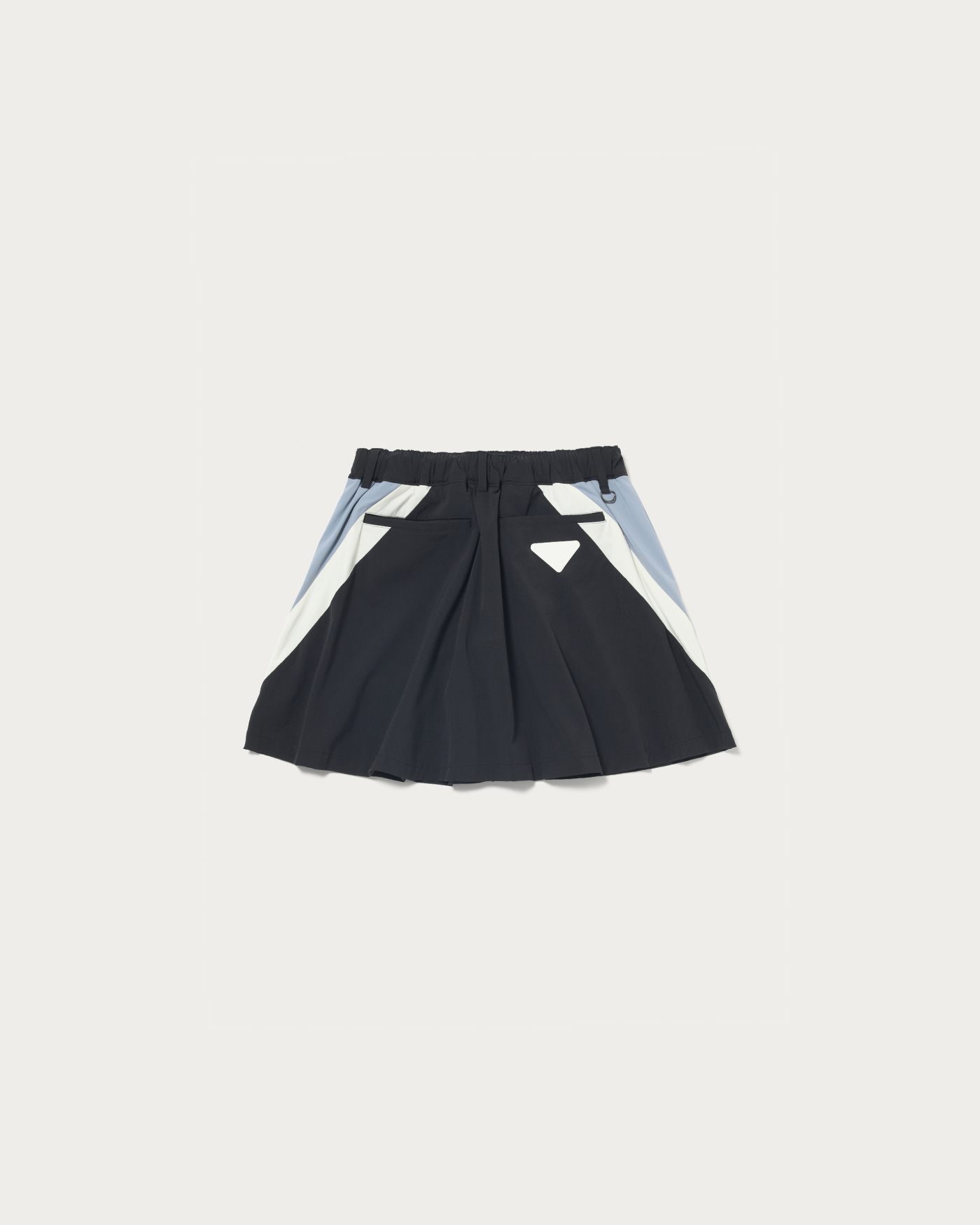 しなやかなナイロン4WAYストレッチ素材を使用したフレアシルエットのスコートは、ジャケットと連動した大胆な切り替えパターンが特徴。インナーパンツ一体型によりスイング時のスコートの回転を抑え、快適な着用感を実現しています。程よいボリューム感と動きやすさを両立し、洗練されたスポーティーなデザインがゴルフシーンに映える一着です。