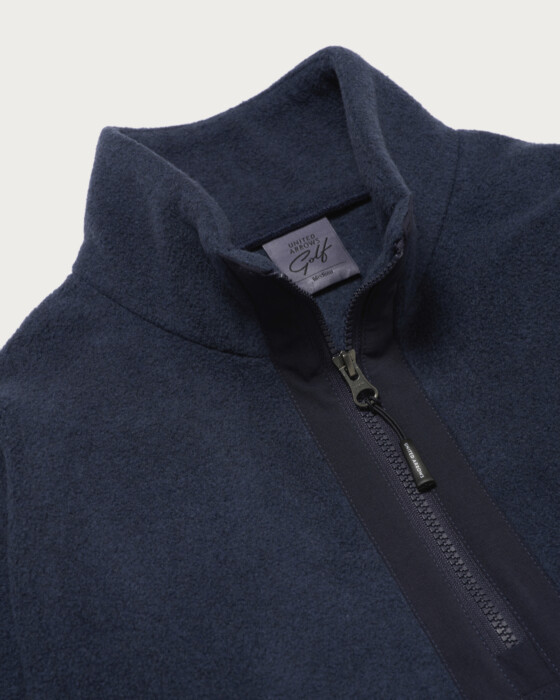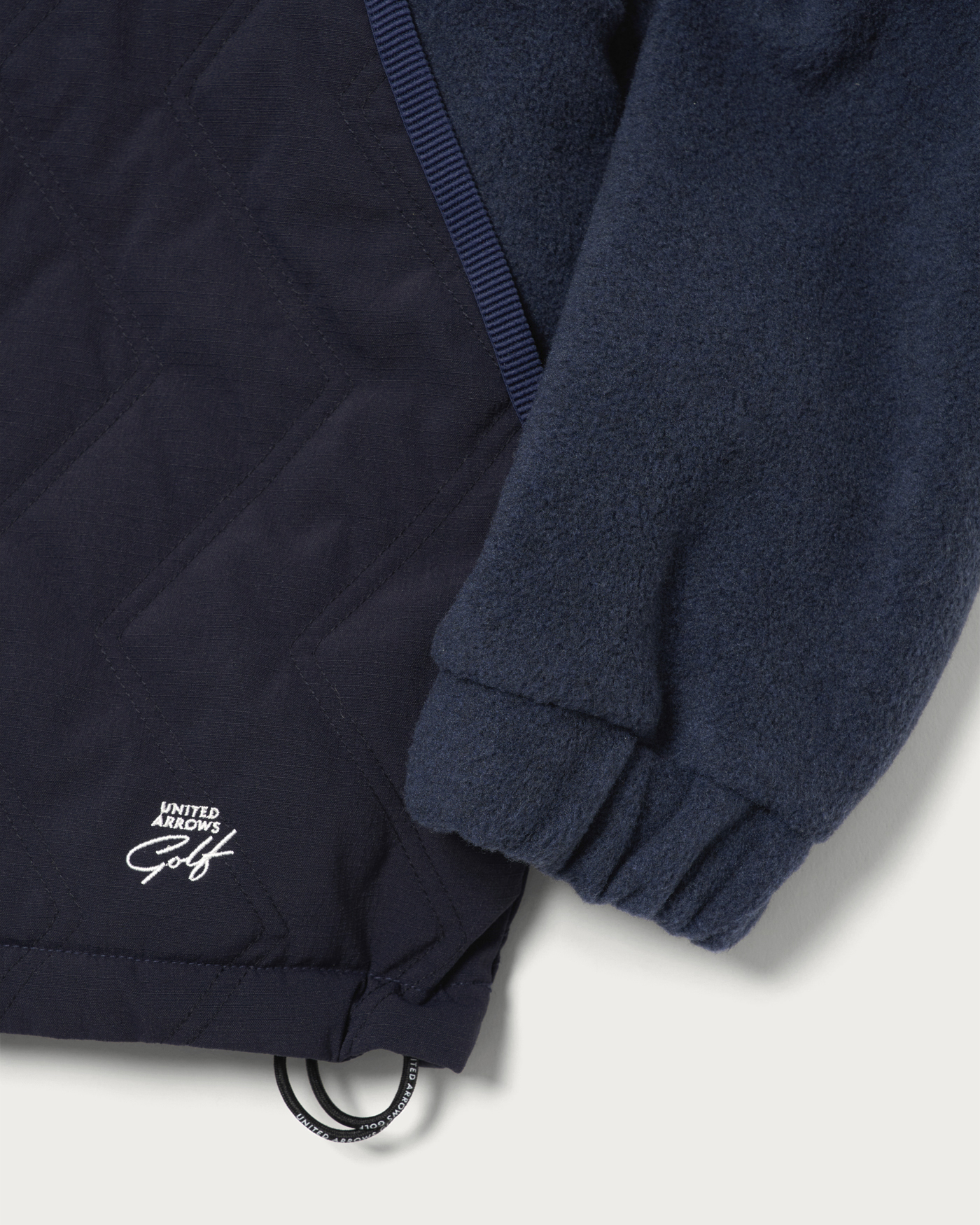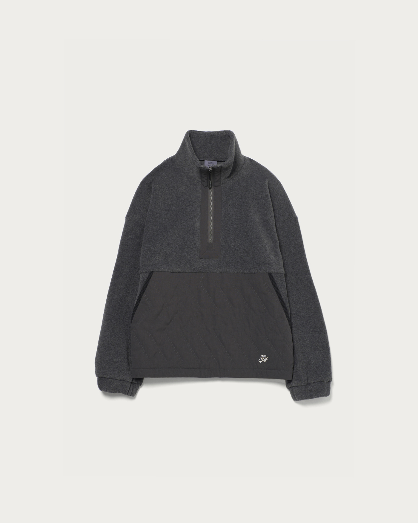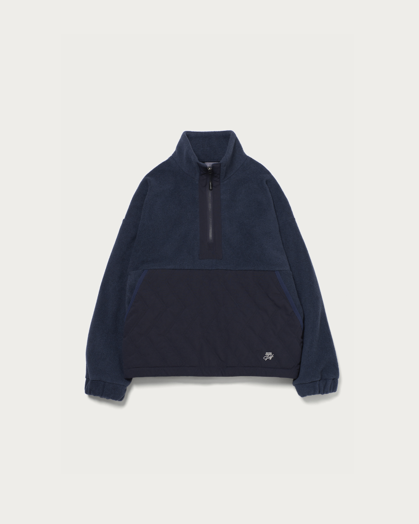 柔らかく膨らみのある両面起毛フリースを使用した、ハーフジップ仕様のレディースアウター。ふっくらとした温もりのある素材感が、秋冬シーズンのゴルフスタイルを快適に彩ります。フロントのカンガルーポケットにはジグザグキルト加工を施した布帛素材を切り替え、異素材の質感がさりげない立体感と高級感を演出。リラックス感のあるシルエットながら、プレー中の動きにも配慮された設計で、機能性とデザイン性を両立した一着です。
