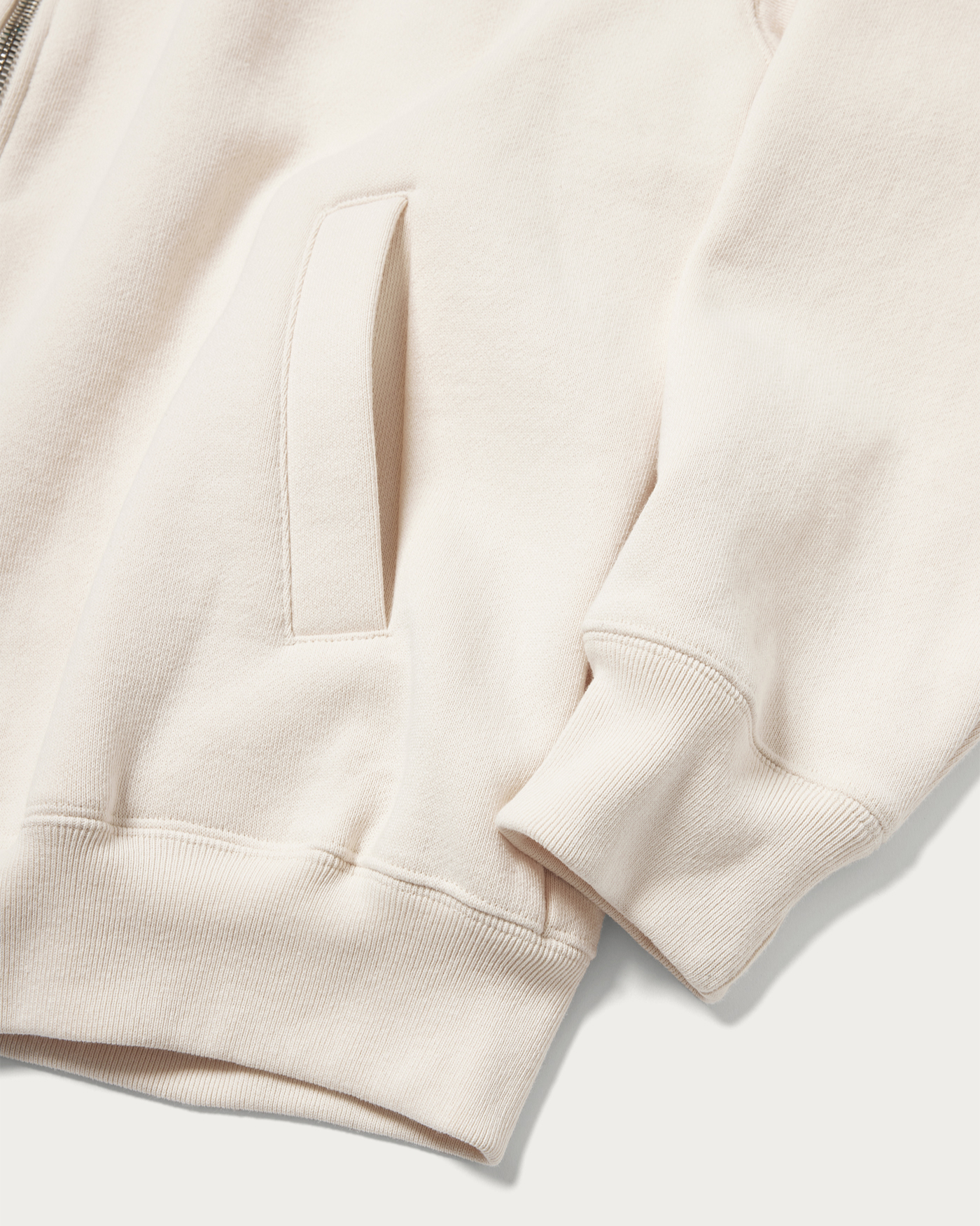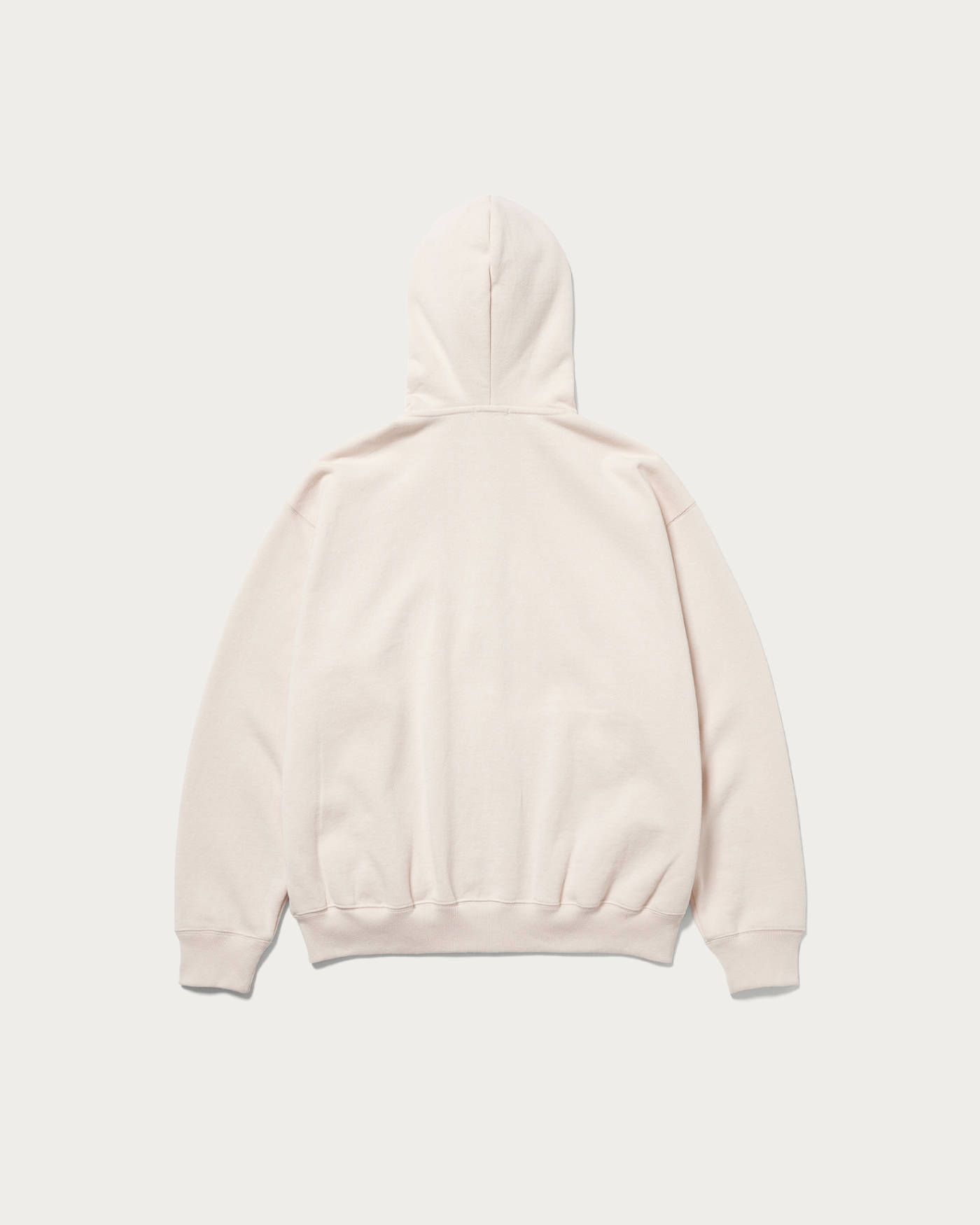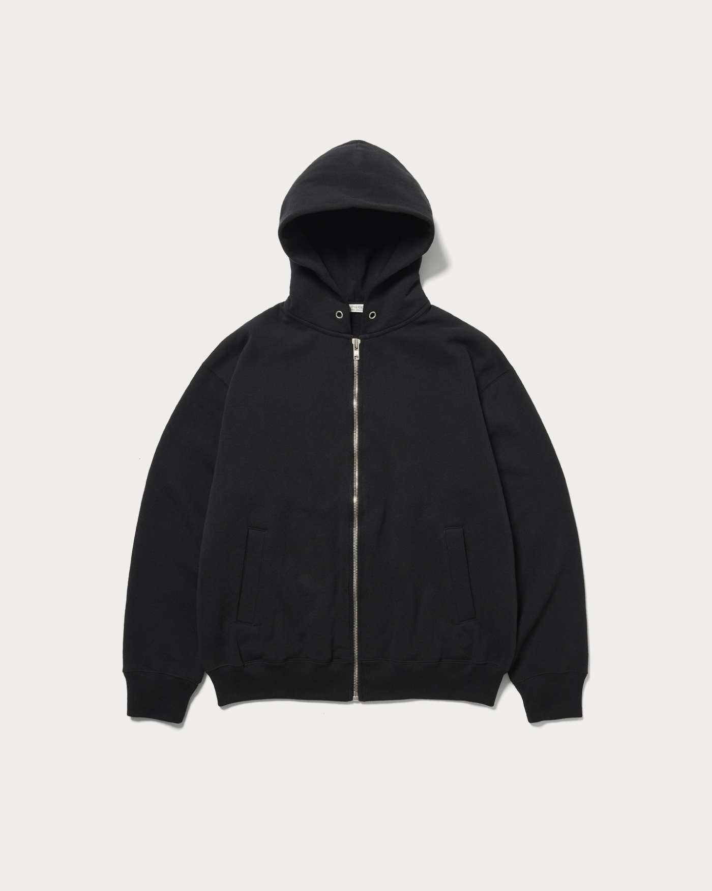 ヴィンテージスウェットを彷彿とさせるクラシックなジップフーディ。生地には洗濯と乾燥を繰り返したような起毛感を生み出し、ドライタッチな質感にあえて仕上げています。そのほかにもきつめのリブによる丸いシルエットや波打ったフロントファスナーなど、まるで着古した雰囲気を新品に宿しました。短丈と腰のポケットはブルゾンライクに着られるよう工夫しています。