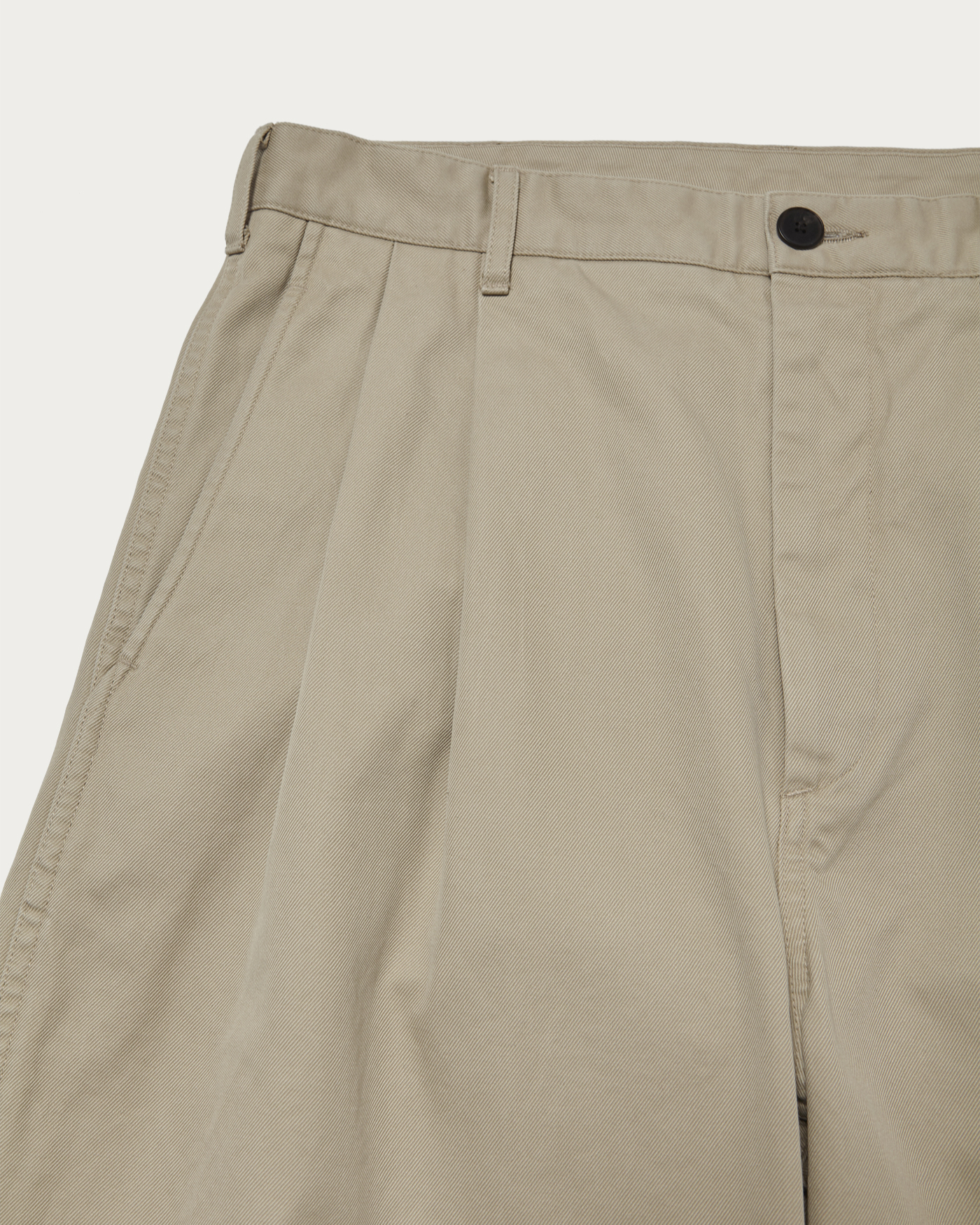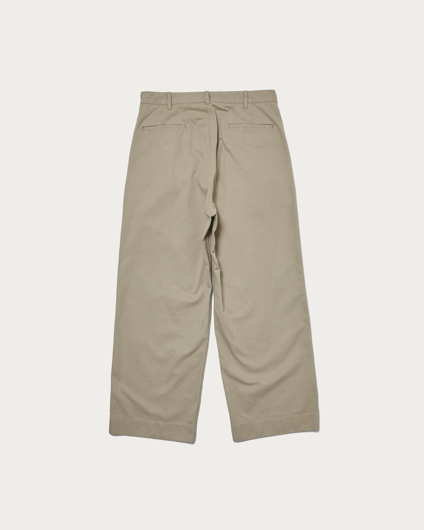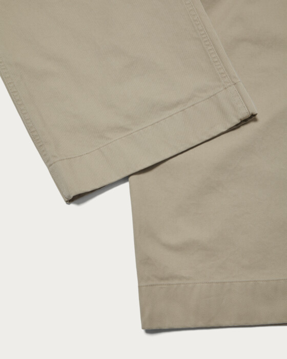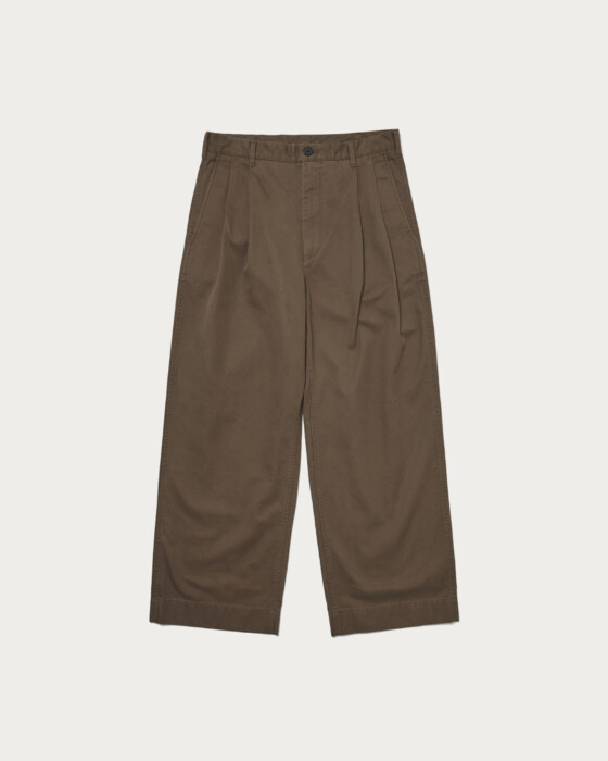 アメリカンチノを〈ビューティー&ユース〉のハイライン的に解釈した端正なトラウザーズを製作。素材とシルエットに着目し、単糸を3つ撚り合わせたスリープライヤーンを採用。こちらは高密度で織り上げたツイル生地のことで、滑らかな肌触りとしっかりとしたハリとコシが出るのが特徴的です。そのため立体的なシルエットに。2タック仕様&裾まで広めにとったエクストラワイドな形は、穿いた時の存在感が際立ちます。フロントと内掛けには本水牛釦を用いて、右腰ポケットにはコインポケットを配置。ベージュとダークブラウンの2色展開です。
