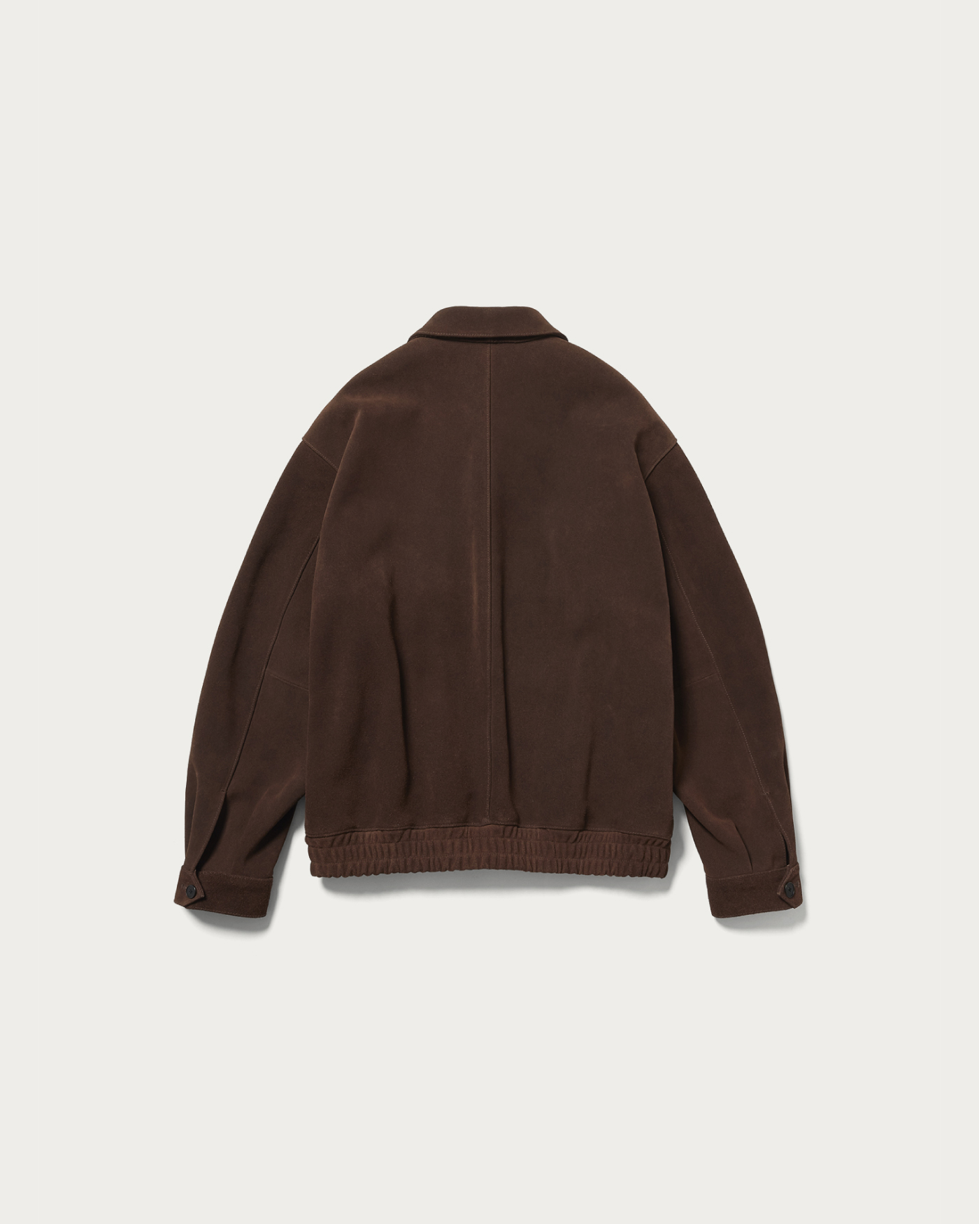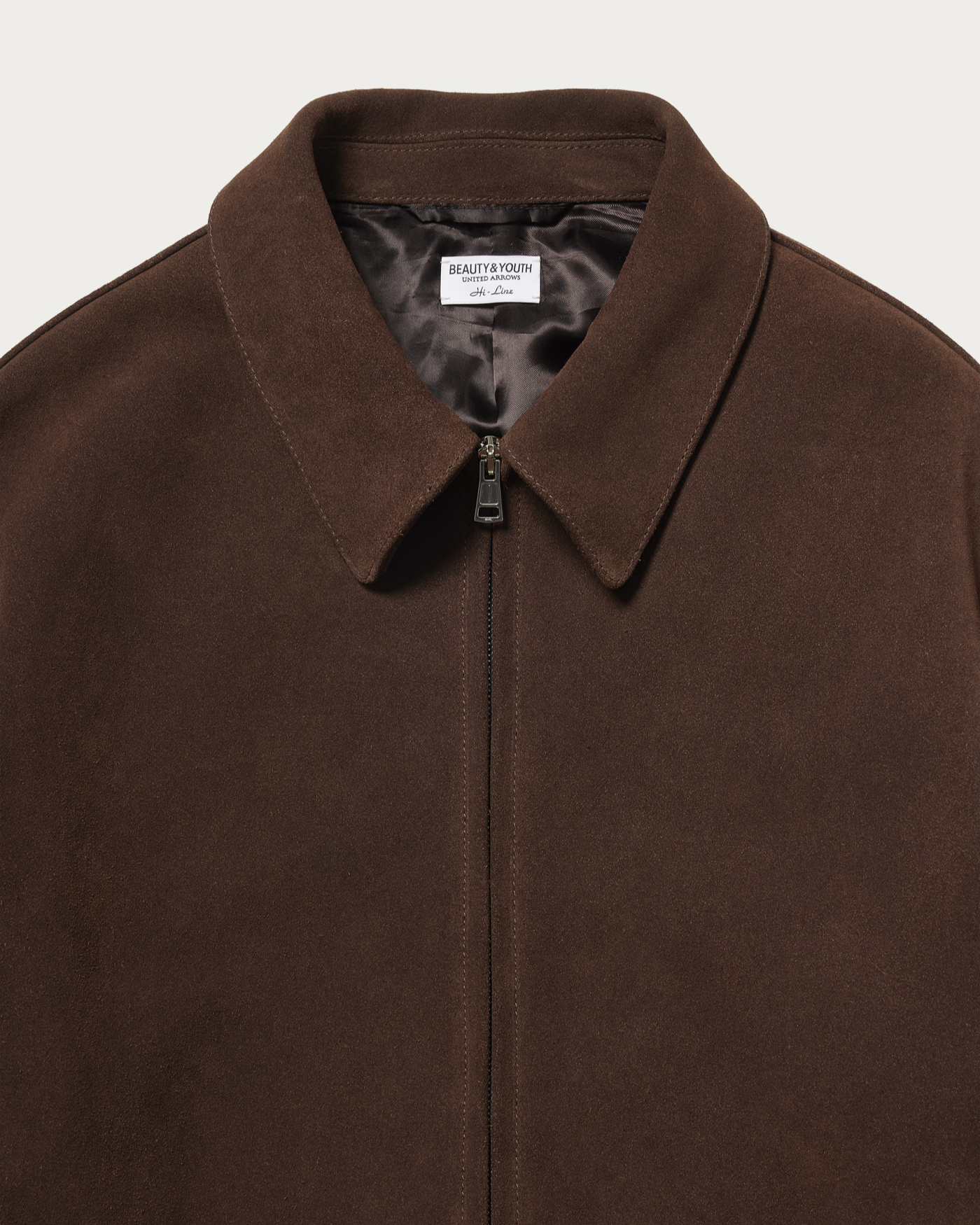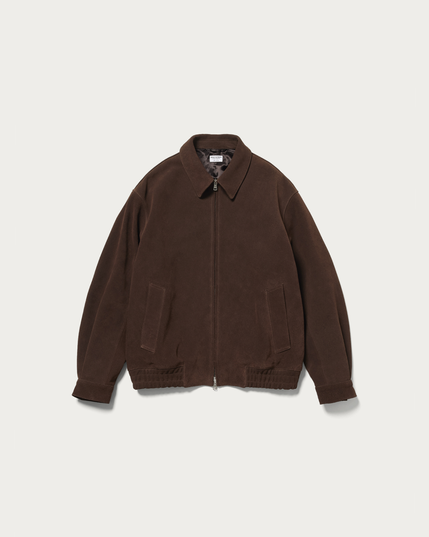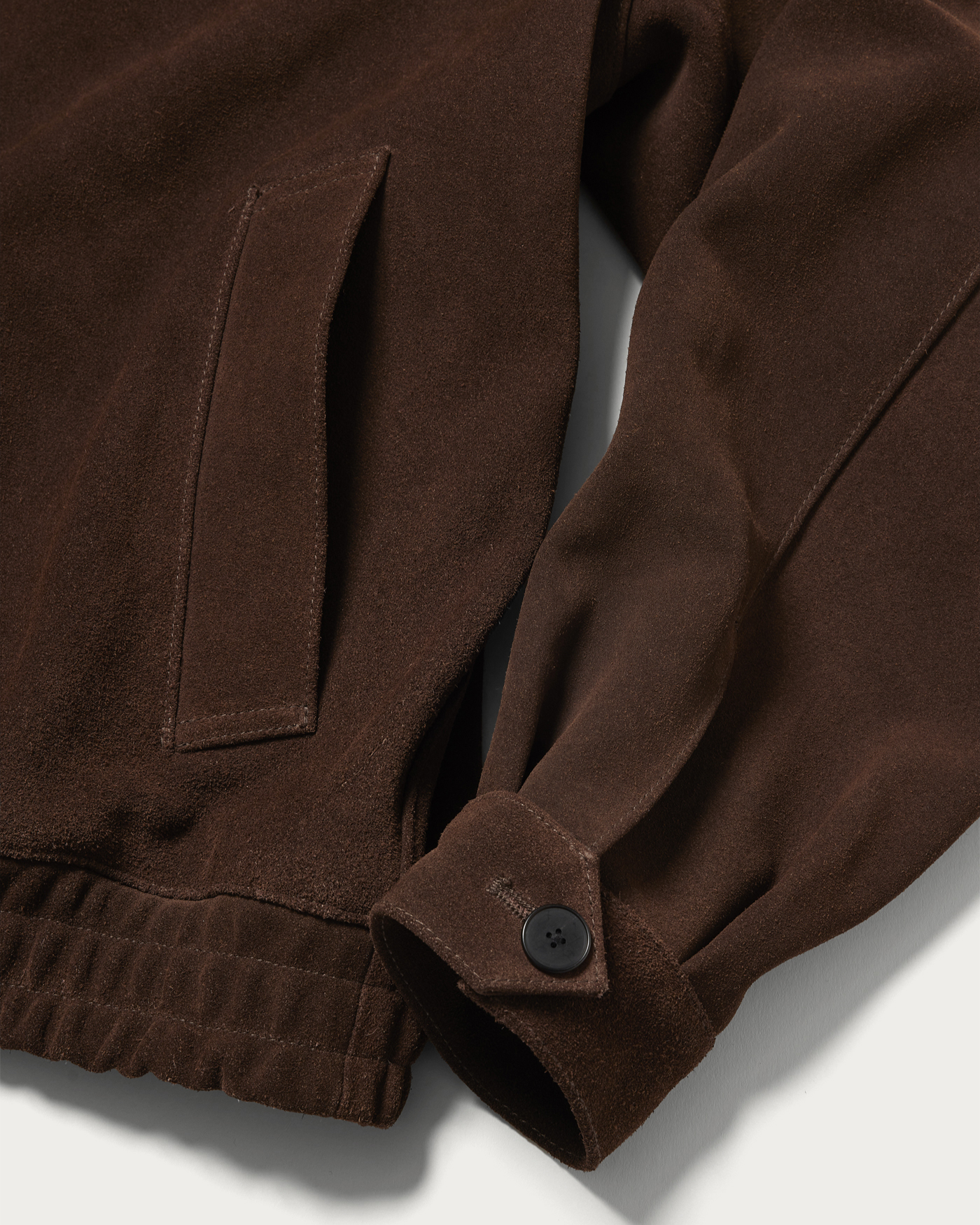 ハリントンジャケットをブラウンスエードレザーを用いて製作。しっかりとした厚みのカウスエードは着続けていくとだんだんと身体に馴染みます。ウエスト部分はゴムシャーリングで引き締めてフォルムにメリハリをつけました。フロントにはイタリア製のラッカーニ®社のシャインポリッシュファスナーを採用。裏地はキュプラで袖通しを滑らかに、高級感も加えました。