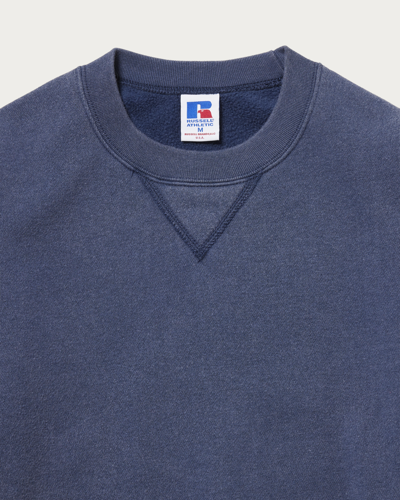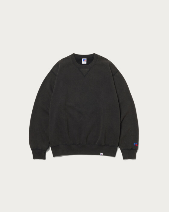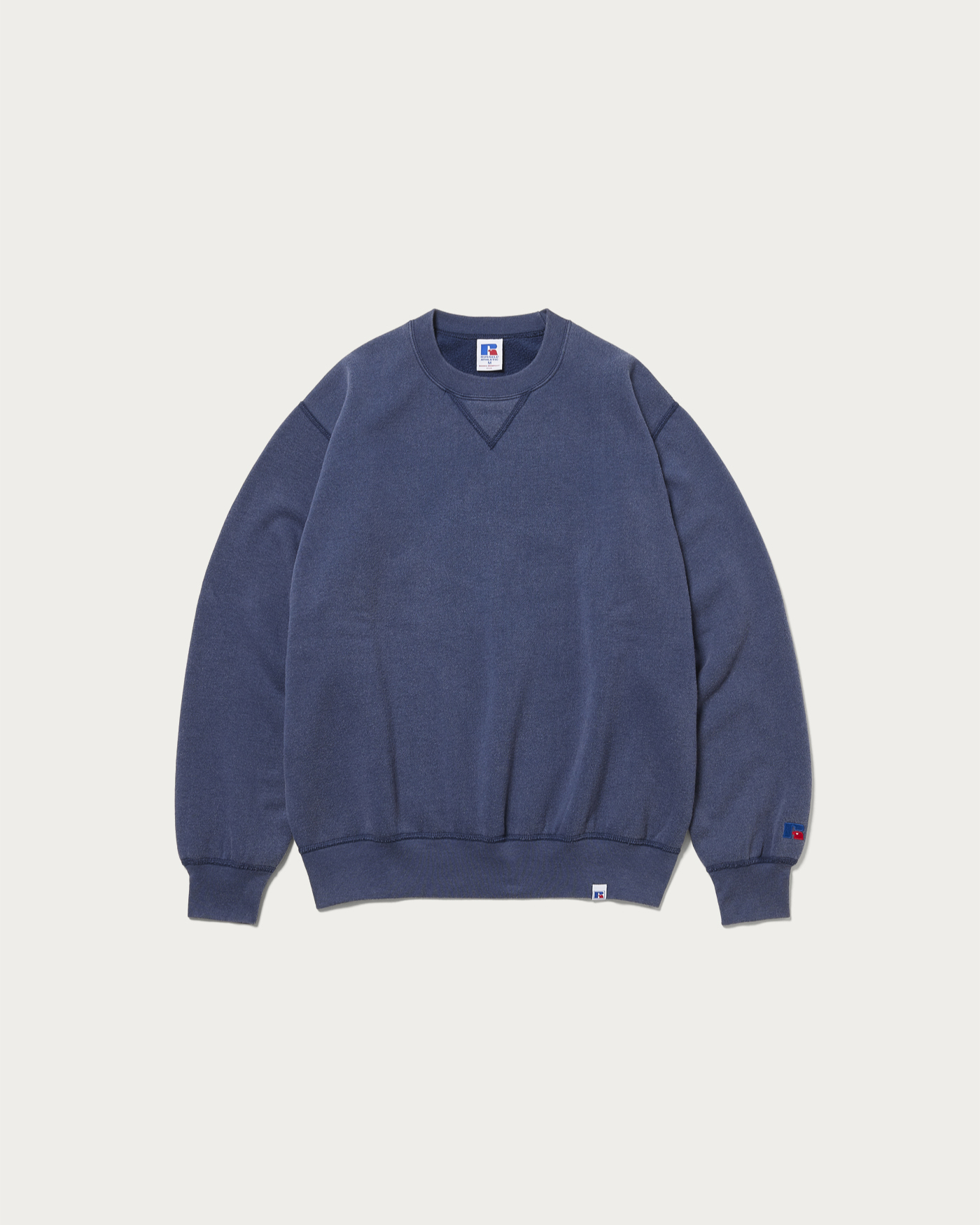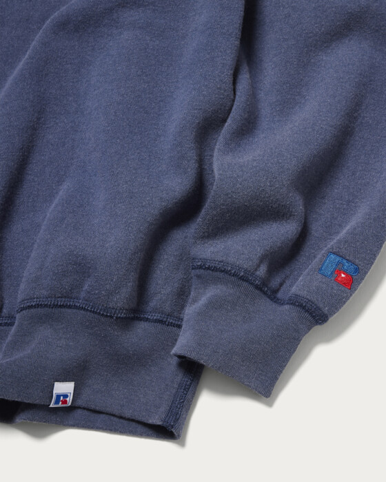 〈ラッセルアスレティック〉が〈ビューティー&ユース〉のために製作したクルーネックスウェット。80年代頃のスウェットを参考に、ポリエステル・コットン・レーヨンの混紡素材を使用した裏起毛生地を使用しました。この生地はソフトな肌触りとふっくらとした質感が特徴で、製品時にスノー加工を施しており、ヴィンテージ感の表情を再現。また、適度なフェード加工により、絶妙な色味と起毛感が出ます。ブラウジングがしっかりと出るように裾リブは強めに設定。後付け風のフードは二枚仕立てで、えりの長さのバランスも細かく調整しています。裾のネームは60~70年代に使用されていたロゴを色味を変えた特別仕様に。