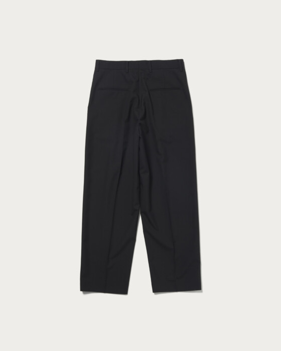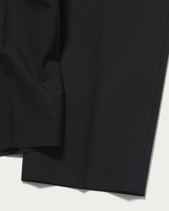 先染めのウール糸を高密度で織り上げることで軽やかな肌触りとしっかりとした肉感を両立した〈エイトン〉オリジナルの生地を使用し、セットアップをアップデート。パンツを通常より太めにすることで、〈ビューティー&ユース〉らしい抜け感のあるムードを表現しました。