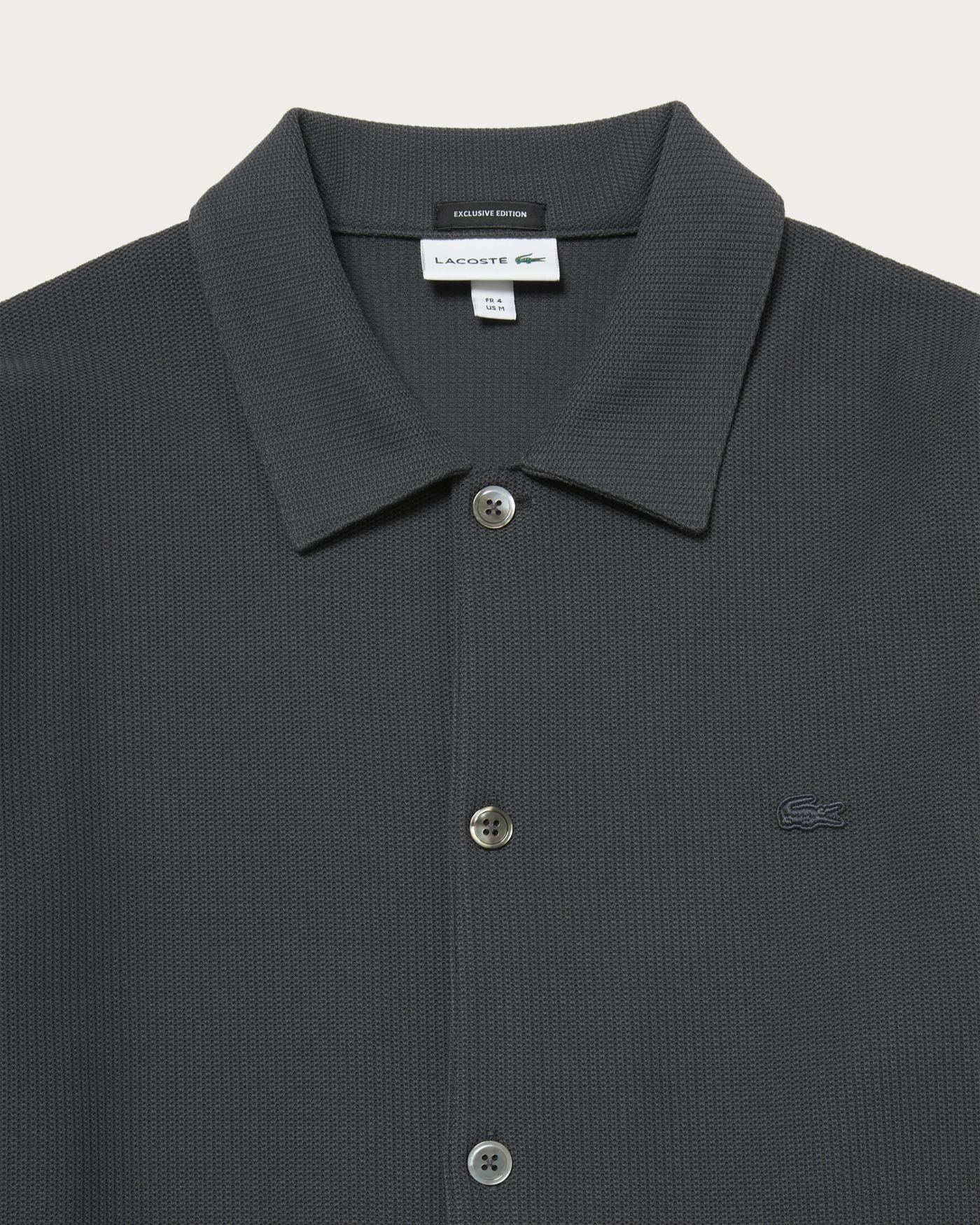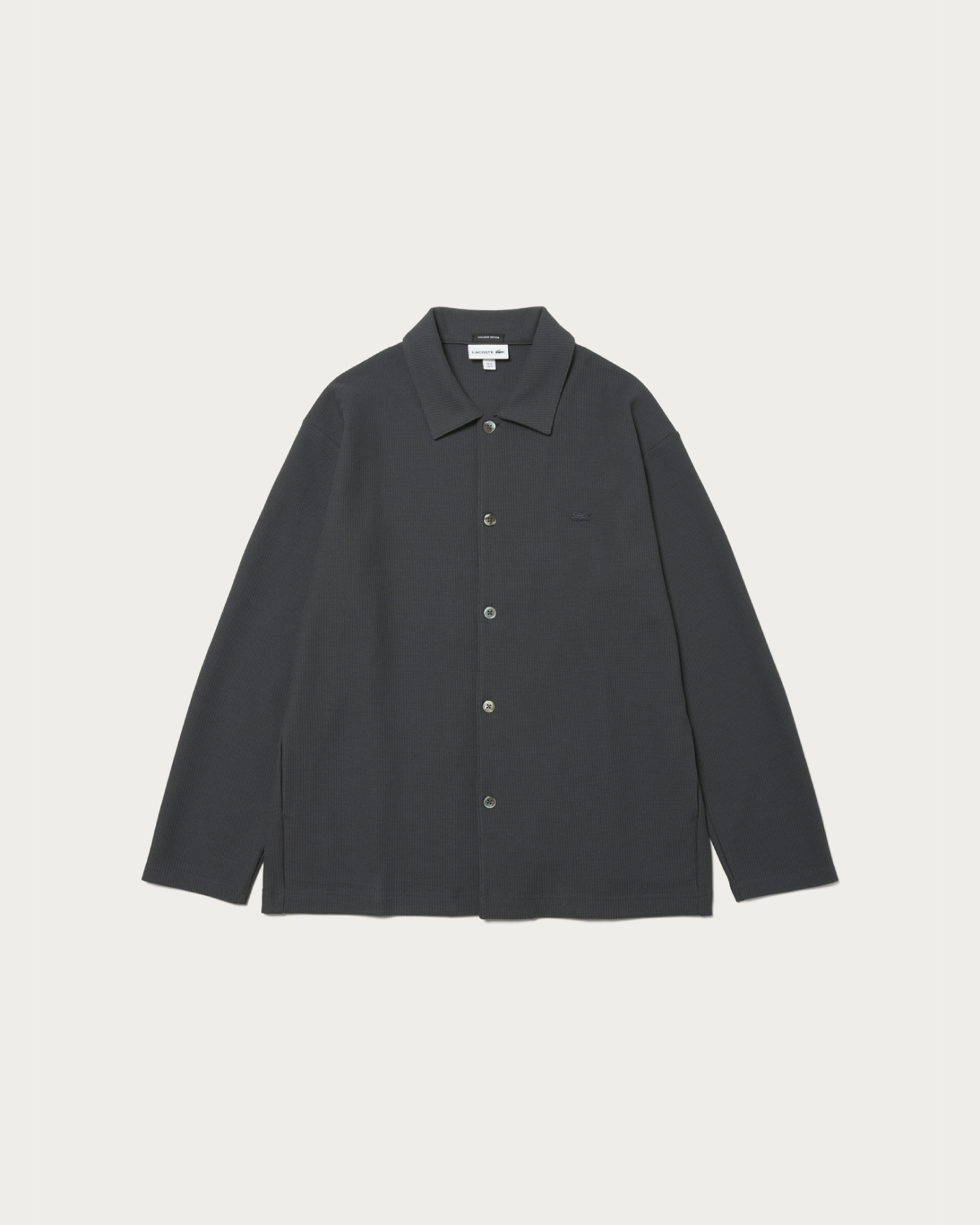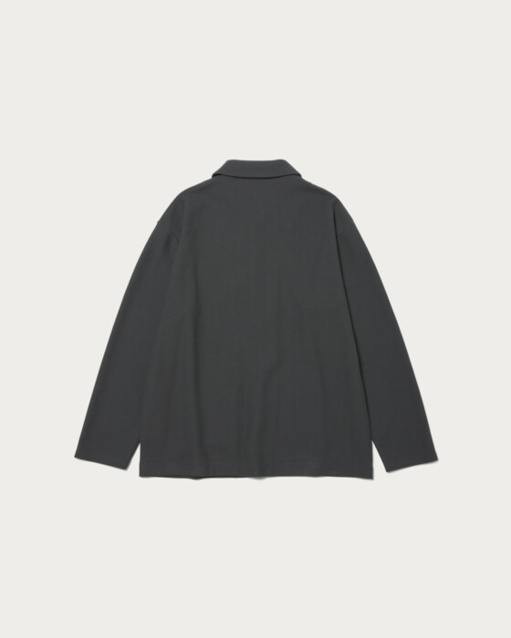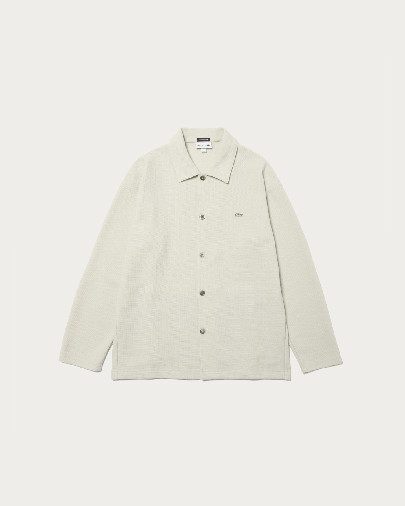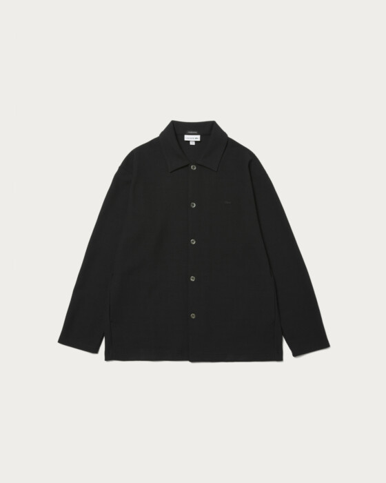 〈ラコステ〉との人気別注シリーズから、今回はニットライクなジャージ素材を使用したシャツジャケットが登場。程よくゆとりのあるオリジナルパターンに、ワントーンならではのボディがベーシックで使いやすい。同色でまとめたワニの刺繍ロゴもさりげなく、便利なサイドポケット付き。