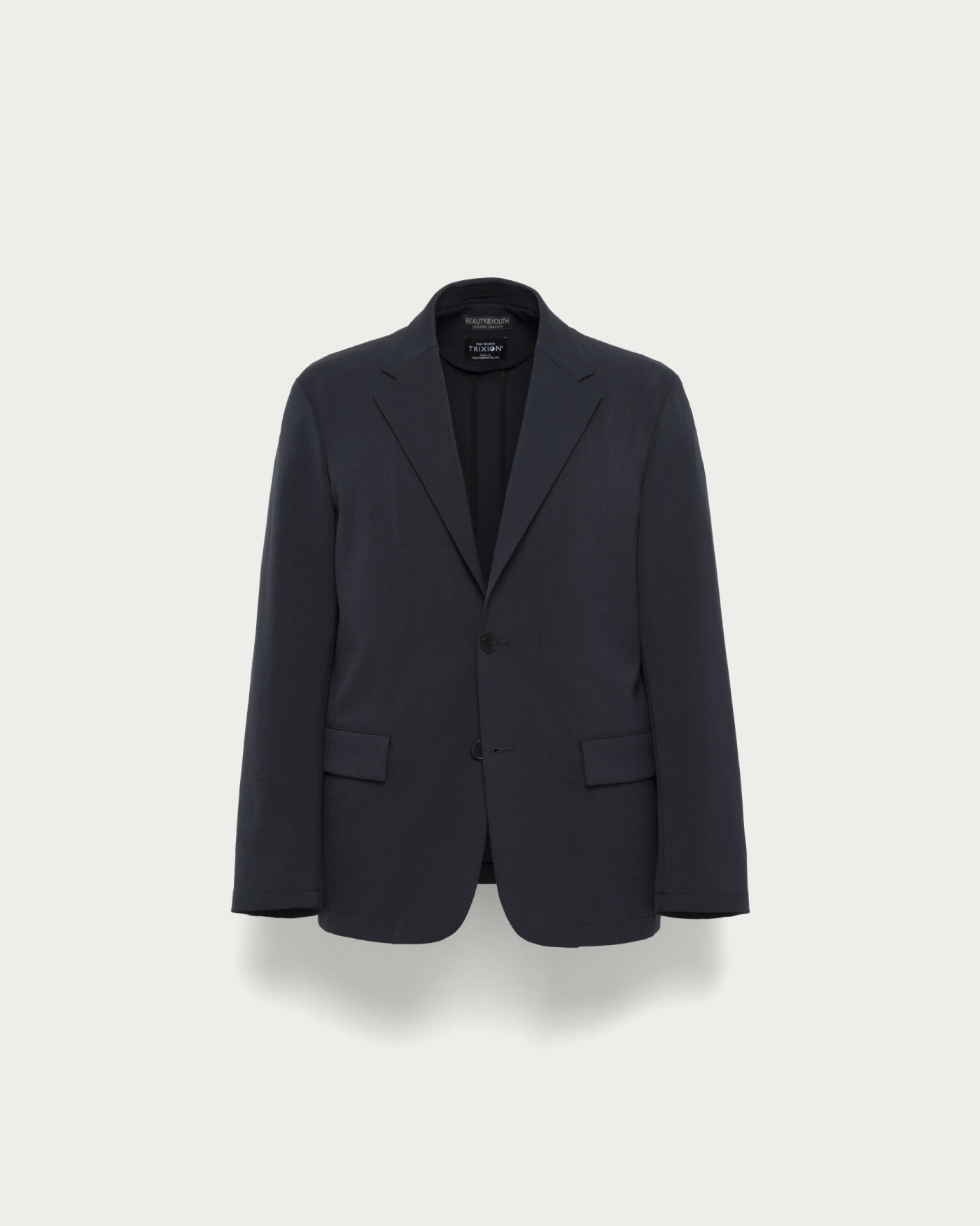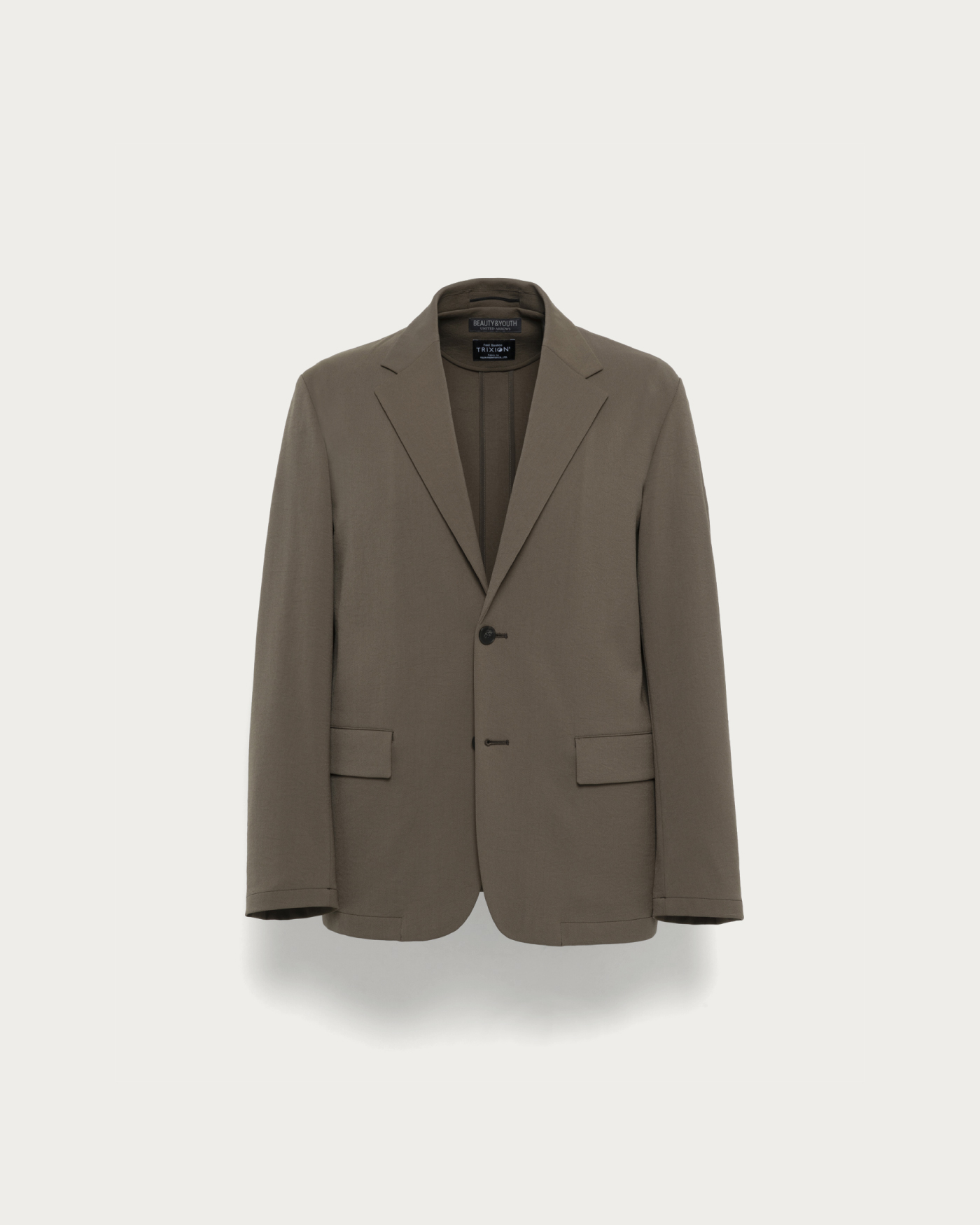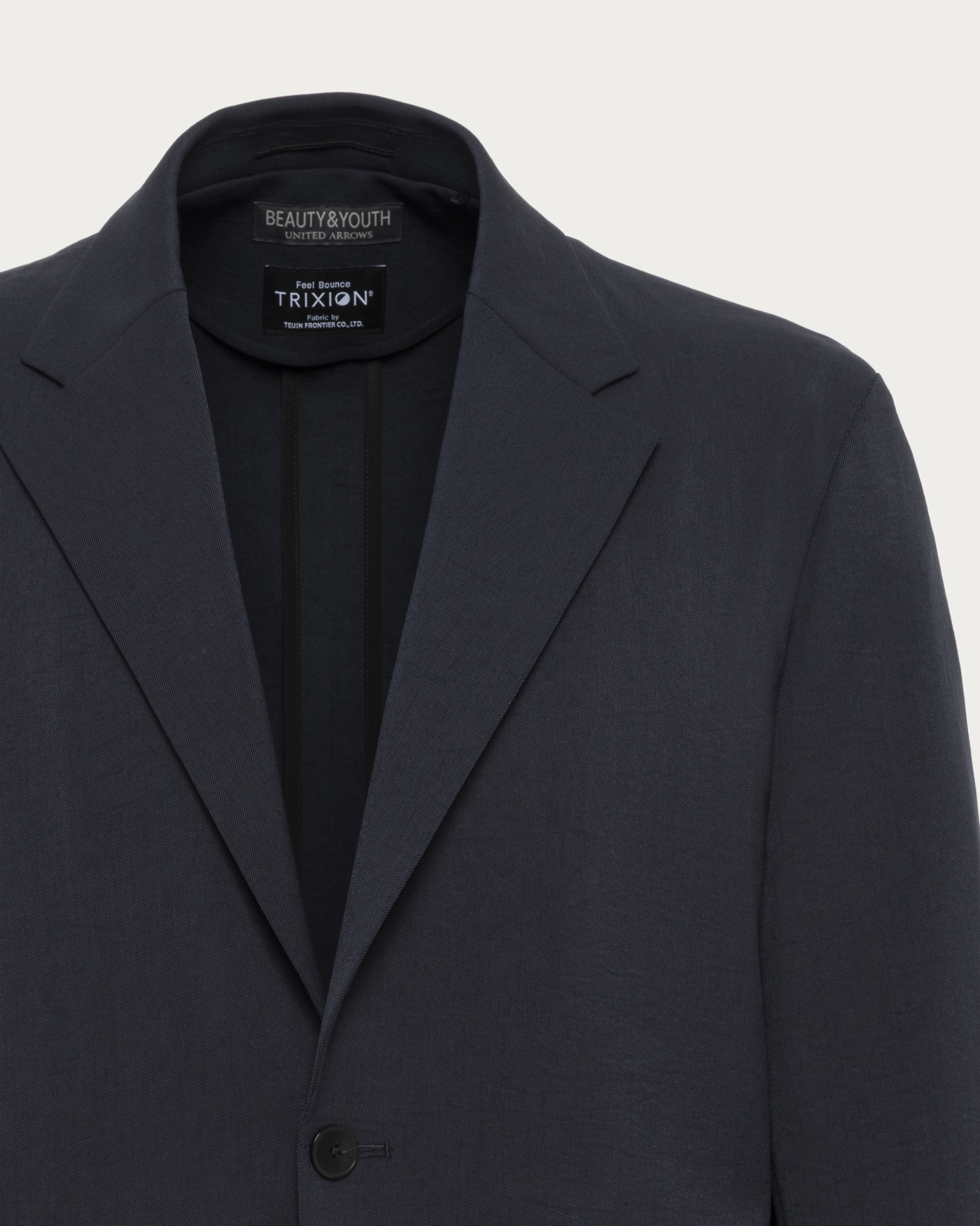 帝人フロンティア(株)に別注した「梳毛調合繊トリクシオン」を採用。ツイル織りにタテヨコで微妙に色を変えたシャンブレー生地が、奥行きのある立体的な色合いを演出。さらに特殊加工による微細なシワ感が、こなれた表情をプラスします。柔らかさと膨らみを兼ね備え、身体に優しくフィットする着心地も魅力。