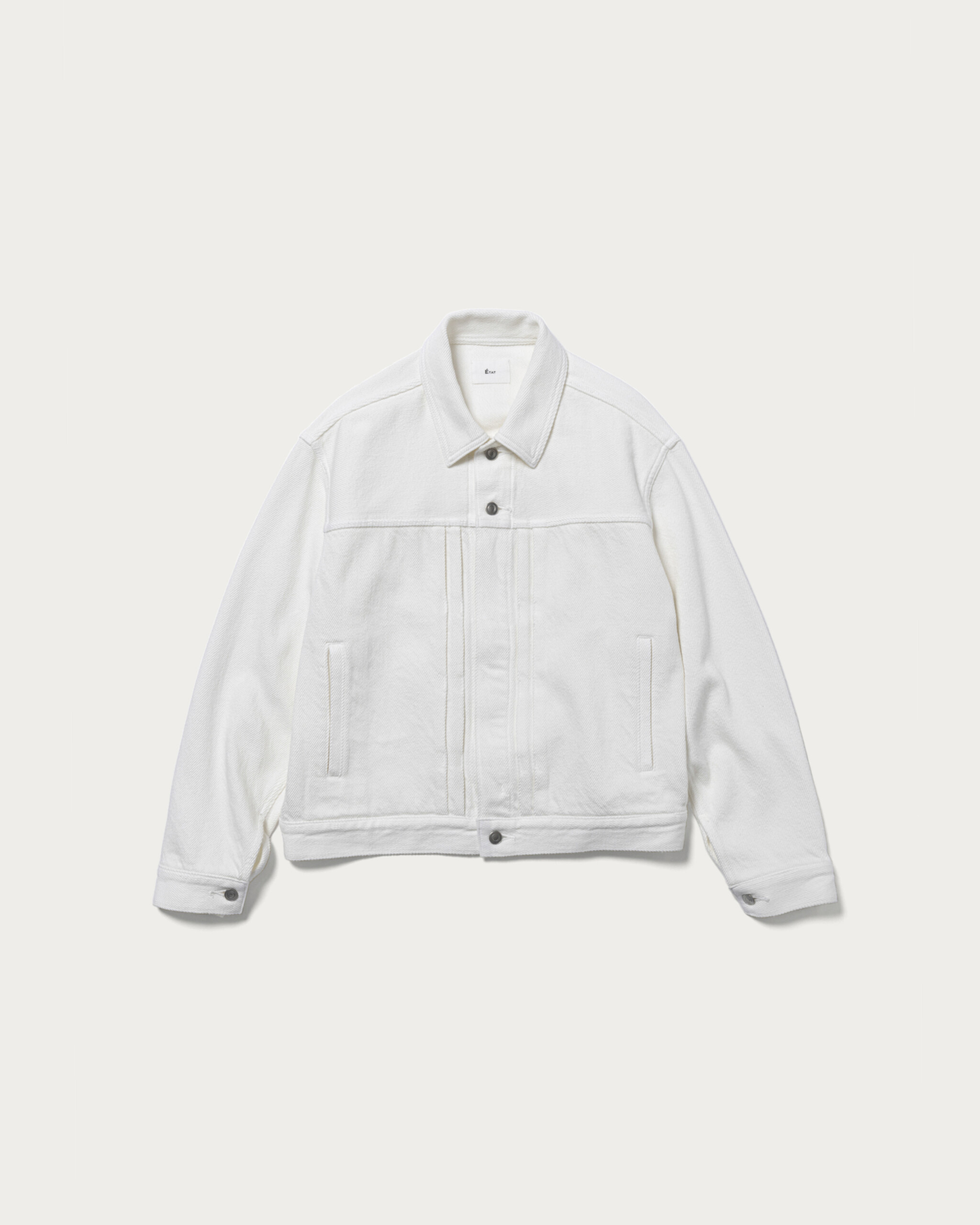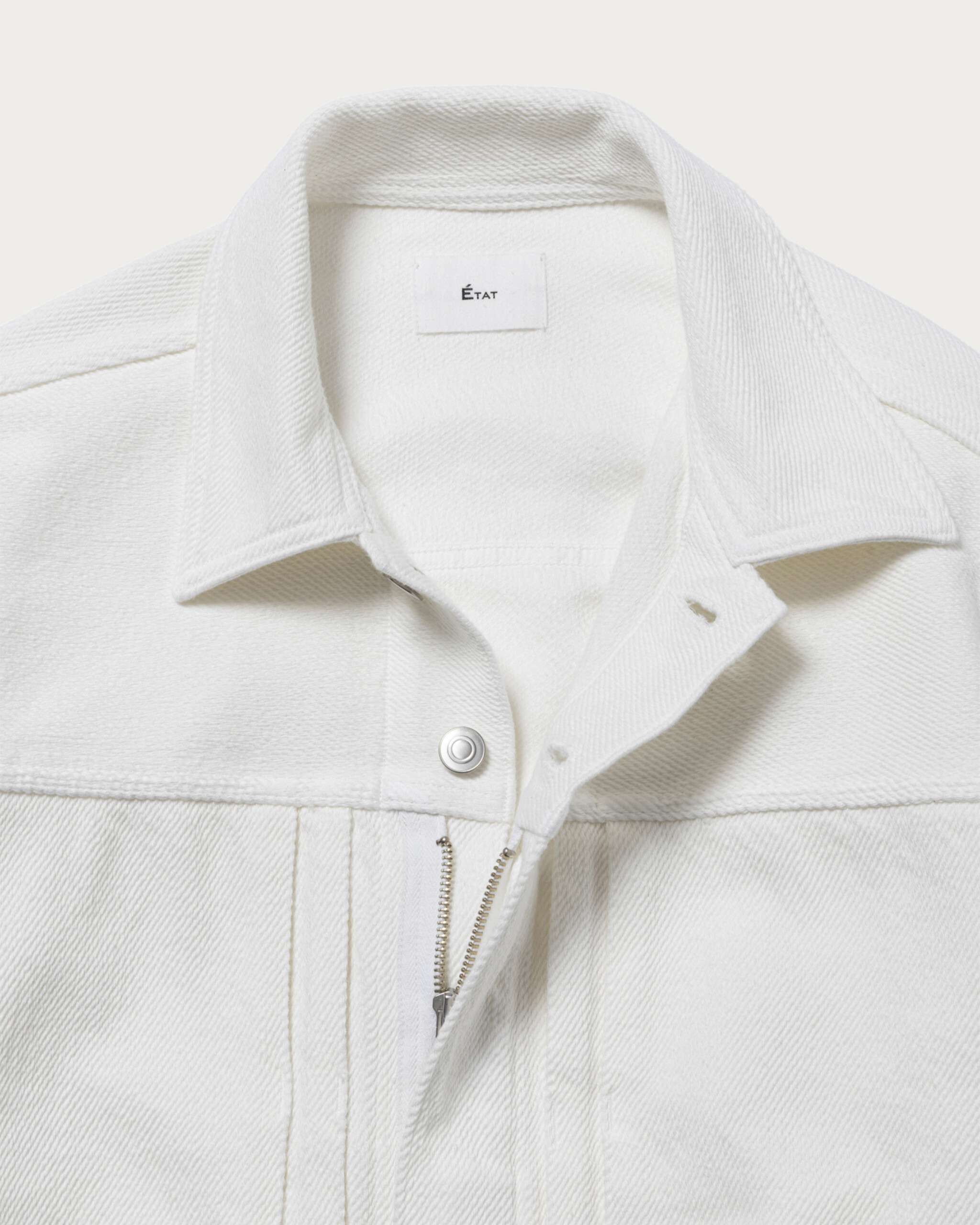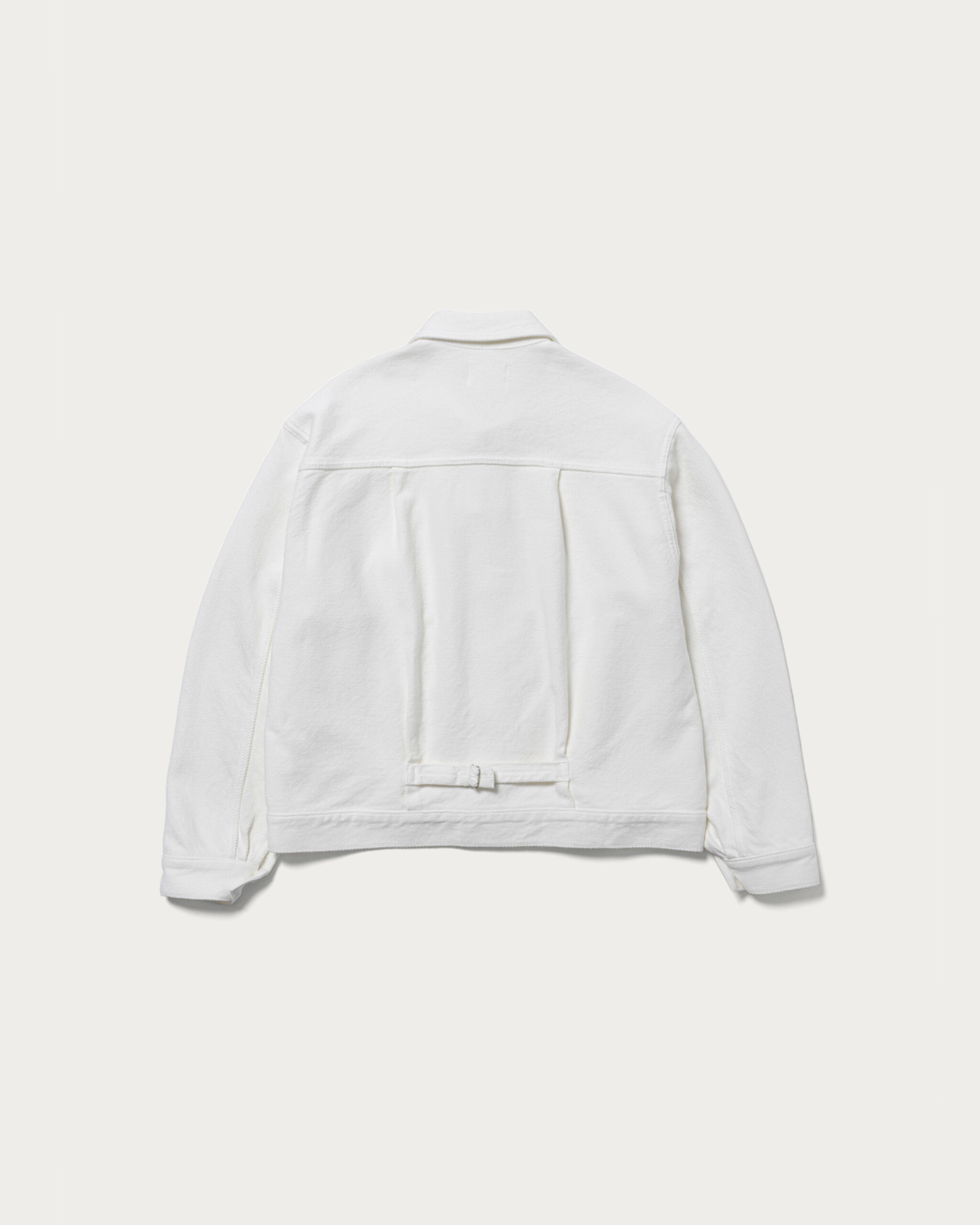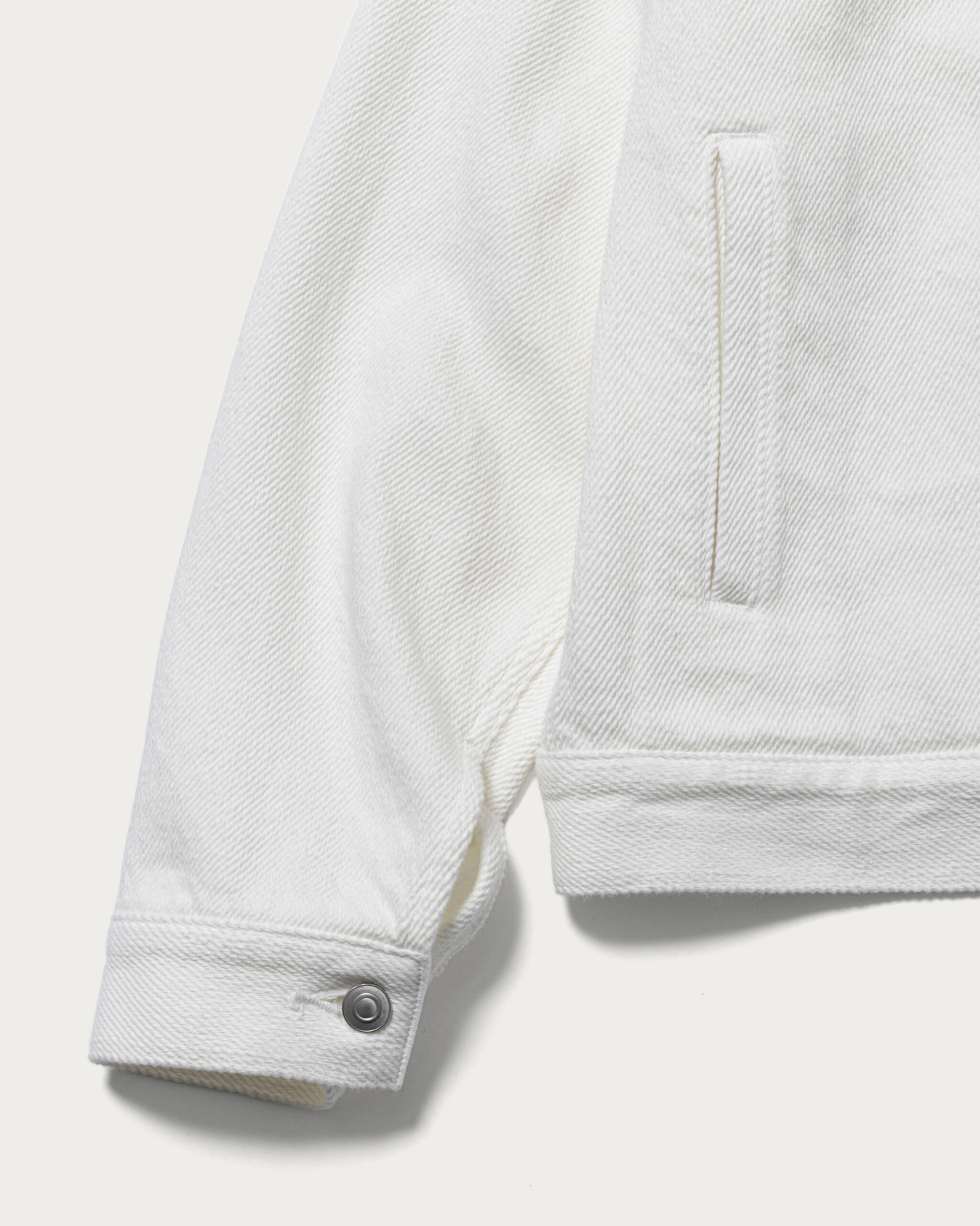 ブランド定番のセットアップをホワイトデニムで別注。経糸と緯糸にはオリジナル糸を使用し、綾目が太くなるように織り上げました。こうすることで斜めに畝が立ち、ふっくらと柔らかい風合いに。過度な加工を行なっていないのも特徴で、綿本来のナチュラルな色味が際立ちます。デニム素材でありながら、上品に見えるのはこの生地ならでは。