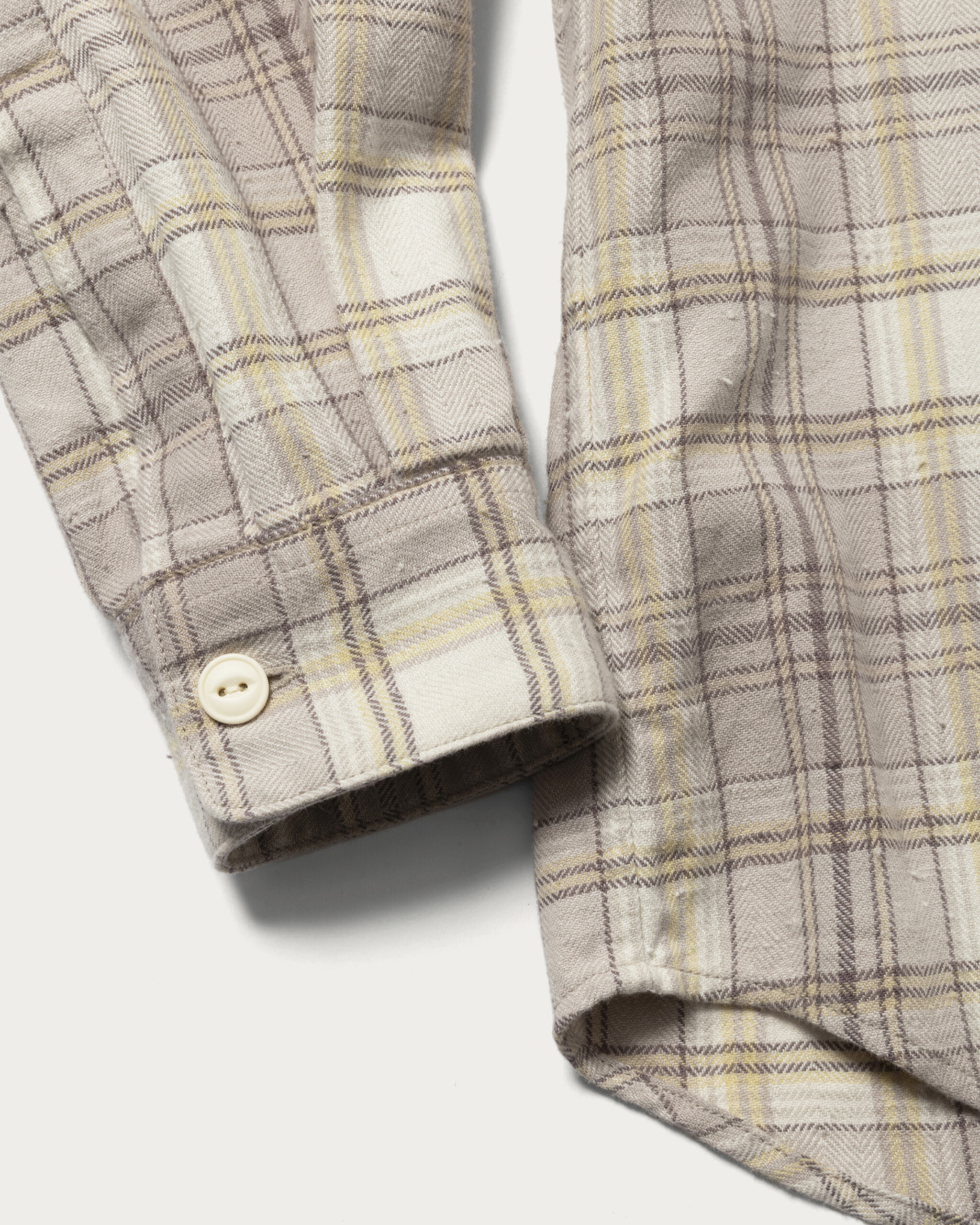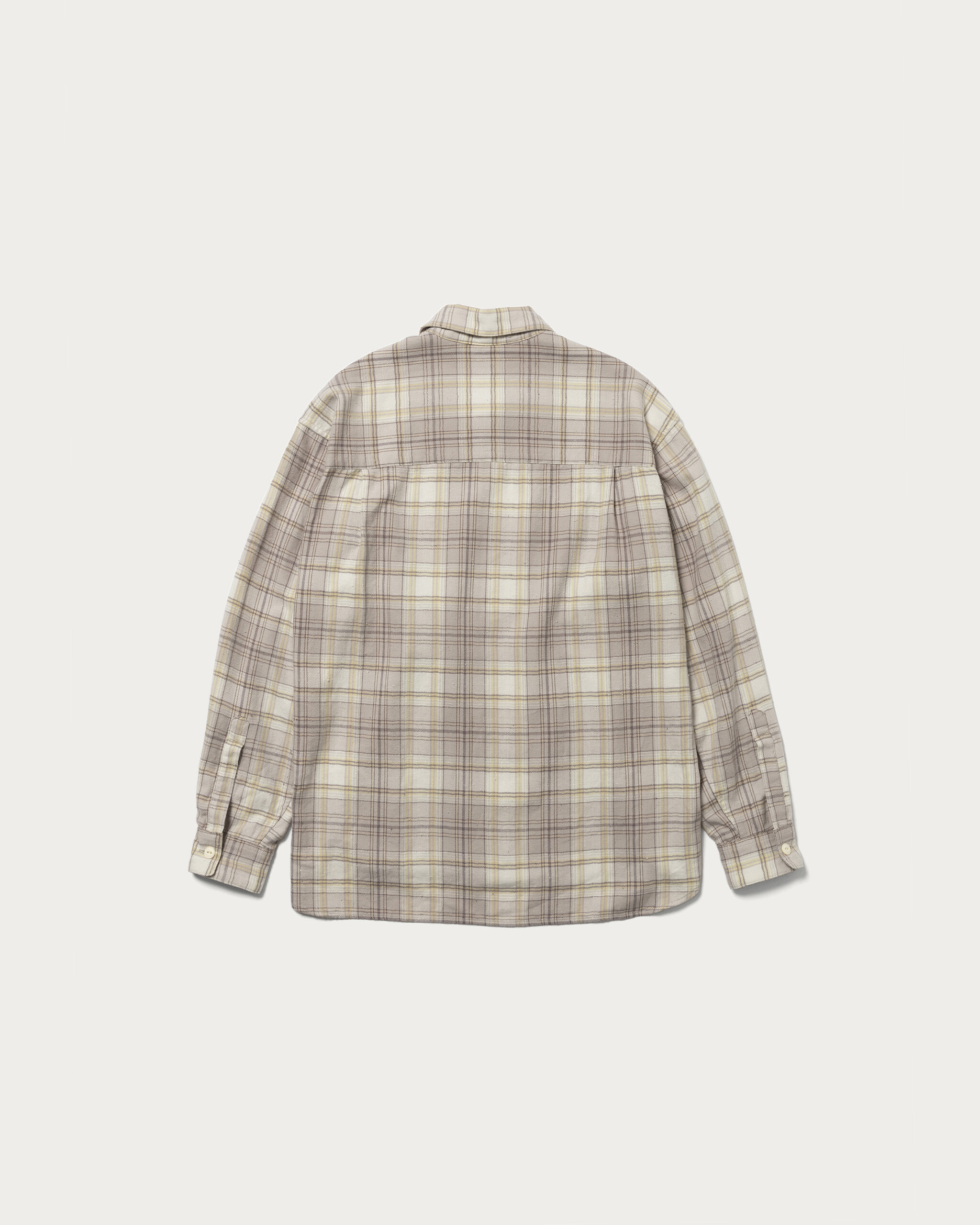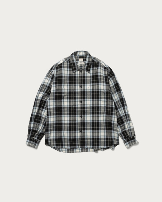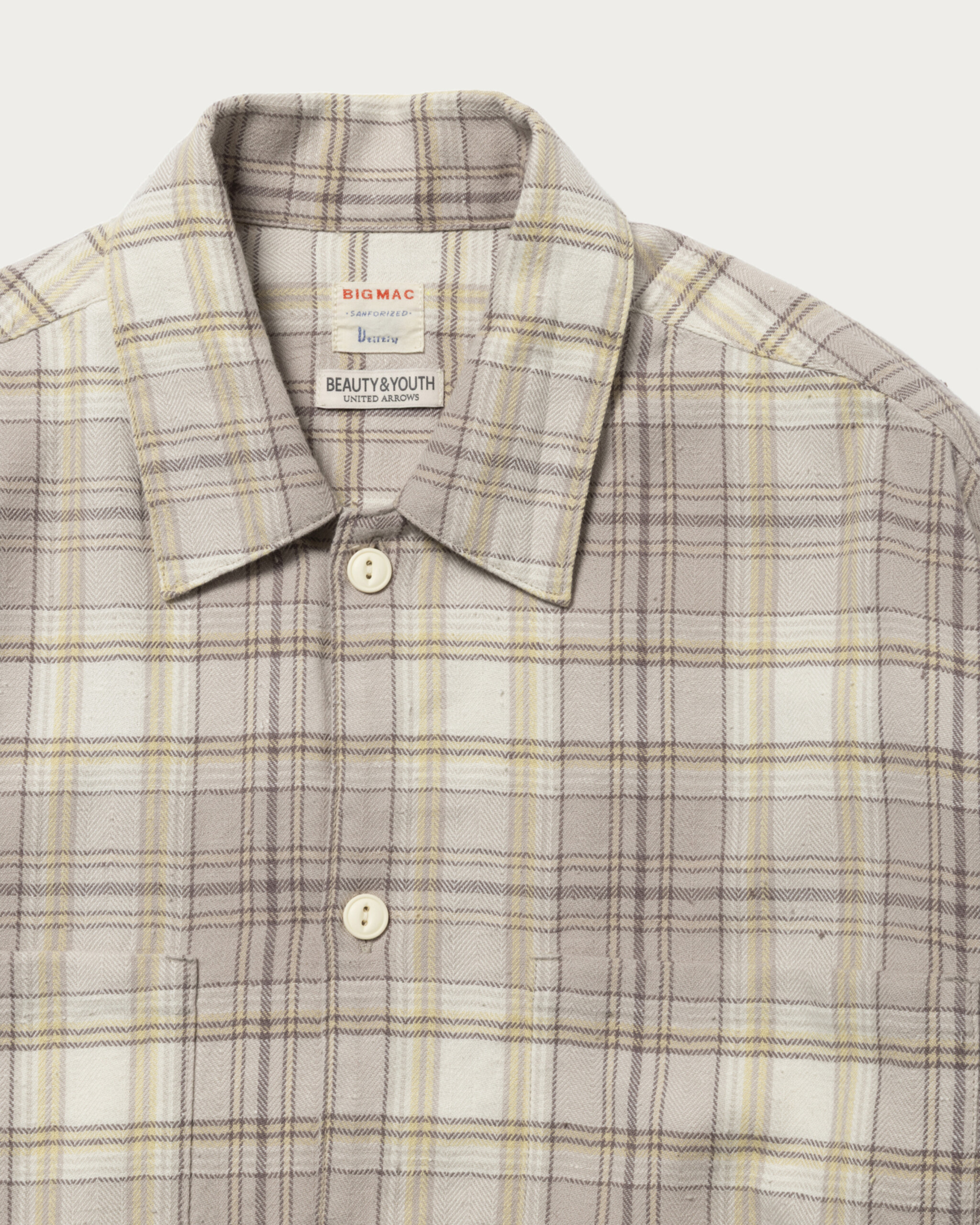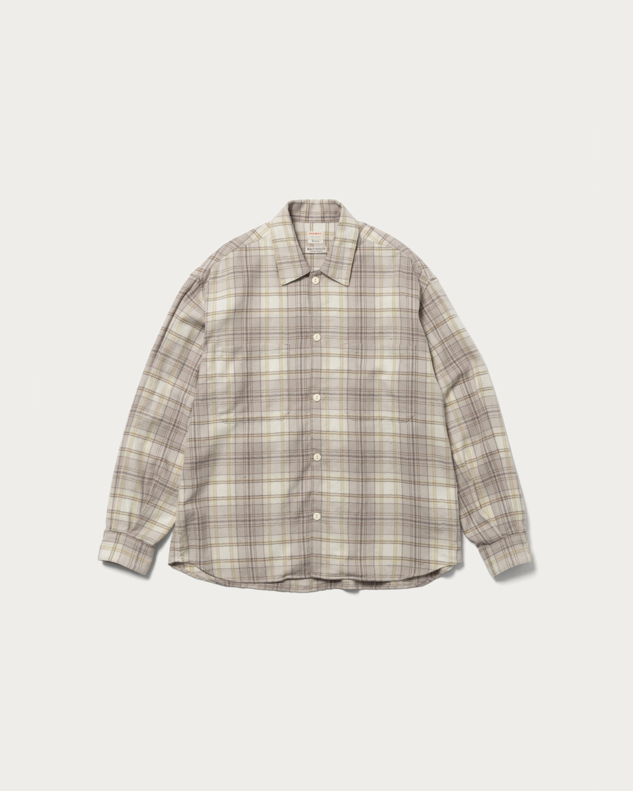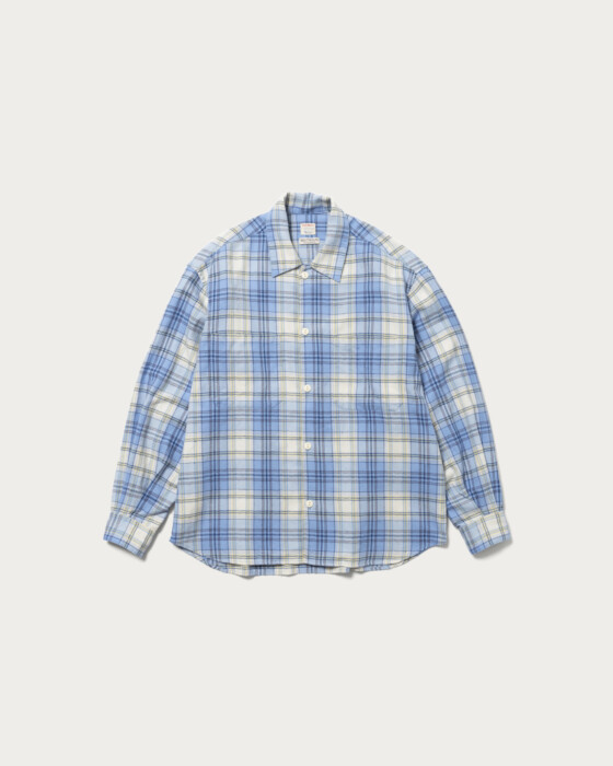 〈ビッグマック〉に別注をしたネルシャツは春の訪れを感じさせる配色にグッとくる。素材は軽やかなヘリンボーンチェックを採用。ネップによる凹凸のある表情とヴィンテージ感がうまく表現されています。ボタンはボディカラーに合わせ、猫目のボタンを選んでいるのも粋。着丈はジャストに、身幅を大きめにとったボックスシルエットで、街で着るネルシャツとして最適です。