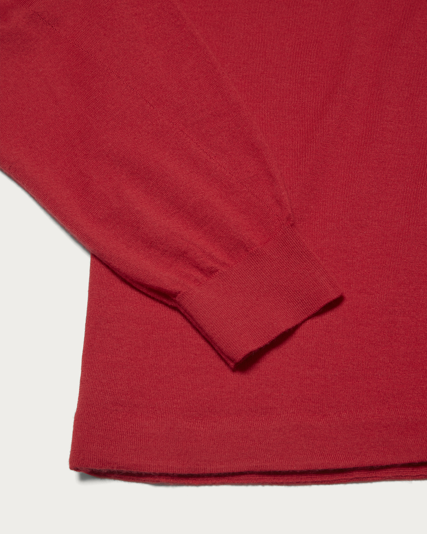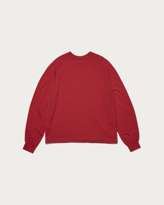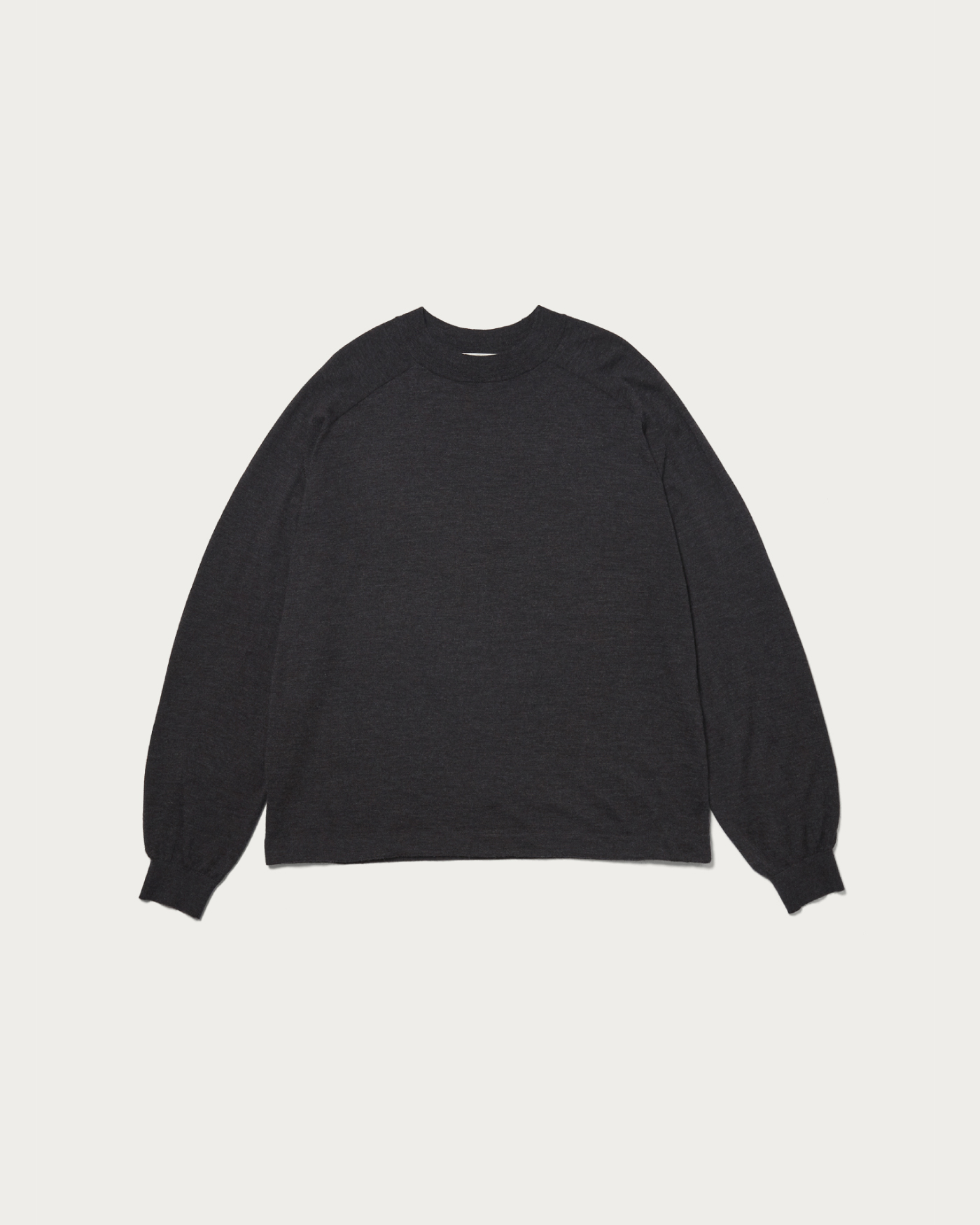 ニットウェアブランド〈OWNESS(オゥネス)〉が作る18ゲージのカシミヤニット。極めて繊細かつ高品質なウーステッドカシミアを使用し、上質な原料から生まれるしなやかな肌触りと非常に細かく編み込まれた目面が惚れ惚れするほど美しい。着丈は少し短めに、袖丈は長めに設定。こうすることで、着用時に袖リブに多くのクッションが溜まることを計算しました。一方の裾リブはあえて排し、ラフな雰囲気も持ち合わせますが、サドルショルダーでクラシックなムードはそのままに。