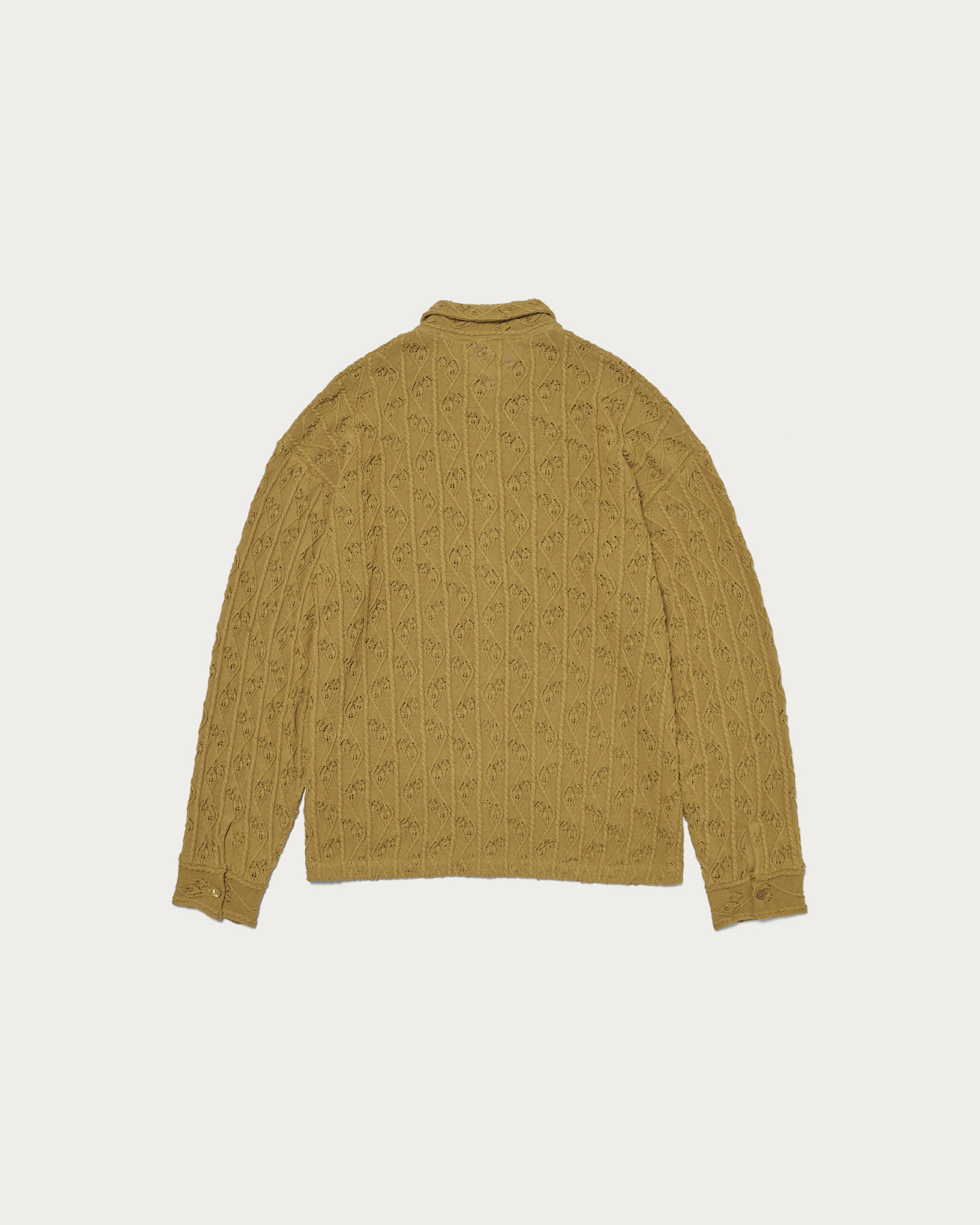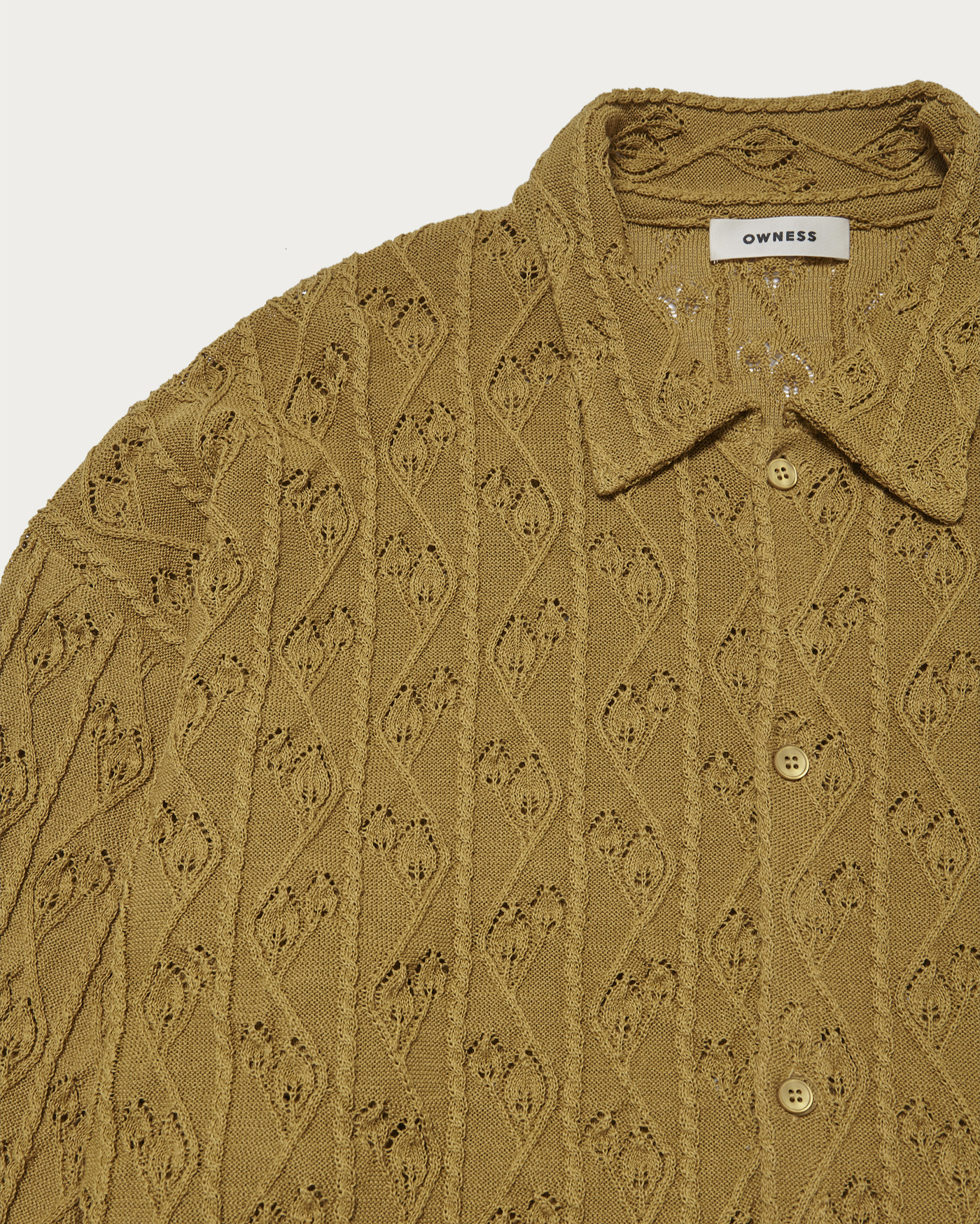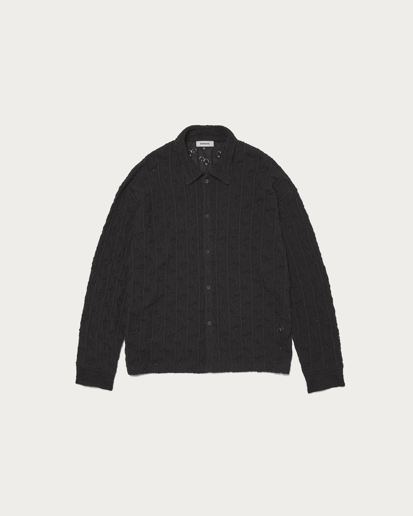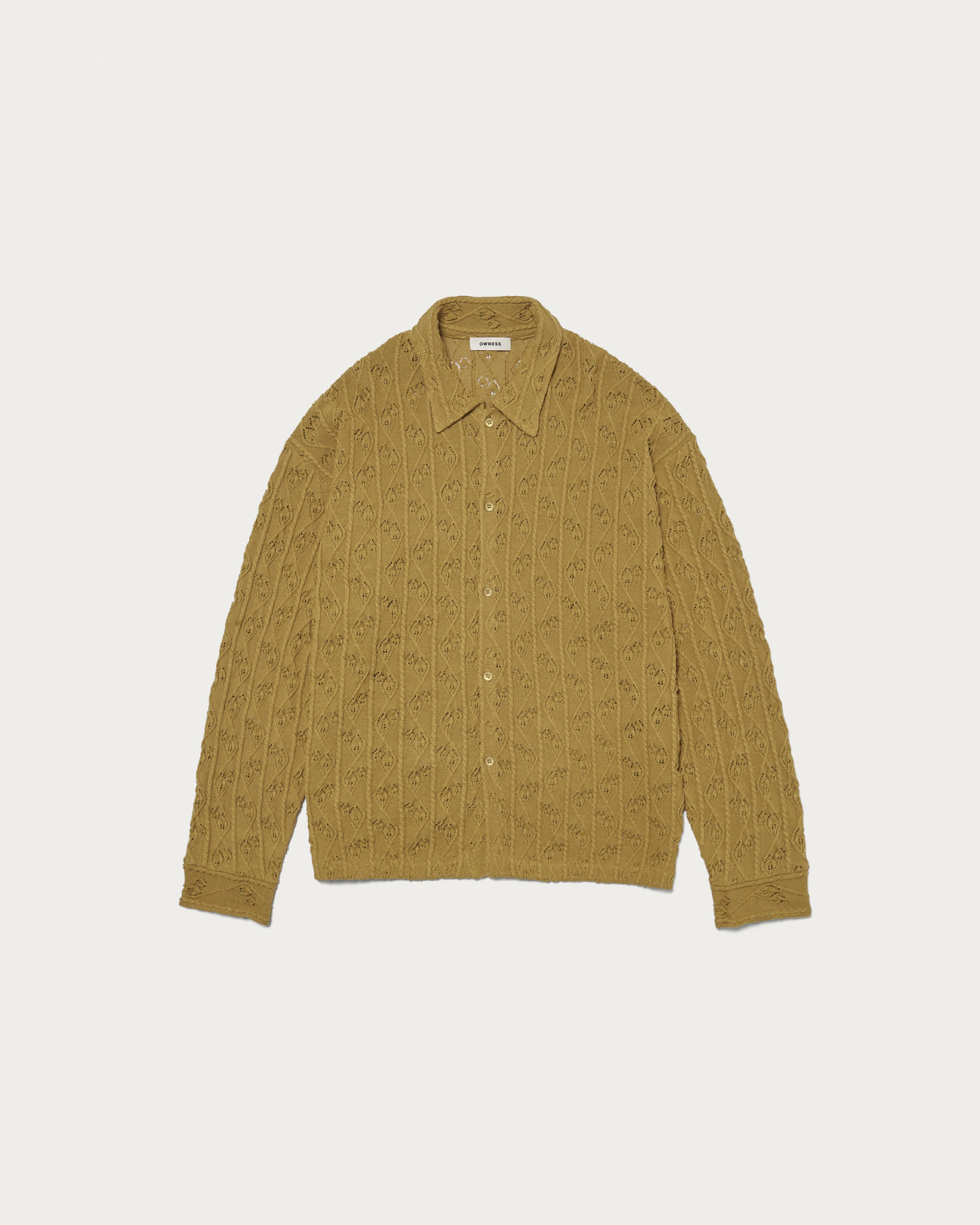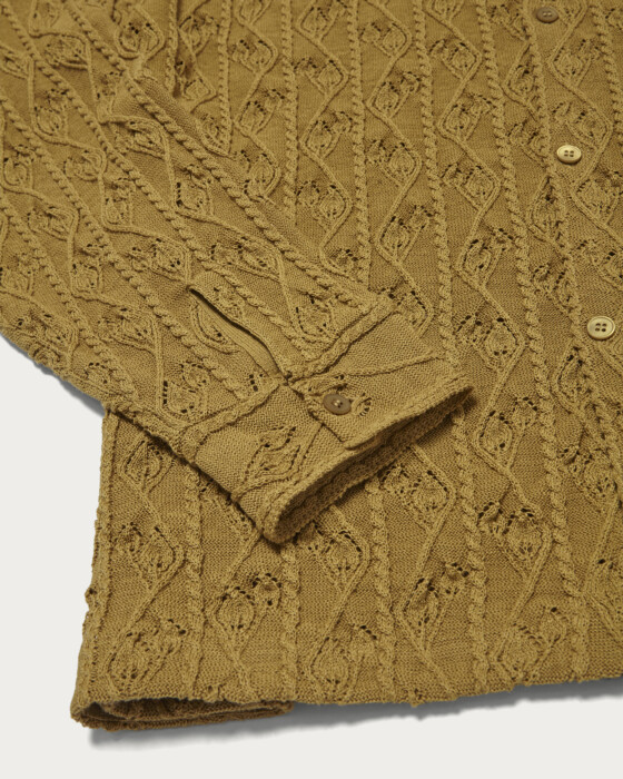 去年の秋冬から始動した〈OWNESS(オゥネス)〉。こちらのニットシャツは糸の段階でギマ加工を施しており、麻のようなドライな肌触りを演出しています。仕立てはニットをベースに、シャツの縫製を組み合わせているため、柔らかさの中に品の良さも感じられます。袖口はカフス仕様なのもシック。全体的にゆとりのあるシルエットで、ボディと同色のシェルボタンを採用し、いたってシンプルに仕上げました。