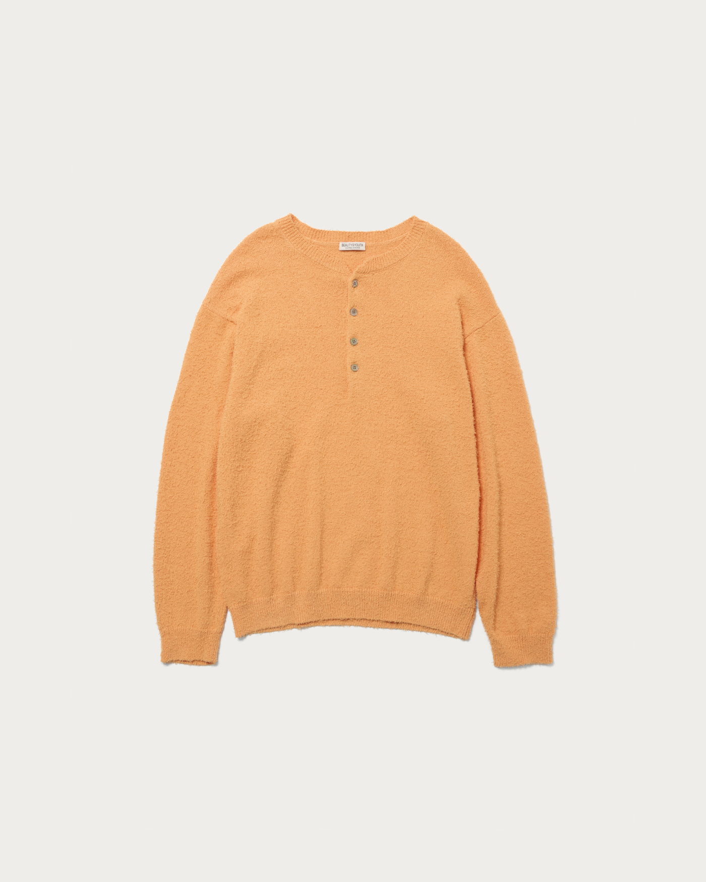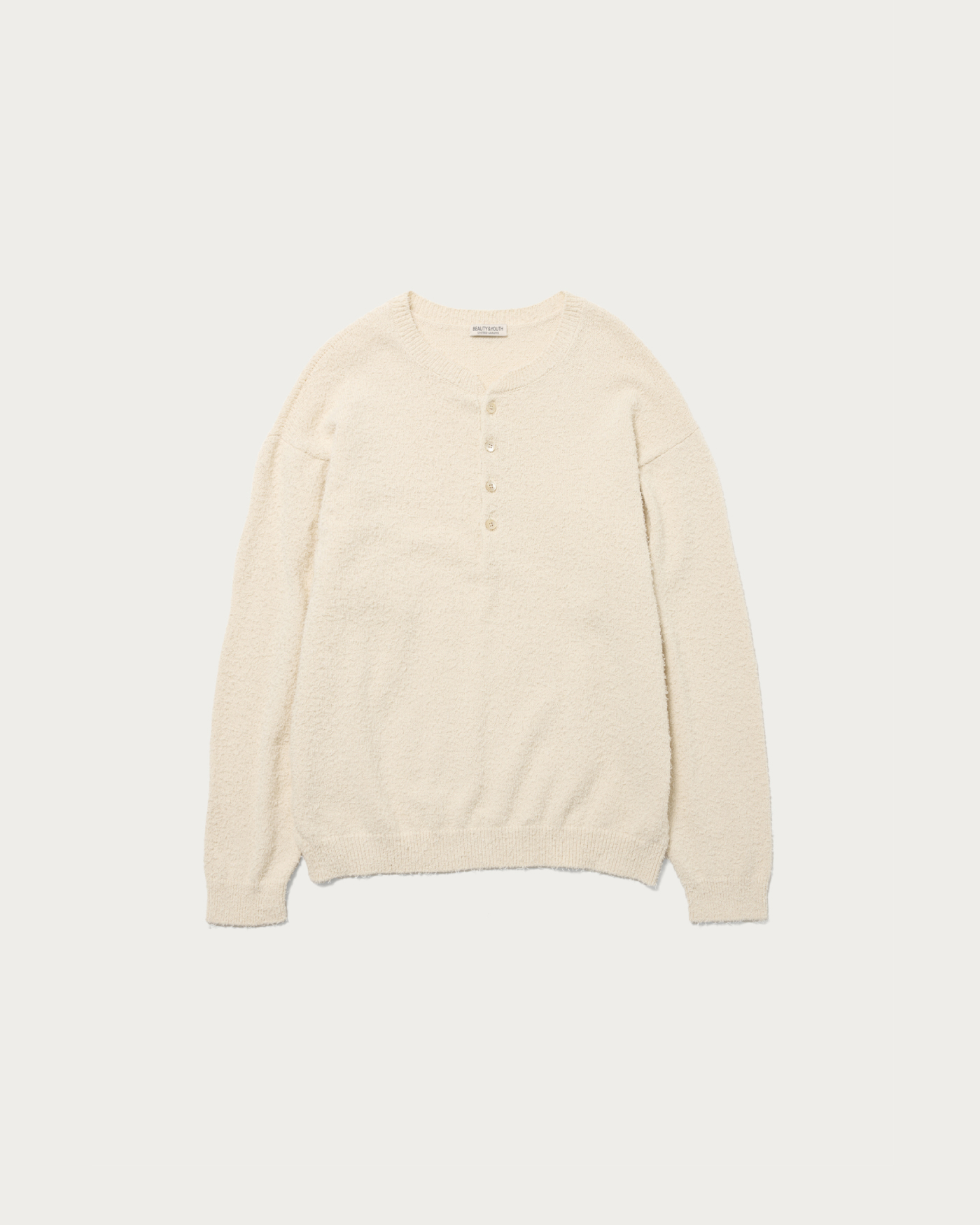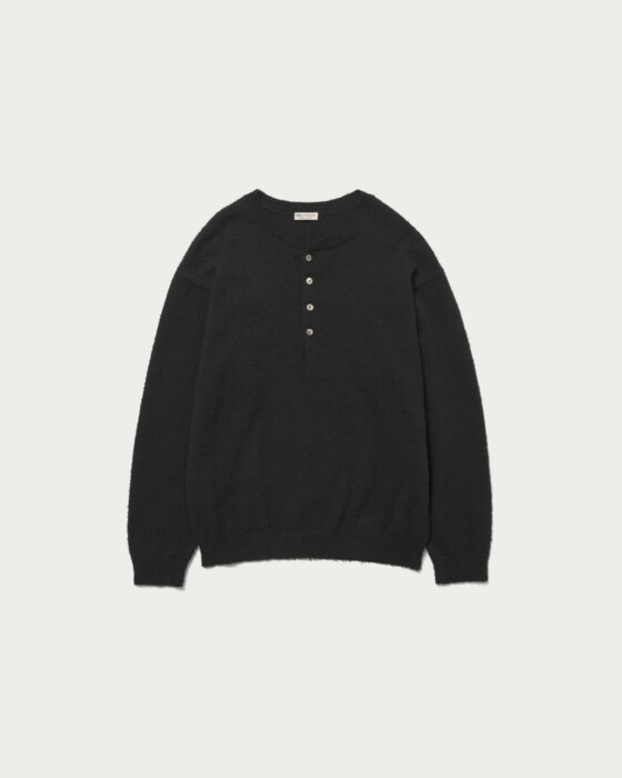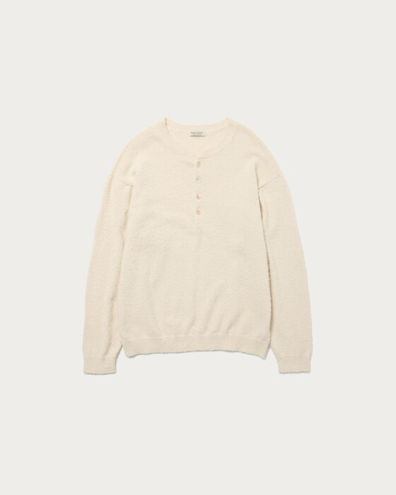 クルーネックに飽き飽きしてきた方におすすめしたいのがヘンリーネック。ツイストコットンとギマコットンの混紡生地を採用し、独特な表情と凹凸のある質感に。形はゆとりのある身幅に、袖と裾リブには強めのストレッチ糸を編み込んでいるため、綺麗なバルーンシルエットになり形も崩れにくい。春にぴったりなミドルゲージボディで、清涼感を感じさせてくれます。