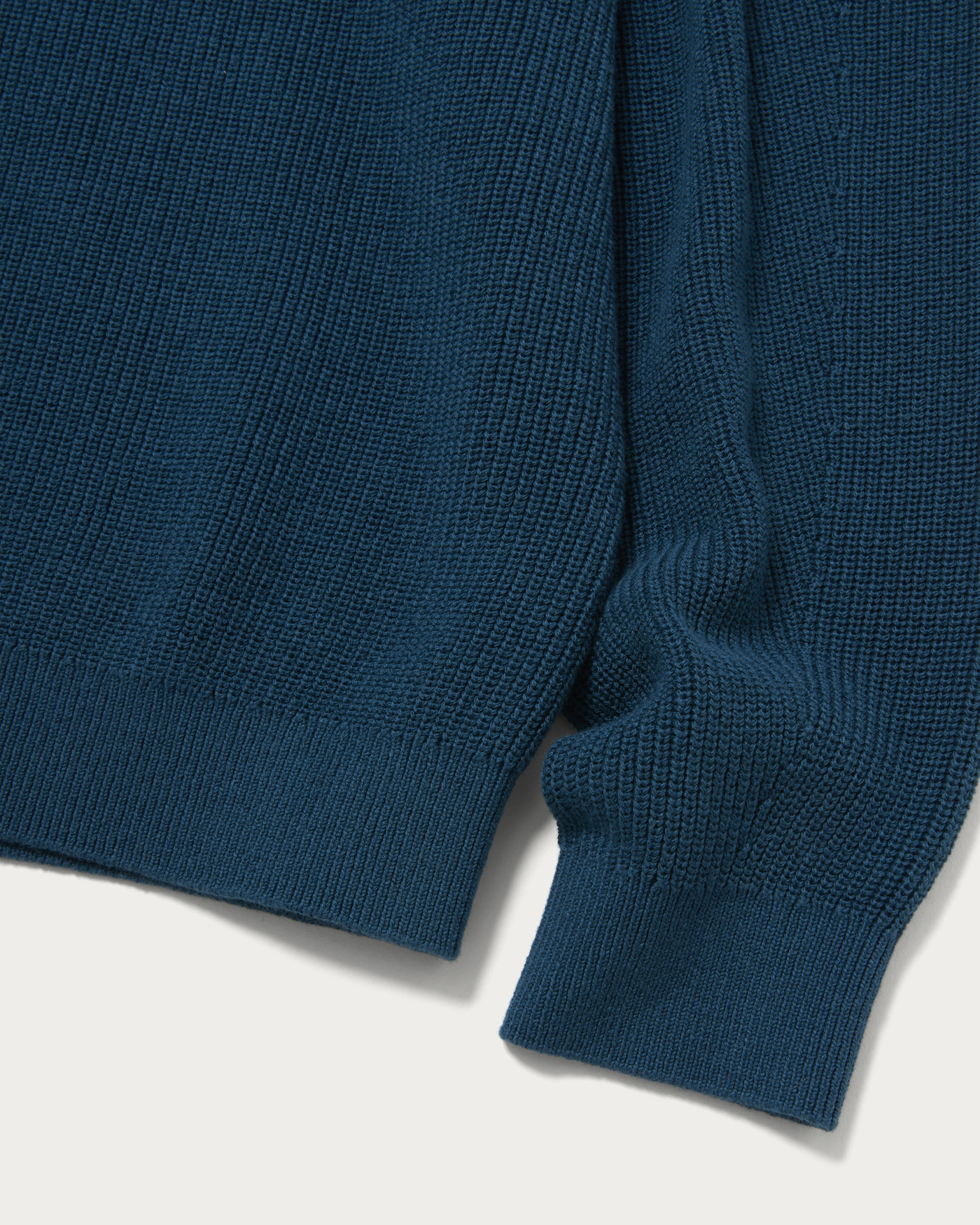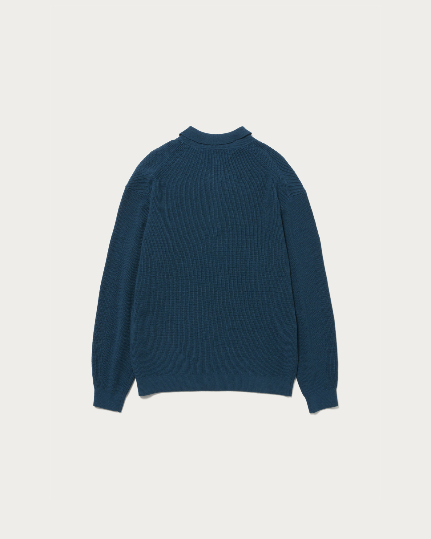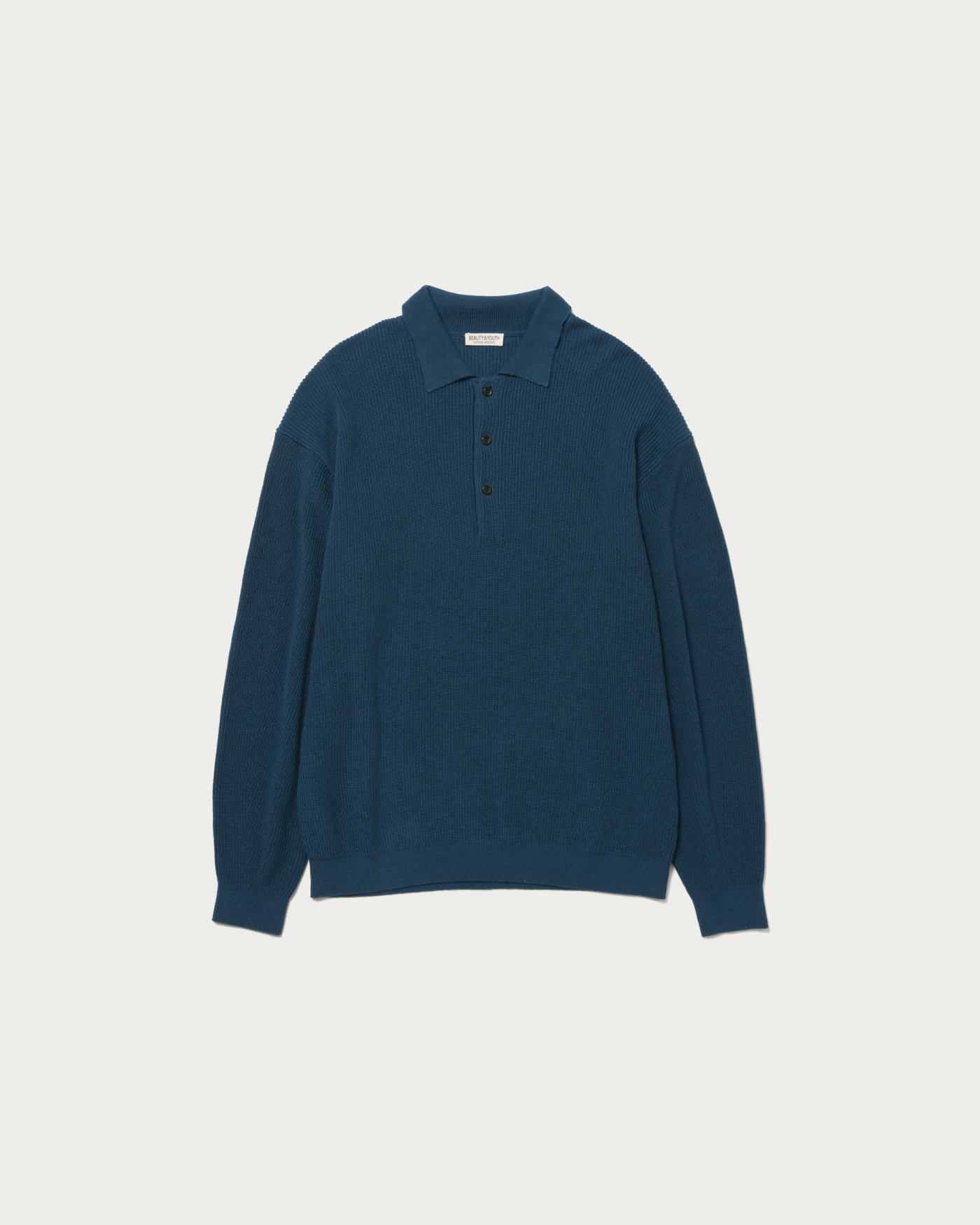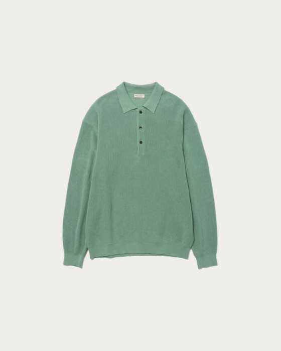 畦編みの中肉ボディで程よいゆとりを確保したフォルムシルエット。袖口・裾リブにストレッチを糸を編み込み補強。シンプルで品よく来ていただける1品です。麻のような乾いた質感を生み出すギマ加工を施したギマコットンを採用しました。