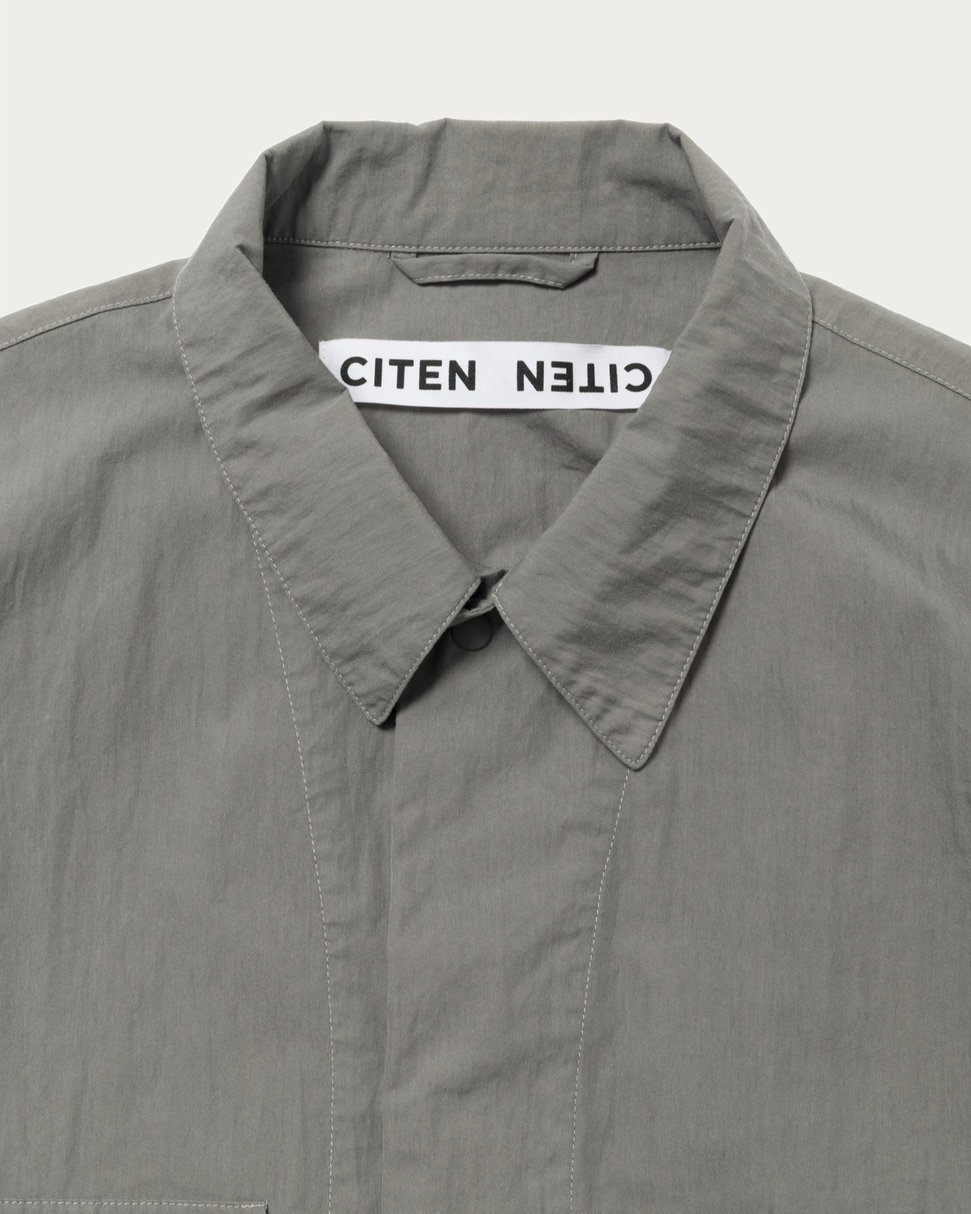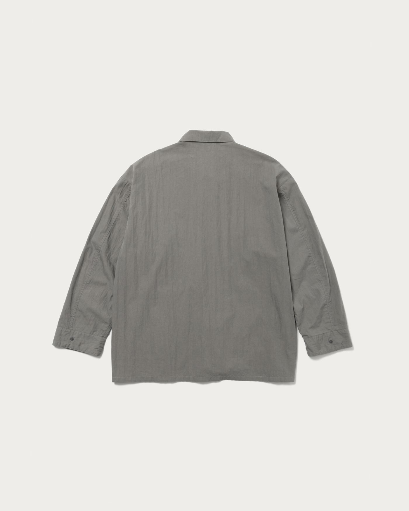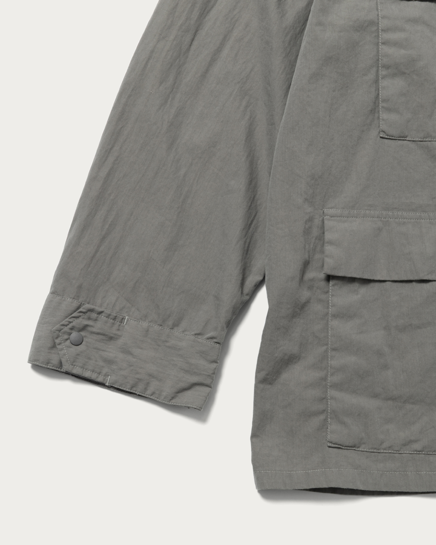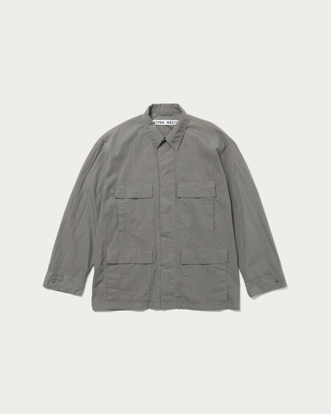 定番のコットンナイロン素材を使用したミリタリーシャツ。ボックスシルエットに大きく配置されたポケットは、遊び心と大胆な印象を持たせています。