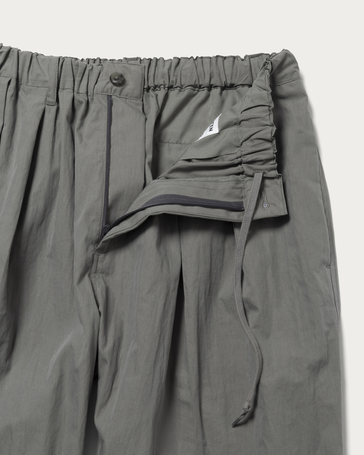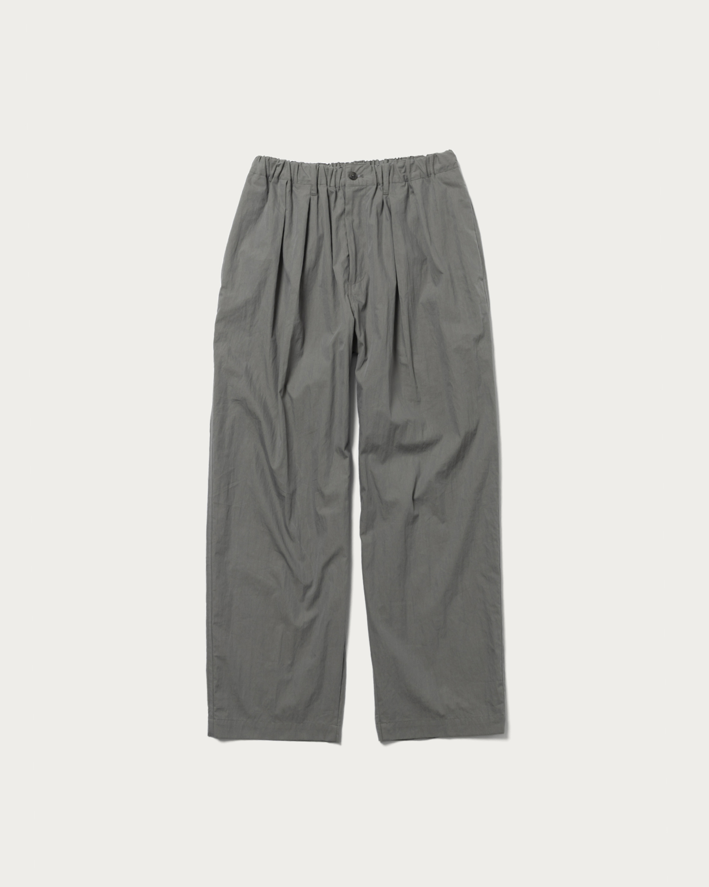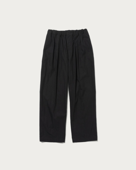 コットンナイロン素材を使用したイージーパンツ。ウエストから裾までゆとりを持たせたフォルムが特徴。ウエストのゴムとスピンドルが着こなしの幅を広げます。またフロントに入ったプリーツとクリースラインがイージーパンツ仕様ながらもキレイなフォルムにまとめてくれます。
