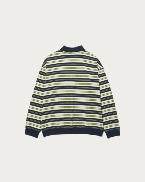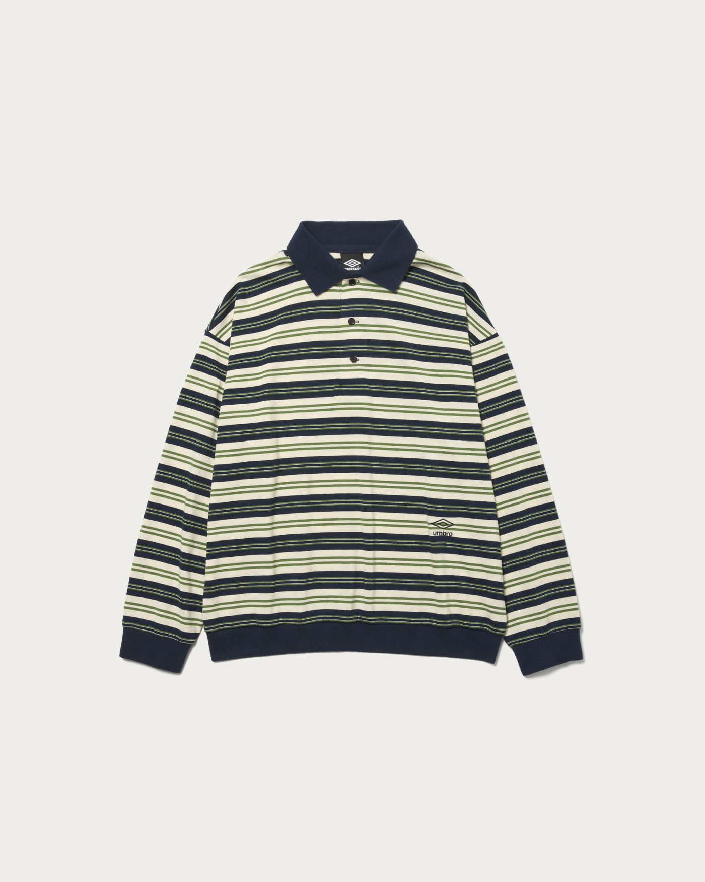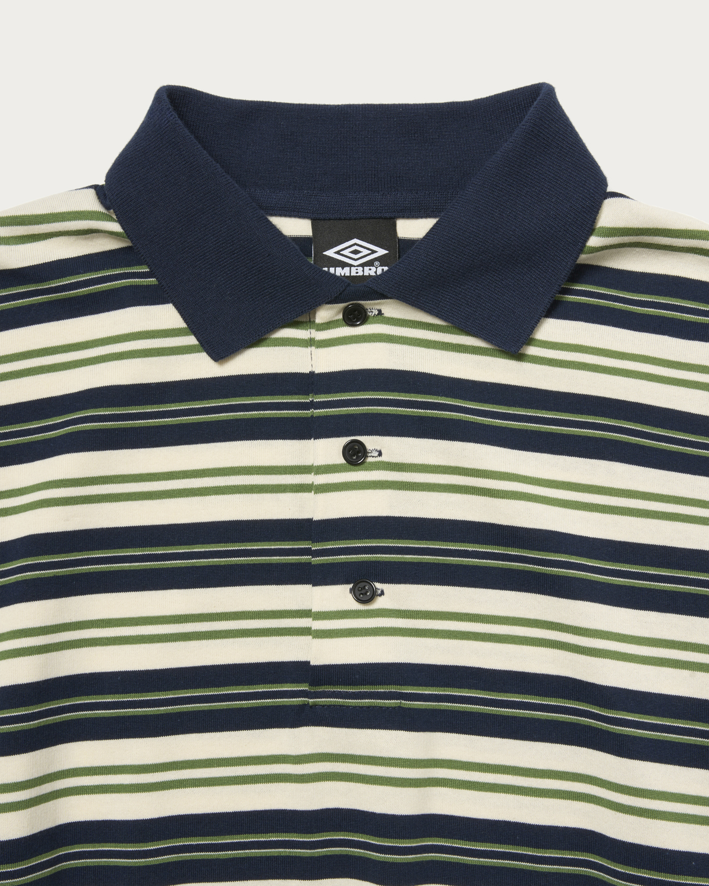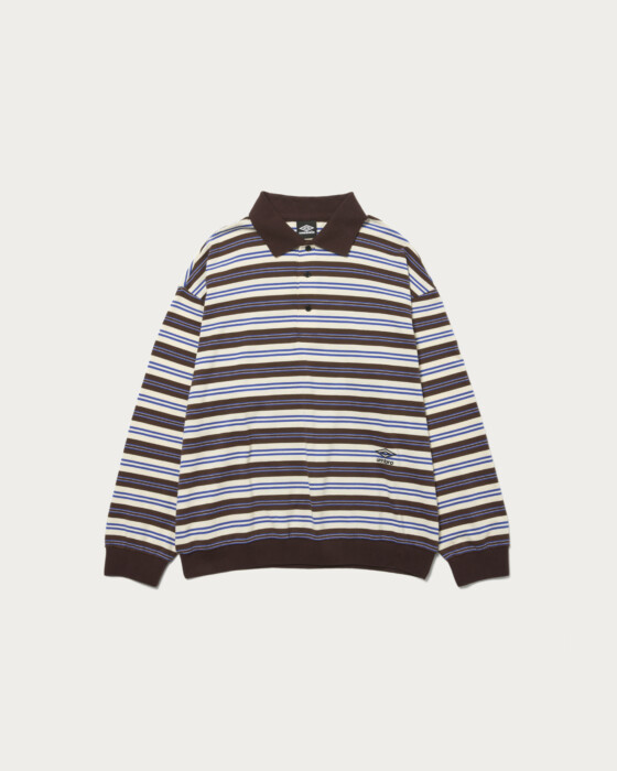 「OUT OF THE PITCH」をコンセプトに、〈UMBRO(アンブロ)〉のアーカイブをベースに現代的に再構築した別注コレクション。アーカイブのゲームシャツに見られる襟型を踏襲し、スポーツのエッセンスを感じさせるボーダーポロに落とし込みました。すっきりとした着丈とワイドなボディバランスにより、一枚で存在感を放つデザインに仕上げている。