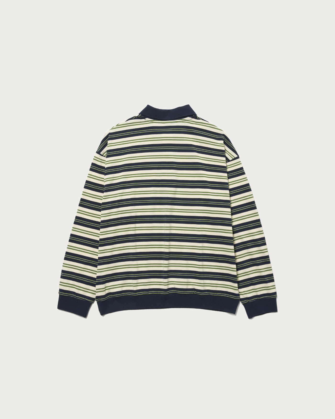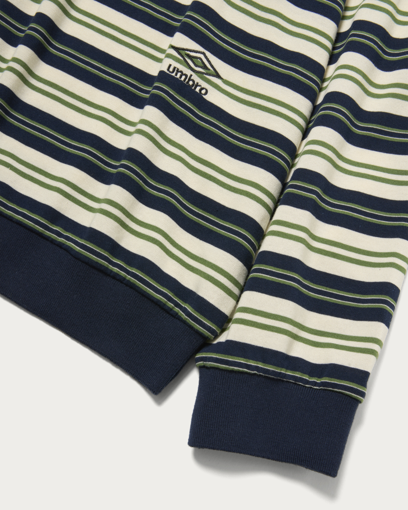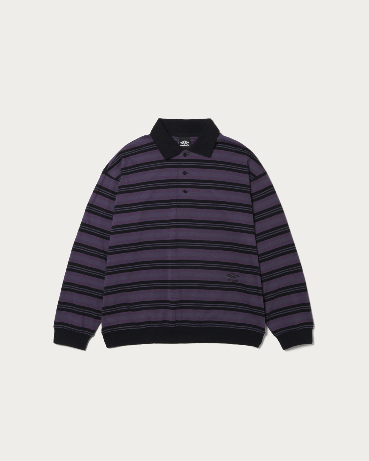 「OUT OF THE PITCH」をコンセプトに、〈UMBRO(アンブロ)〉のアーカイブをベースに現代的に再構築した別注コレクション。アーカイブのゲームシャツに見られる襟型を踏襲し、スポーツのエッセンスを感じさせるボーダーポロに落とし込みました。すっきりとした着丈とワイドなボディバランスにより、一枚で存在感を放つデザインに仕上げている。