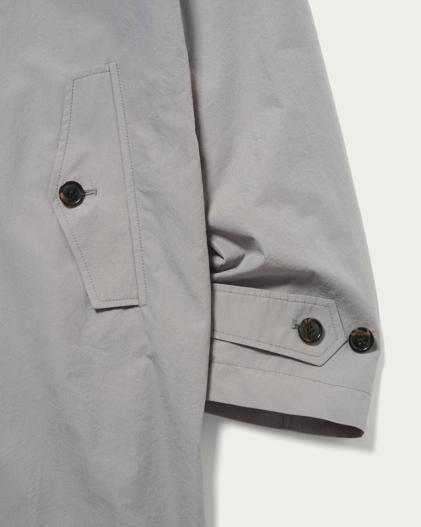 知る人ぞ知る名品、〈BARACUTA(バラクータ)〉の「G10(ステンカラータイプ)」をベースに別注。現行モデルとは異なるアーカイブに着目し、動きやすさを考えた、切り替え入りのラグラン袖を採用しました。腕の可動域と、すっきりとした見た目を両立しています。さらにサイズバランスを一から見直し、カジュアルからドレススタイルまで対応する、モダンで汎用性の高いフィット感に仕上げているのもポイント。袖のロゴ刺繍や、ブランドロゴの台座部分にブランドを象徴するフレイザータータンを配すなど、随所にスペシャルなカスタムを施しました。