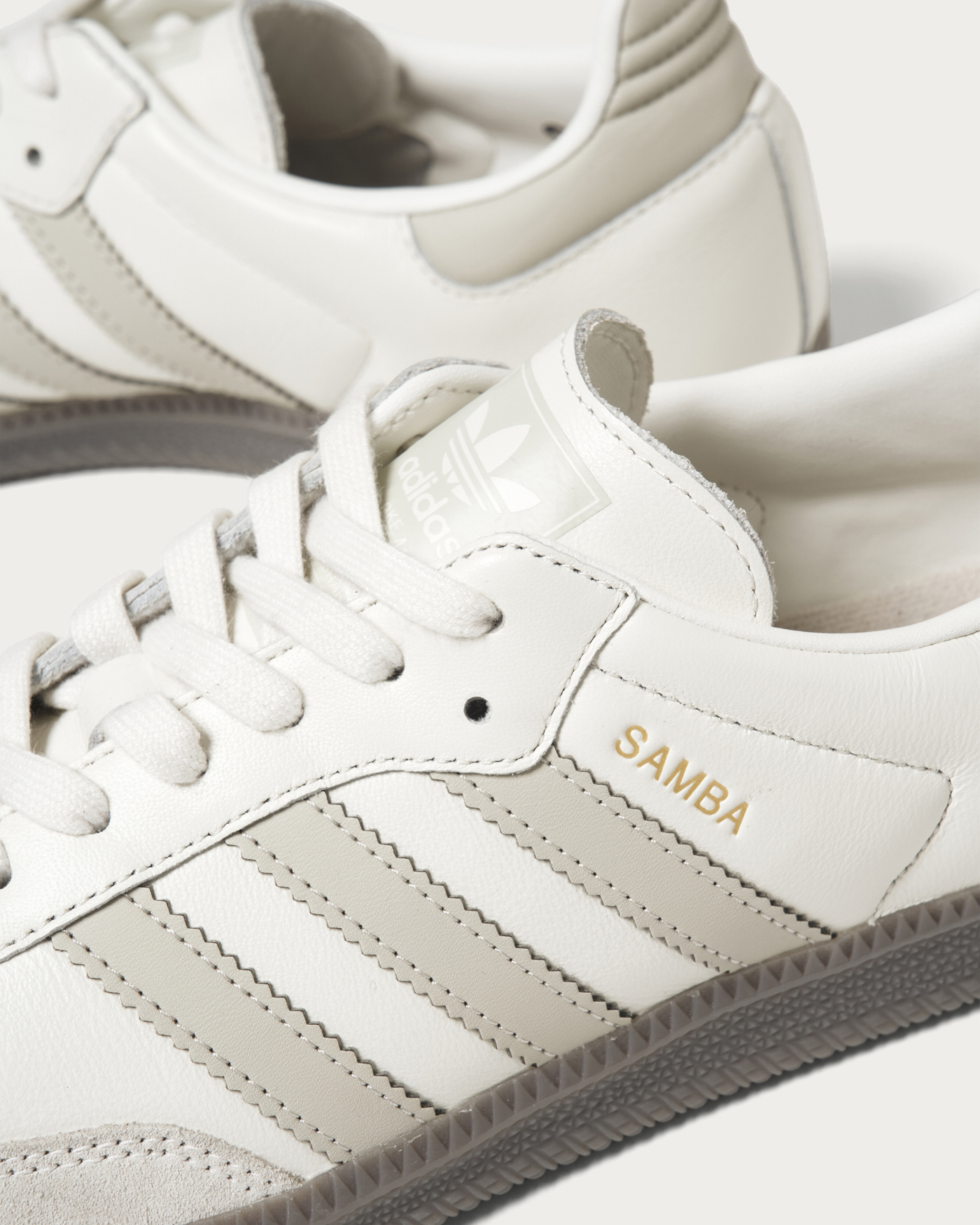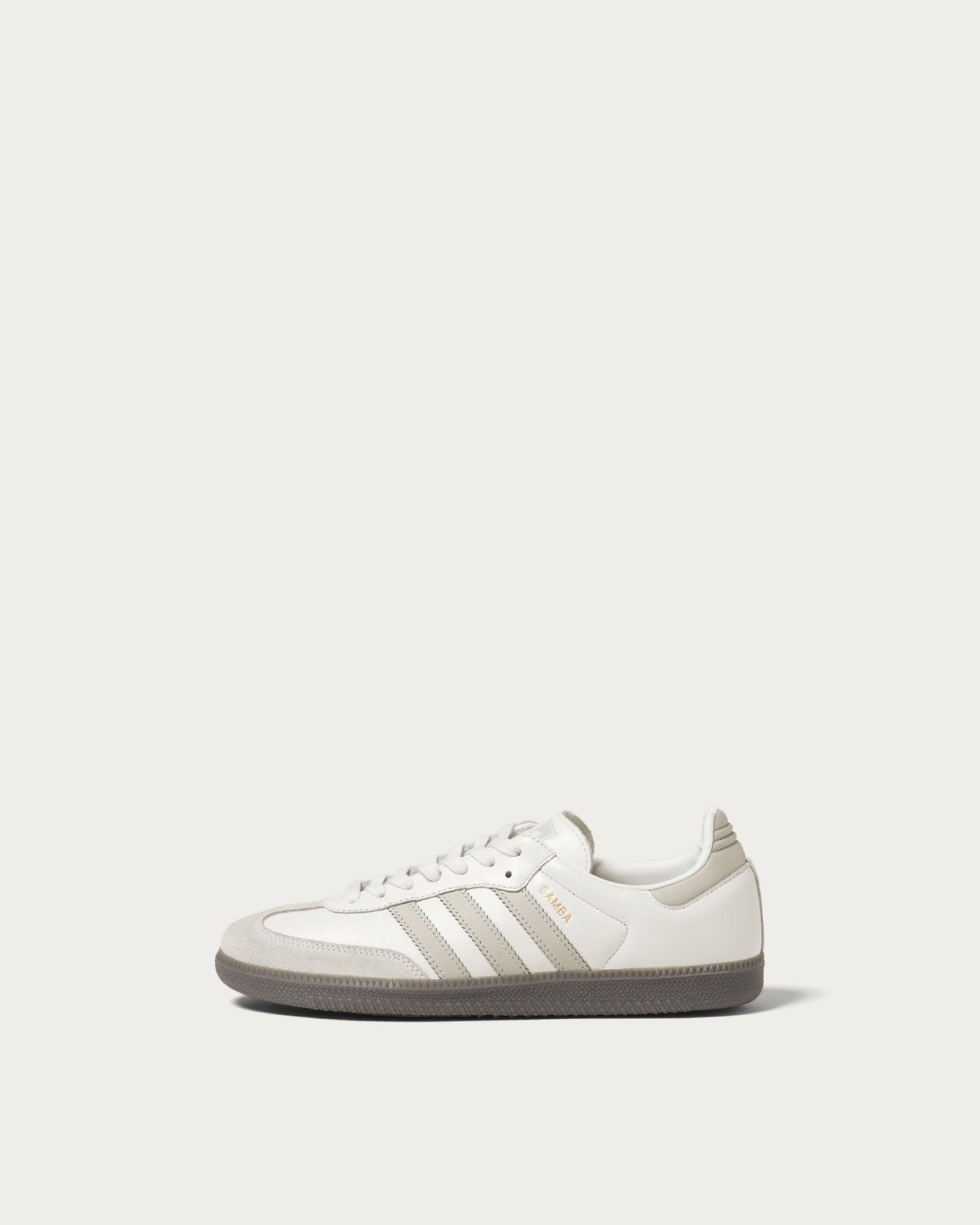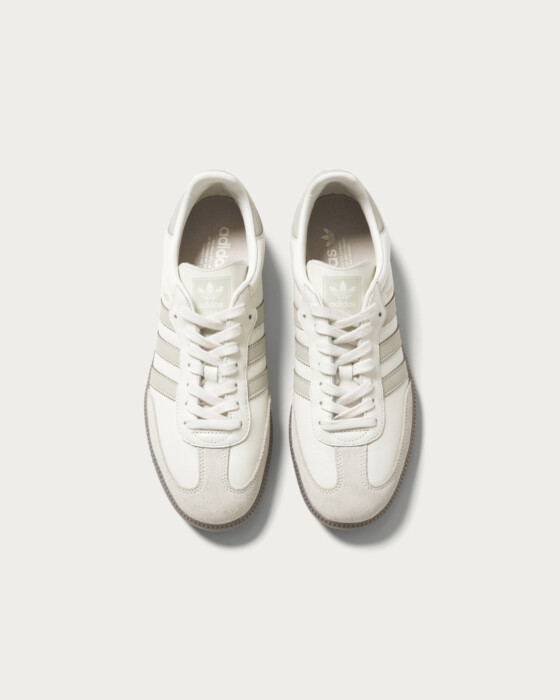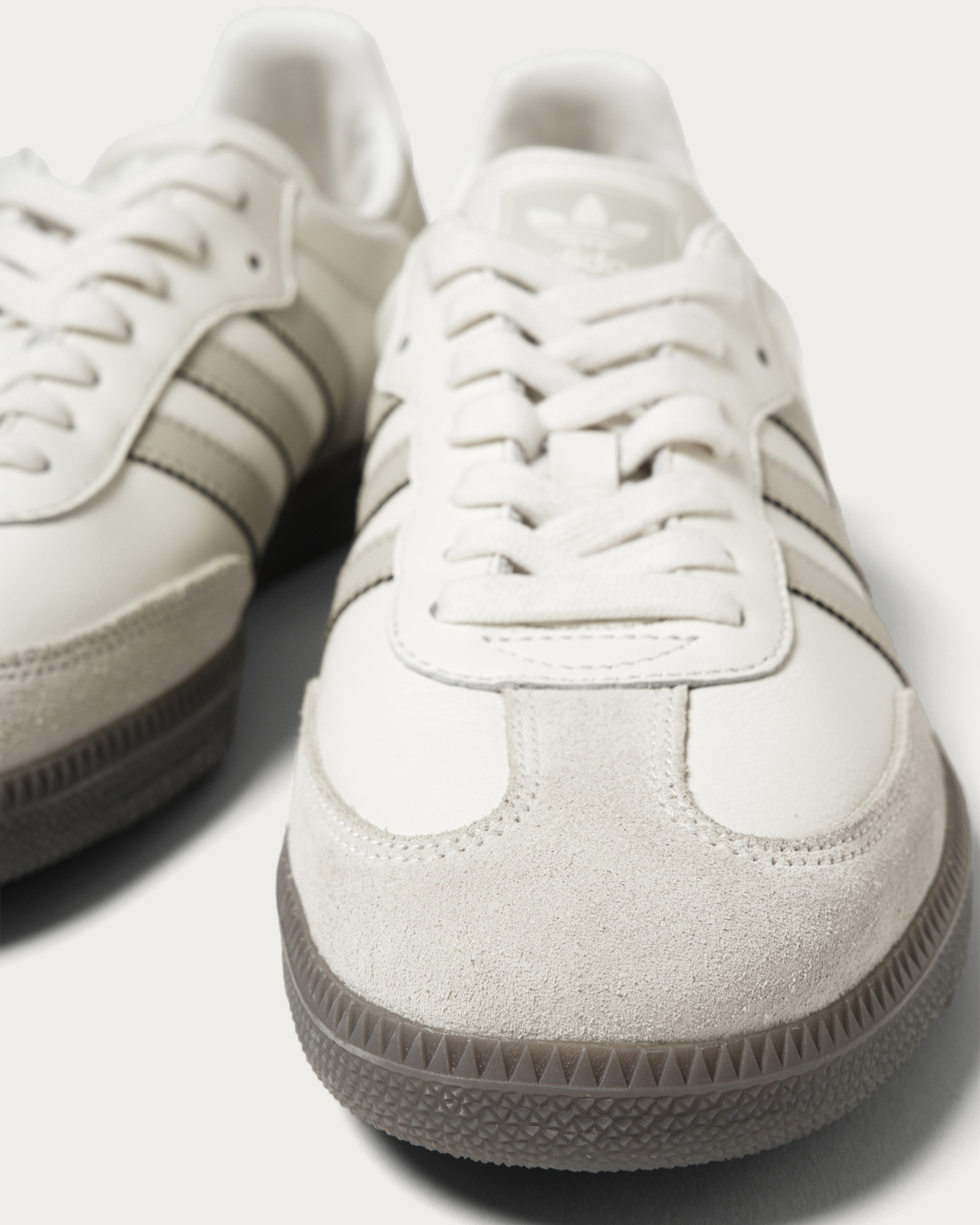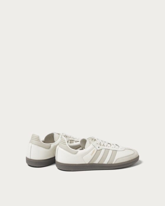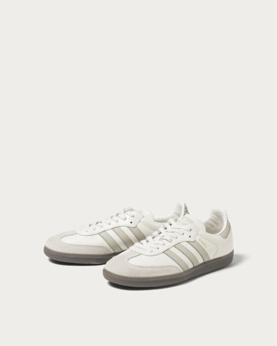 〈adidas Originals(アディダス オリジナルズ)〉別注のSAMBA OG。豊富なカラーバリエーションを持つ中で、あえてありそうでなかったニュアンストーンを採用。控えめながら存在感のある色合いで、どんなスタイリングにも馴染む配色にこだわりました。オフホワイトをベースに、温かみのあるグレーを組み合わせ、都会的な表情に仕上げています。