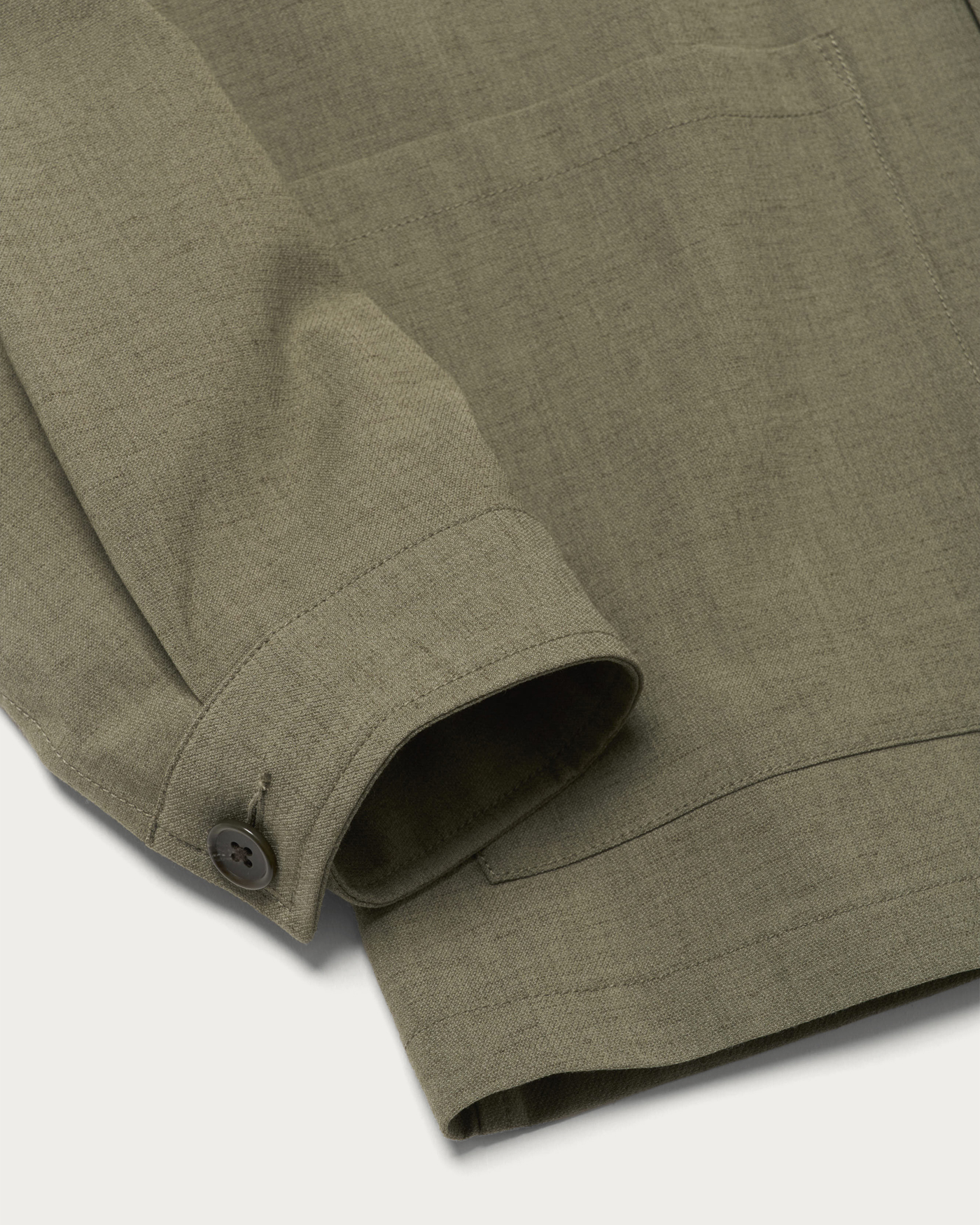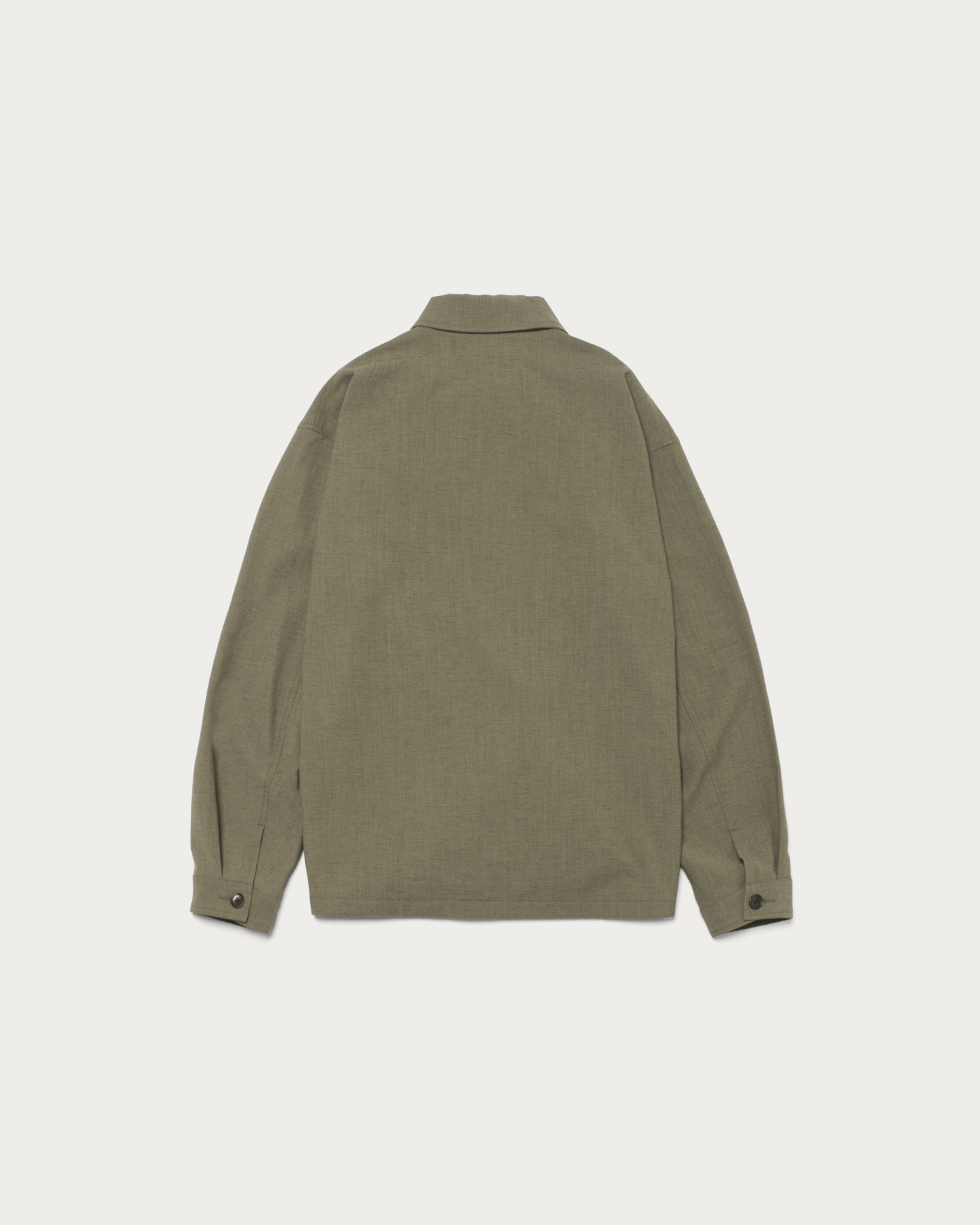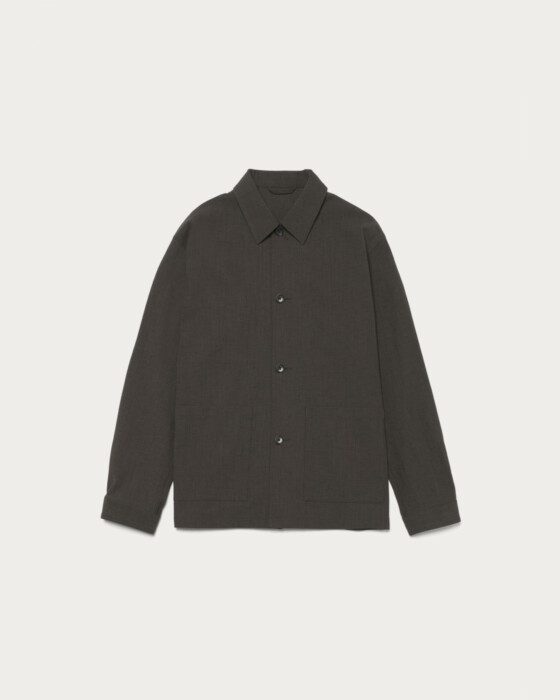 ディテールをそぎ落とした、シンプルなカバーオールジャケット。ゆったりとしたフォルムに軽やかな素材感を掛け合わせ、気負わず羽織れるアウターに仕上げました。素材は、染まり方の異なる2種のポリエステルを用いて杢調を表現したカルゼ生地。ポリエステル主体で扱いやすさを備えつつ、麻をわずかにブレンドすることで、どこか天然素材のような表情を持たせています。