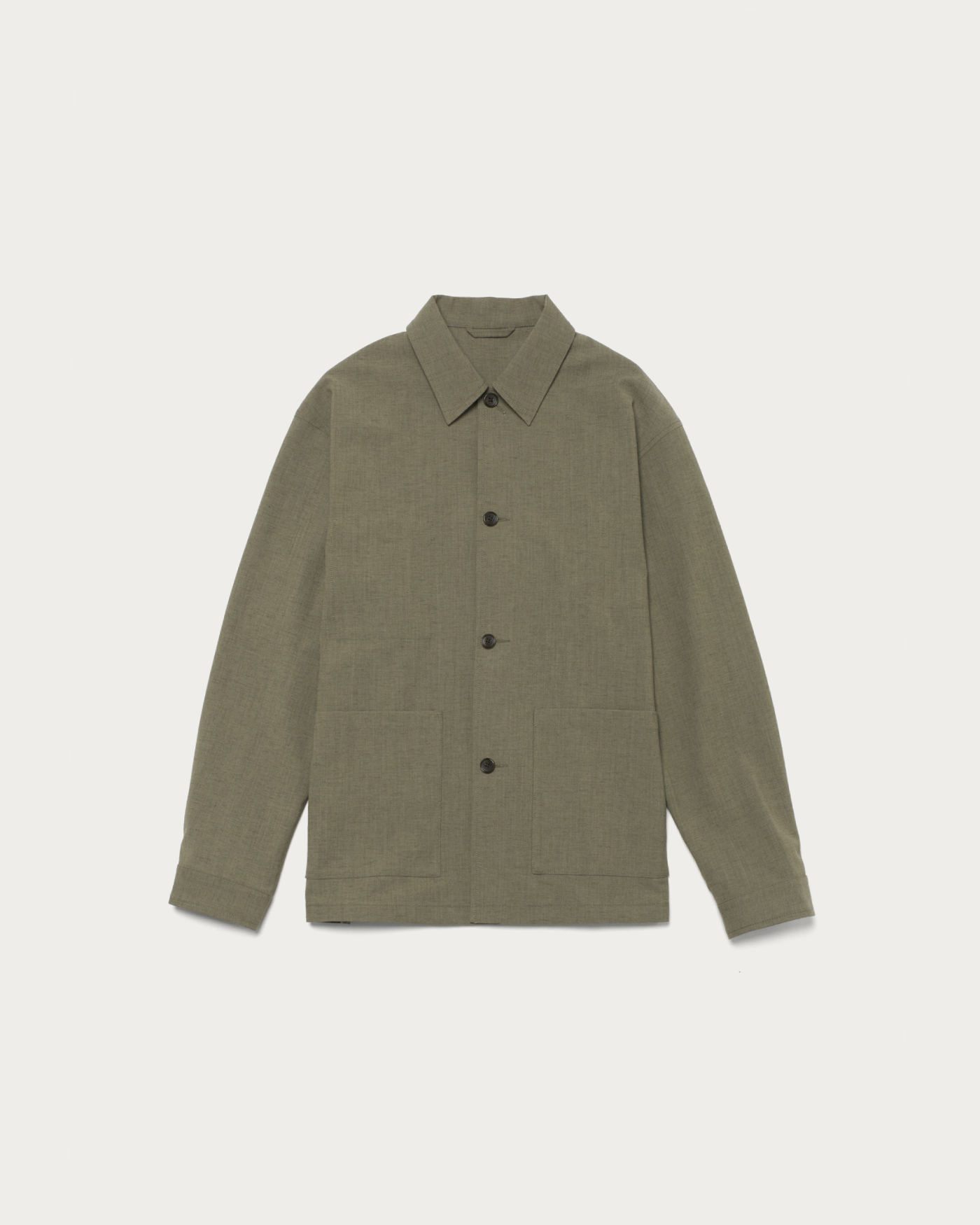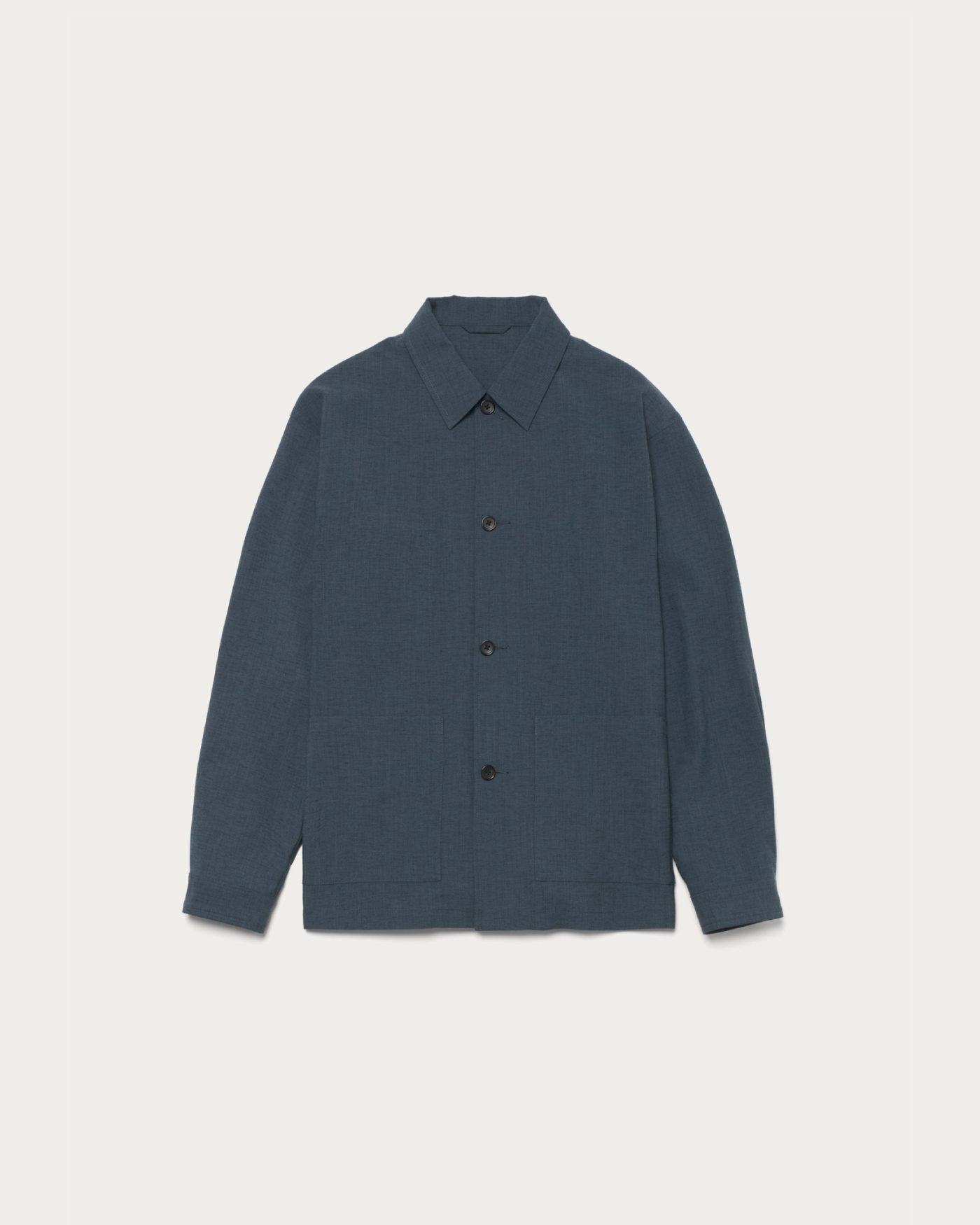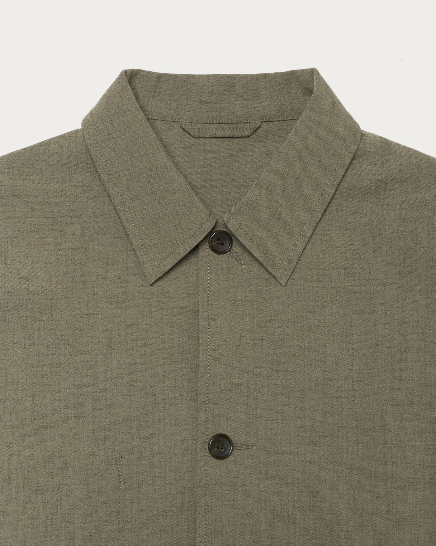 ディテールをそぎ落とした、シンプルなカバーオールジャケット。ゆったりとしたフォルムに軽やかな素材感を掛け合わせ、気負わず羽織れるアウターに仕上げました。素材は、染まり方の異なる2種のポリエステルを用いて杢調を表現したカルゼ生地。ポリエステル主体で扱いやすさを備えつつ、麻をわずかにブレンドすることで、どこか天然素材のような表情を持たせています。