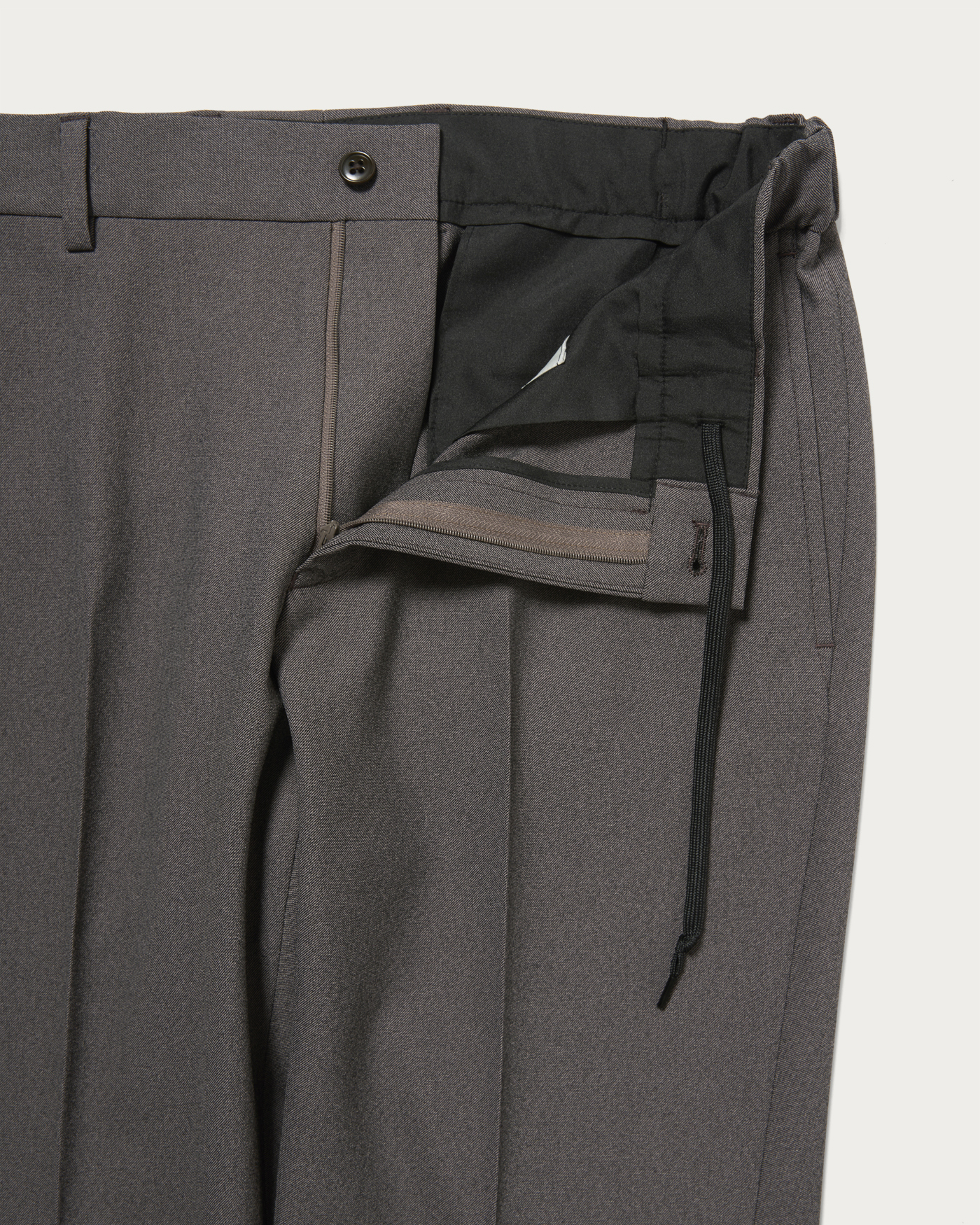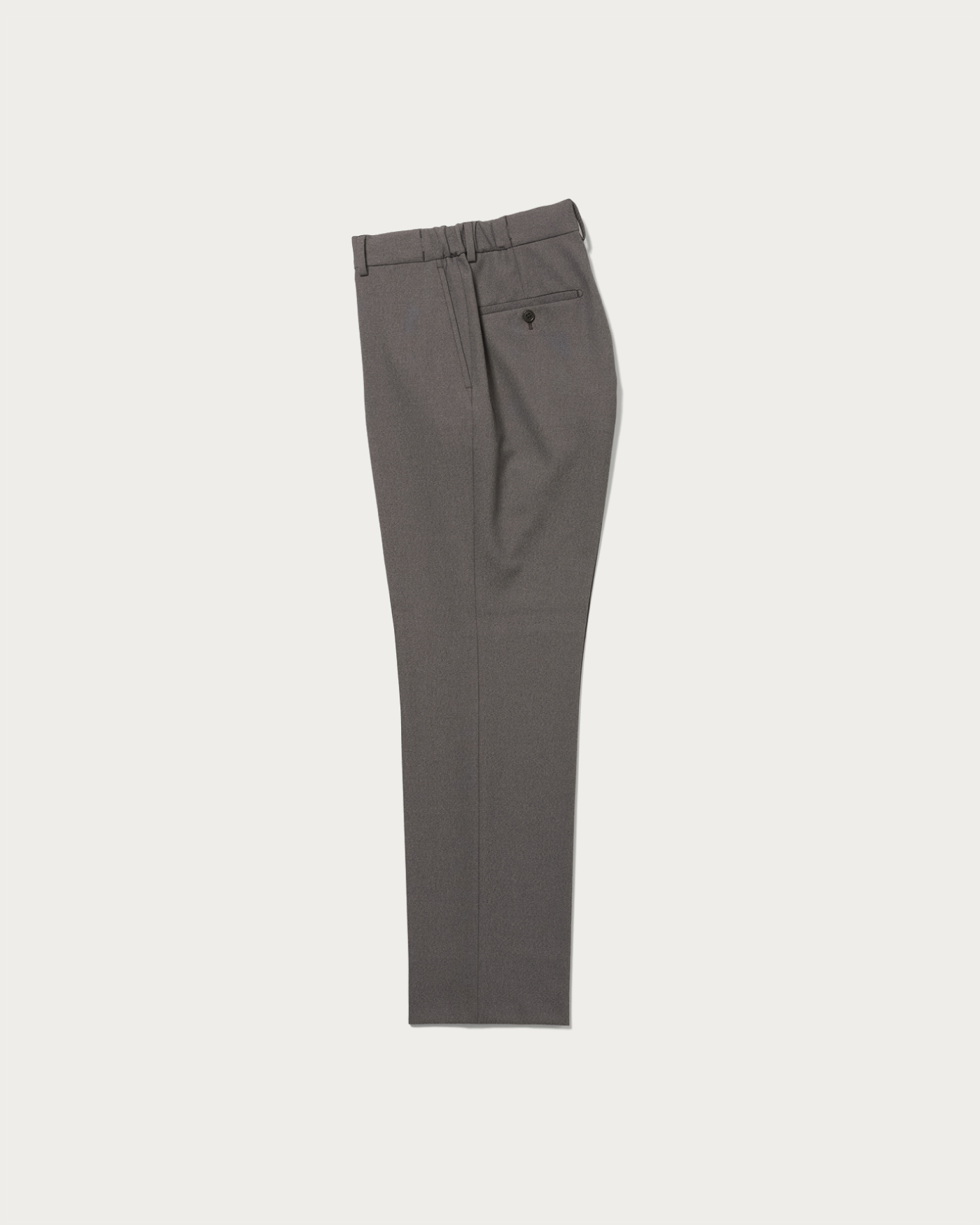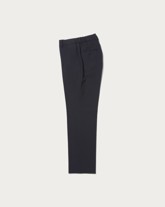 ウールライクなポリエステルで仕上げたシャークスキン素材のイージースラックス。ウエストはゴムシャーリング仕様にしてドローコードを備え、リラックスした穿き心地を叶えました。
