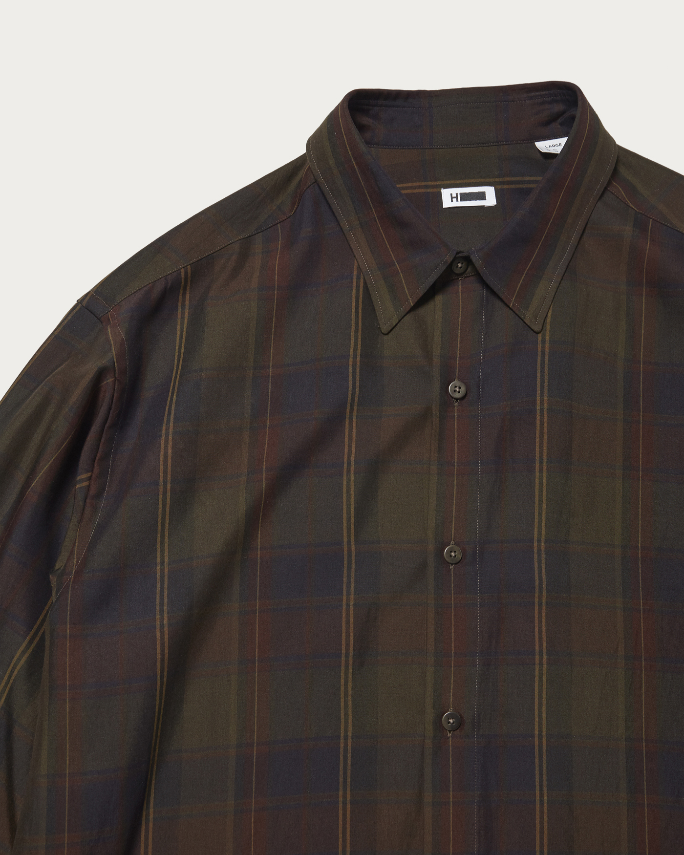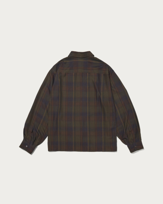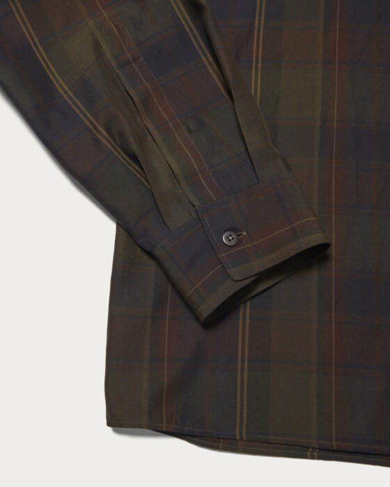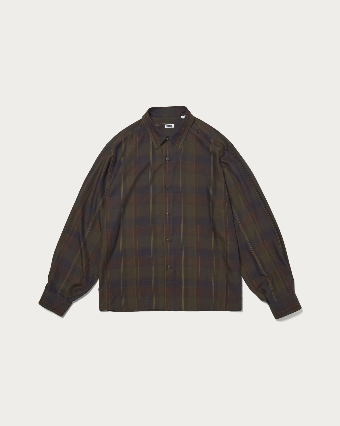 デザインはスクエアテールレギュラーカラーシャツです。やや短めの着丈設計でアウターバランスで身幅よりも袖幅にゆとりをもたせたオーバーサイズです。フロント開閉にはタイラギ貝釦を使用。経糸にレーヨンスパン、緯糸にシルクスパンを使用して高密度で織り上げた平織りのダークチェック。仕上げ工程で特殊バイオ加工を施すことによってレーヨンとシルクが共にフィブリル起毛して、適度なハリと保形性は残しつつも、柔らかく滑らかな手触りに仕上がりました。