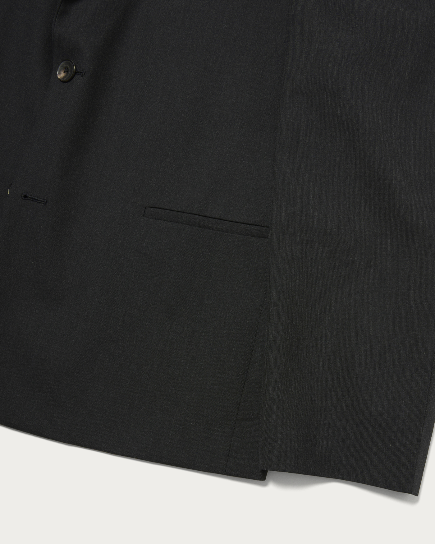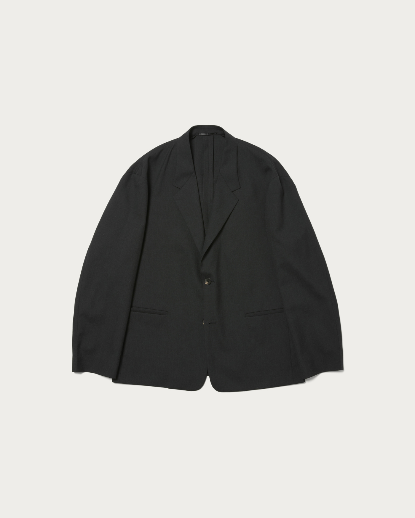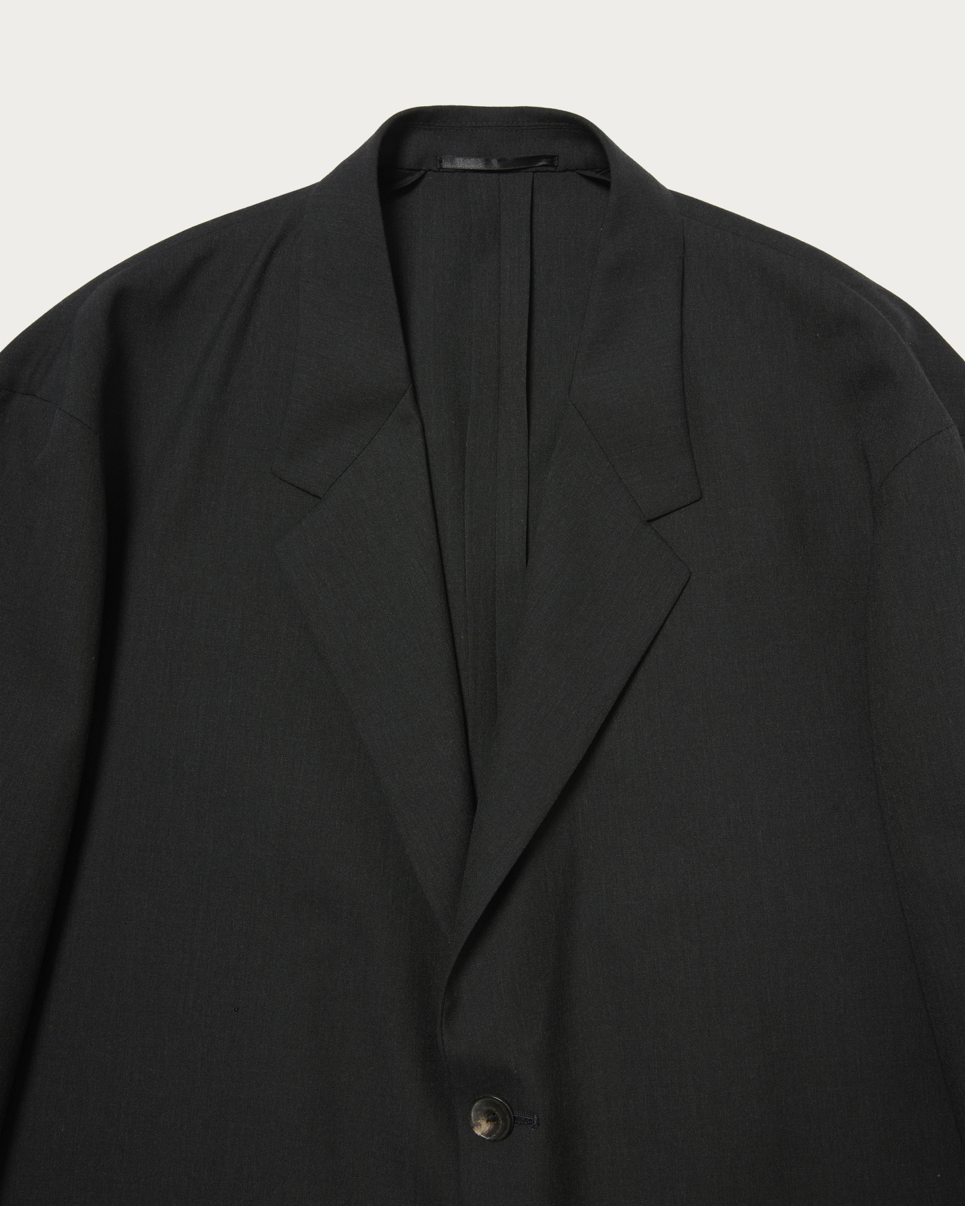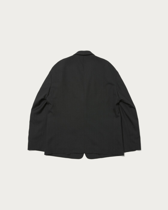 2Bノッチドラペルジャケットです。胸ポケットや袖口開きなどのディテールを排除し、袖山は低く、シルエットはウエストドロップの無いBOXYシルエットでカーディガン感覚で着用出来るジャケットです。低いゴージラインによるVゾーンが今の気分に合います。共生地で仕立てたパンツとセットアップでの着用も可能です。