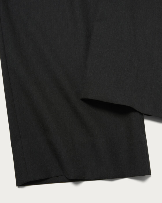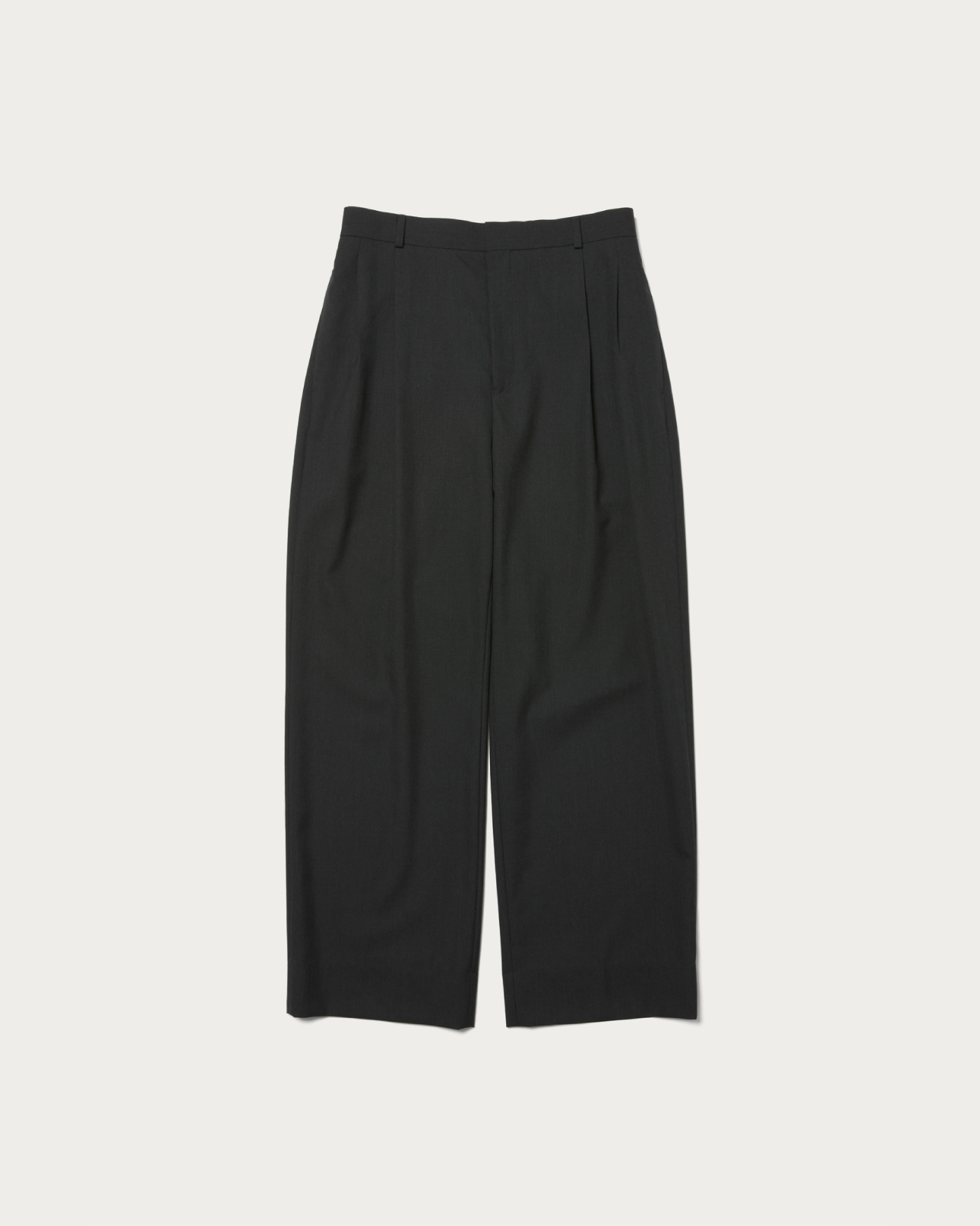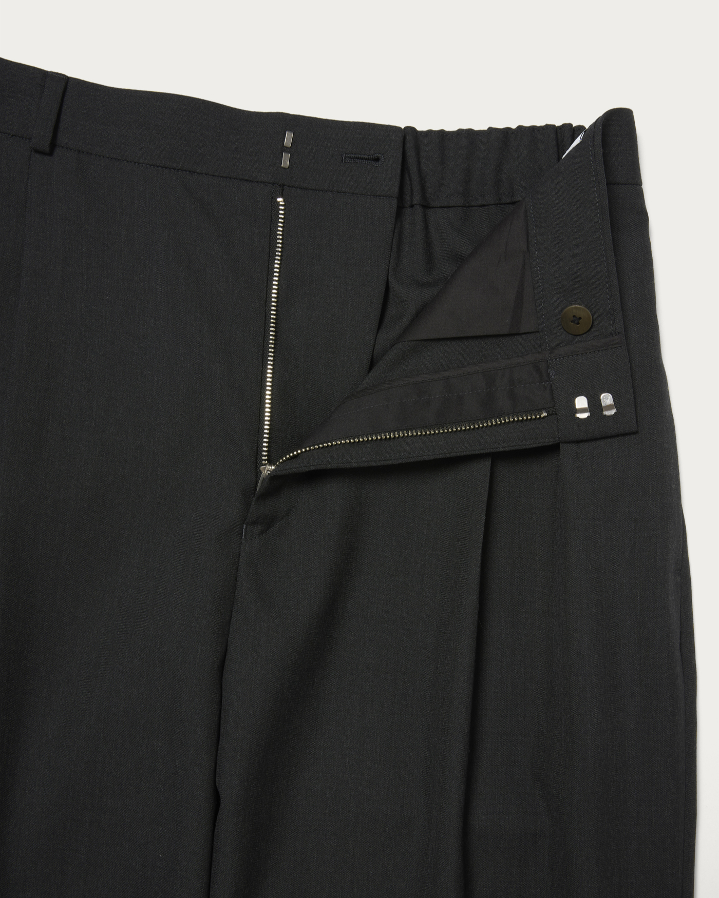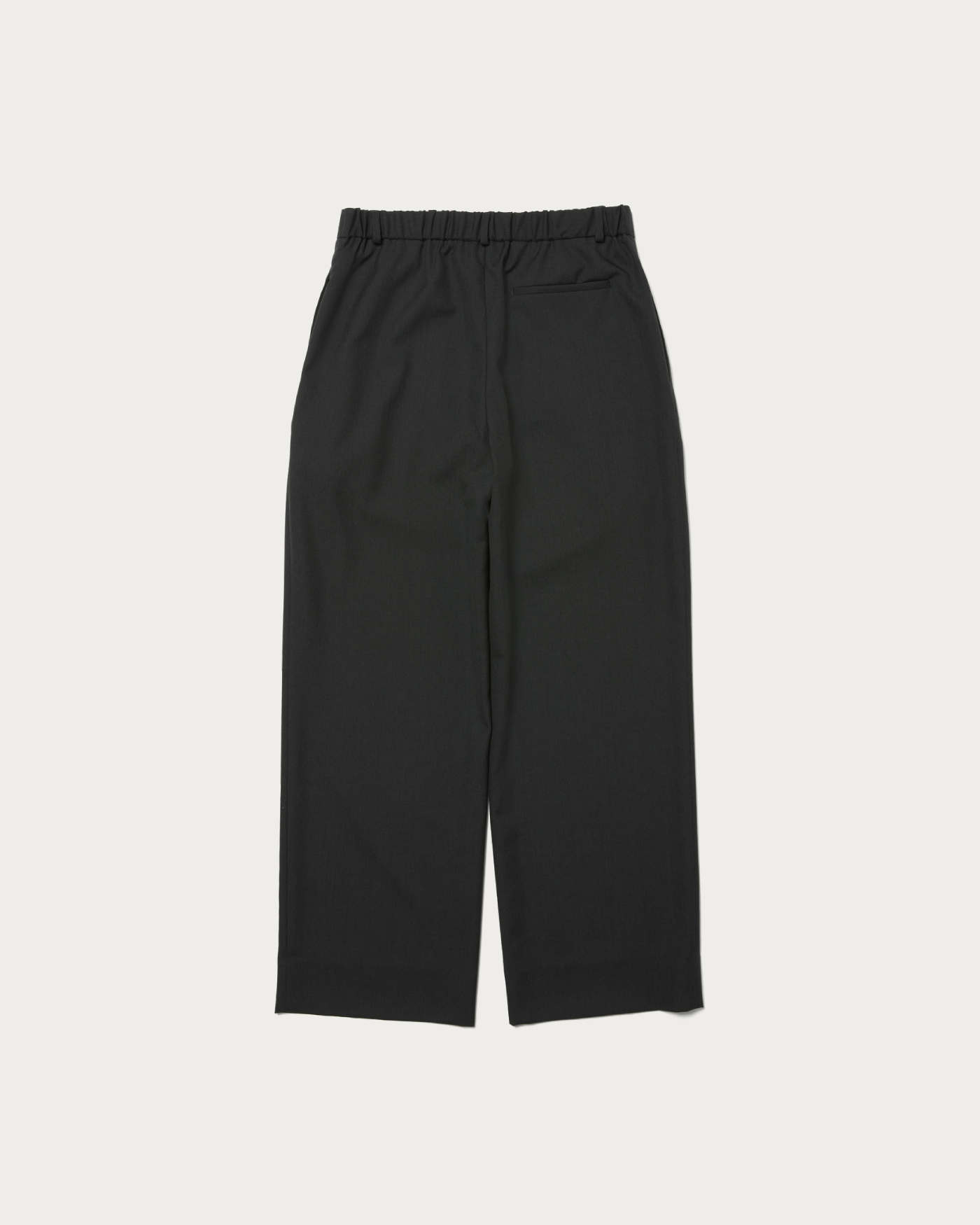 2プリーツのイージーワイドパンツです。フロントは2プリーツデザイン、後ろのみイージーウエストになっている上品見えなイージーパンツです。腰回りは程良くすっきりとさせています。共生地で仕立てたジャケットとセットアップでの着用も可能です。