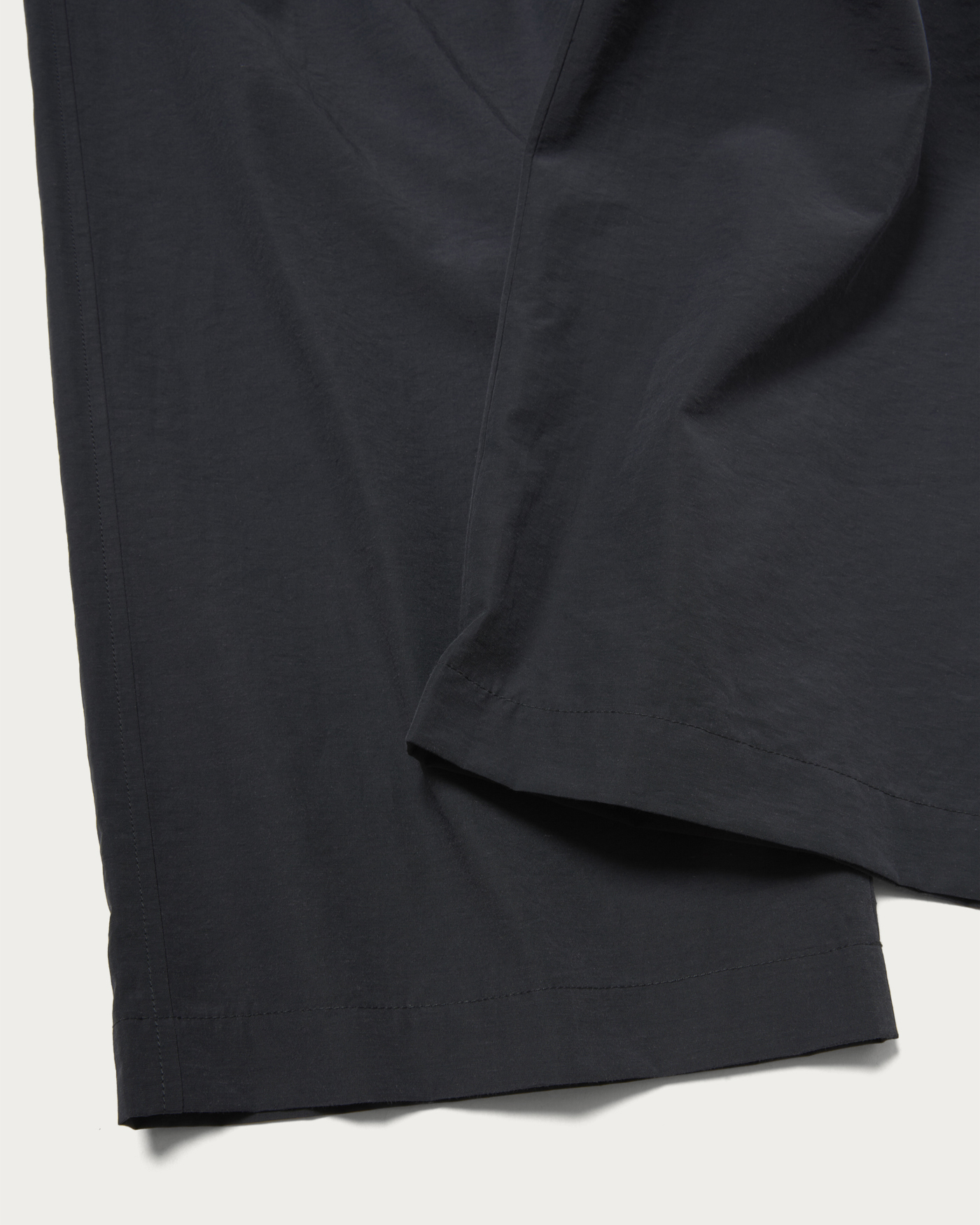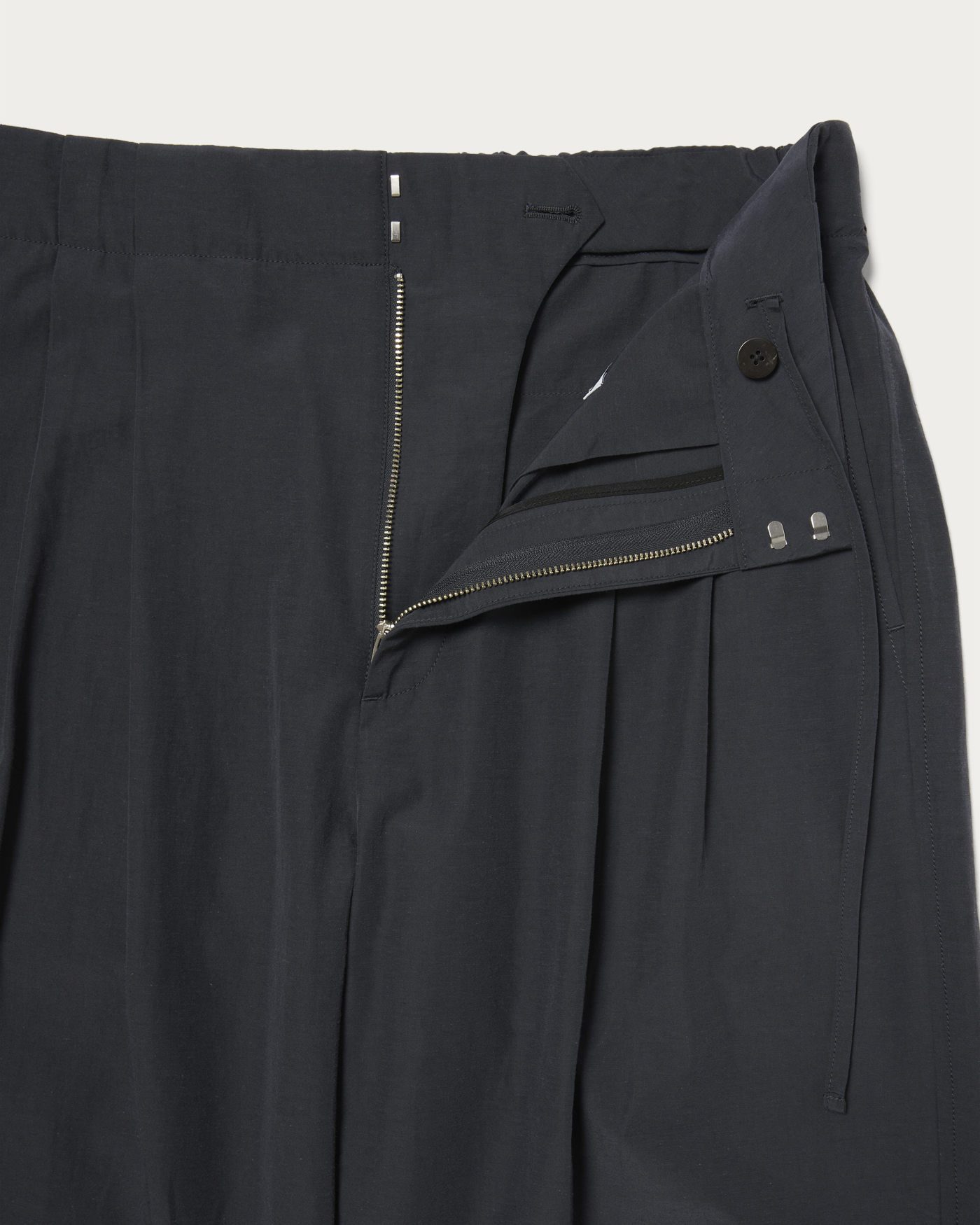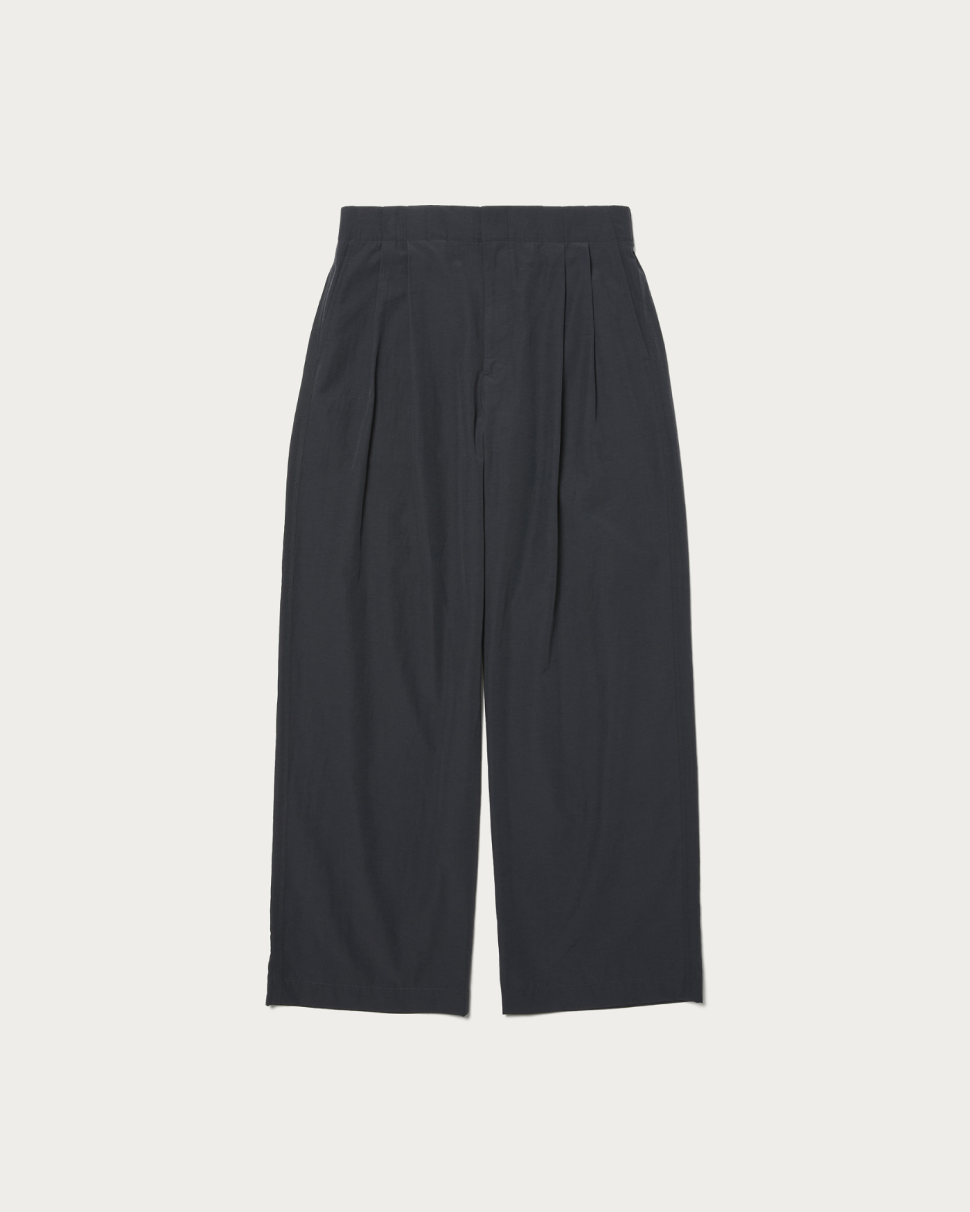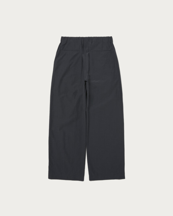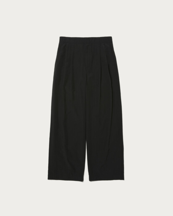 2プリーツのイージーワイドパンツです。フロントは2プリーツデザイン、後ろのみイージーウエストになっている上品な印象のイージーパンツです。イージーウエストで2プリーツでありながら、腰回りは程良くすっきりとさせています。生地はスポーティでカジュアルな印象ですが、綺麗な縫製の2プリーツデザインに落とし込むことによって、上品な大人向けのカジュアルパンツに仕上がりました。