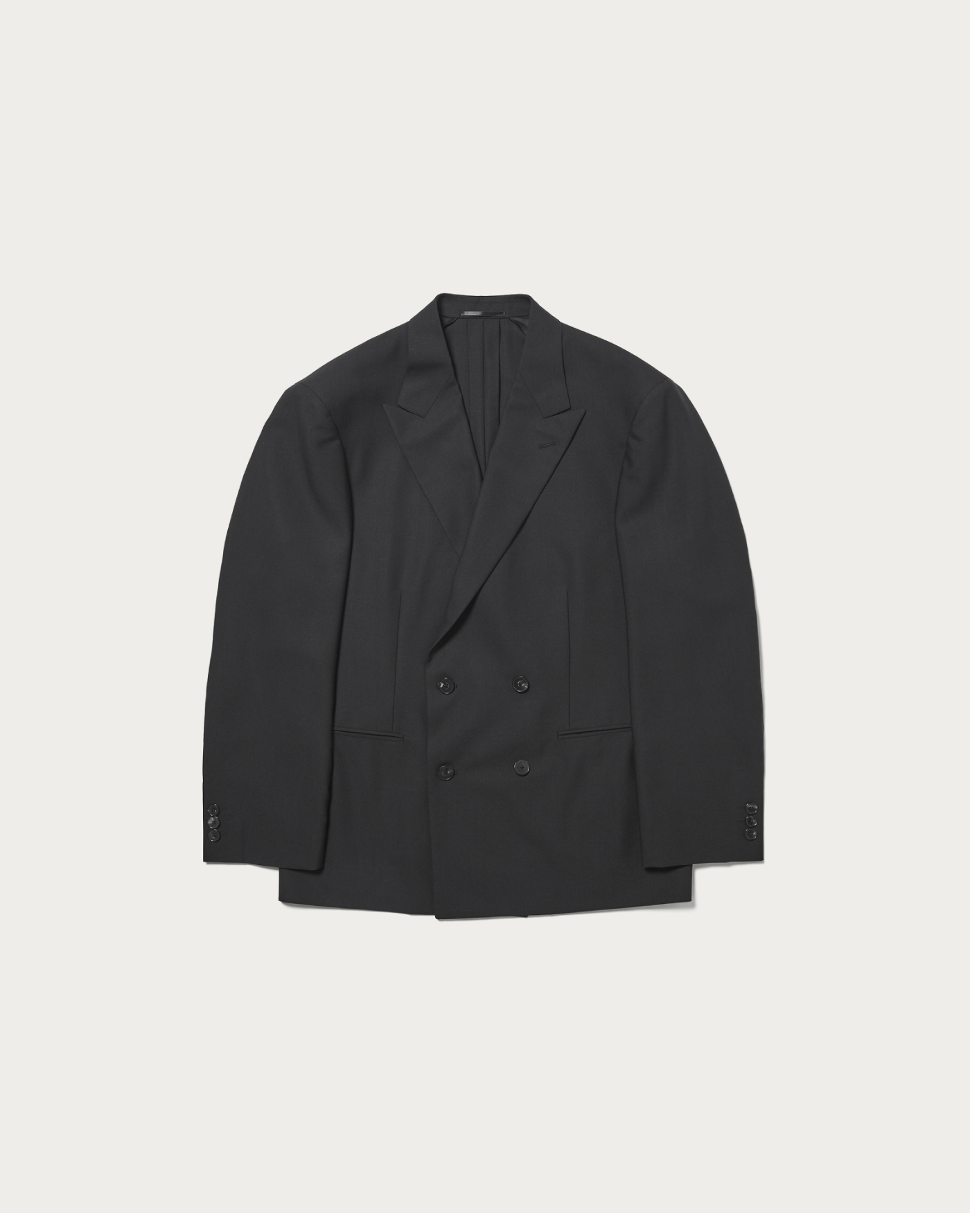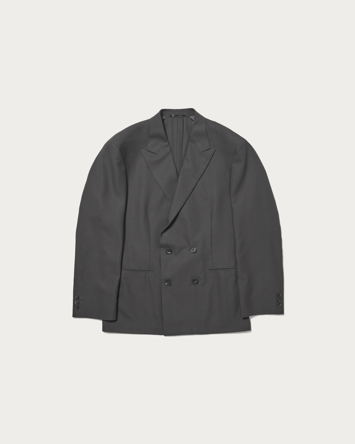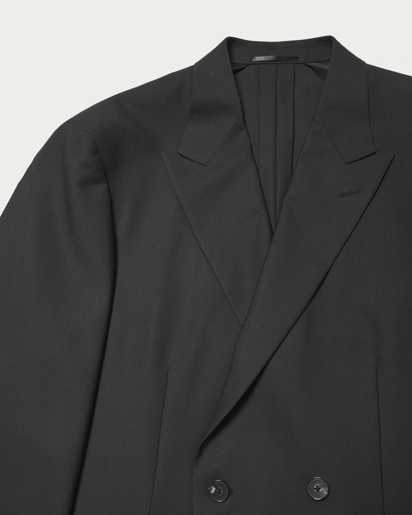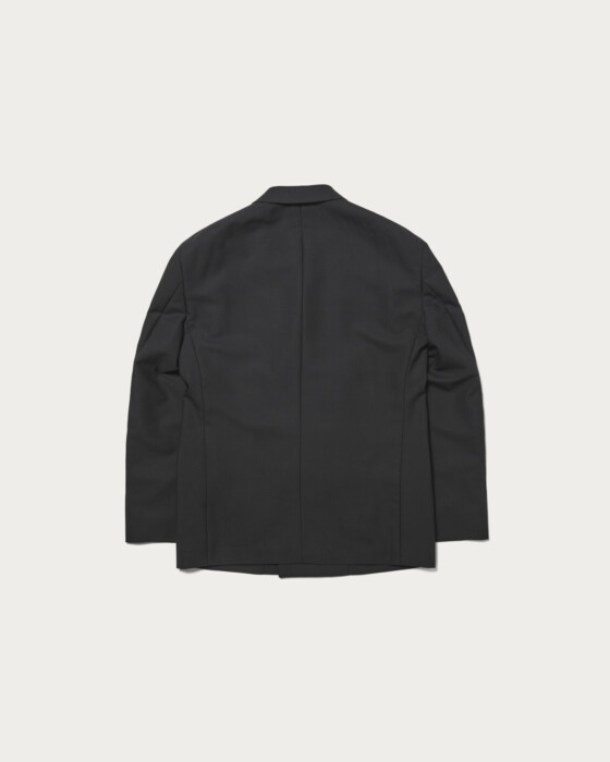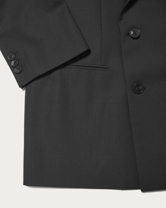 デザインは4B2つ掛けのダブルブレステッドジャケットです。胸箱ポケットを排除し、全体的に直線的でモードなバランス。袖口のボタンは一般的なサイズよりやや大きく静かに主張している、縁が細くて繊細な形状のオリジナルホーンボタンを使用。Super160のハイマイクロン梳毛を強撚した糸を経糸に、緯糸にはキッドモヘア混の糸を用いて織り上げたドスキンを採用しました。英国クラシックなタキシードに使用されるテキスタイル規格をベースに、生地開発を行いました。