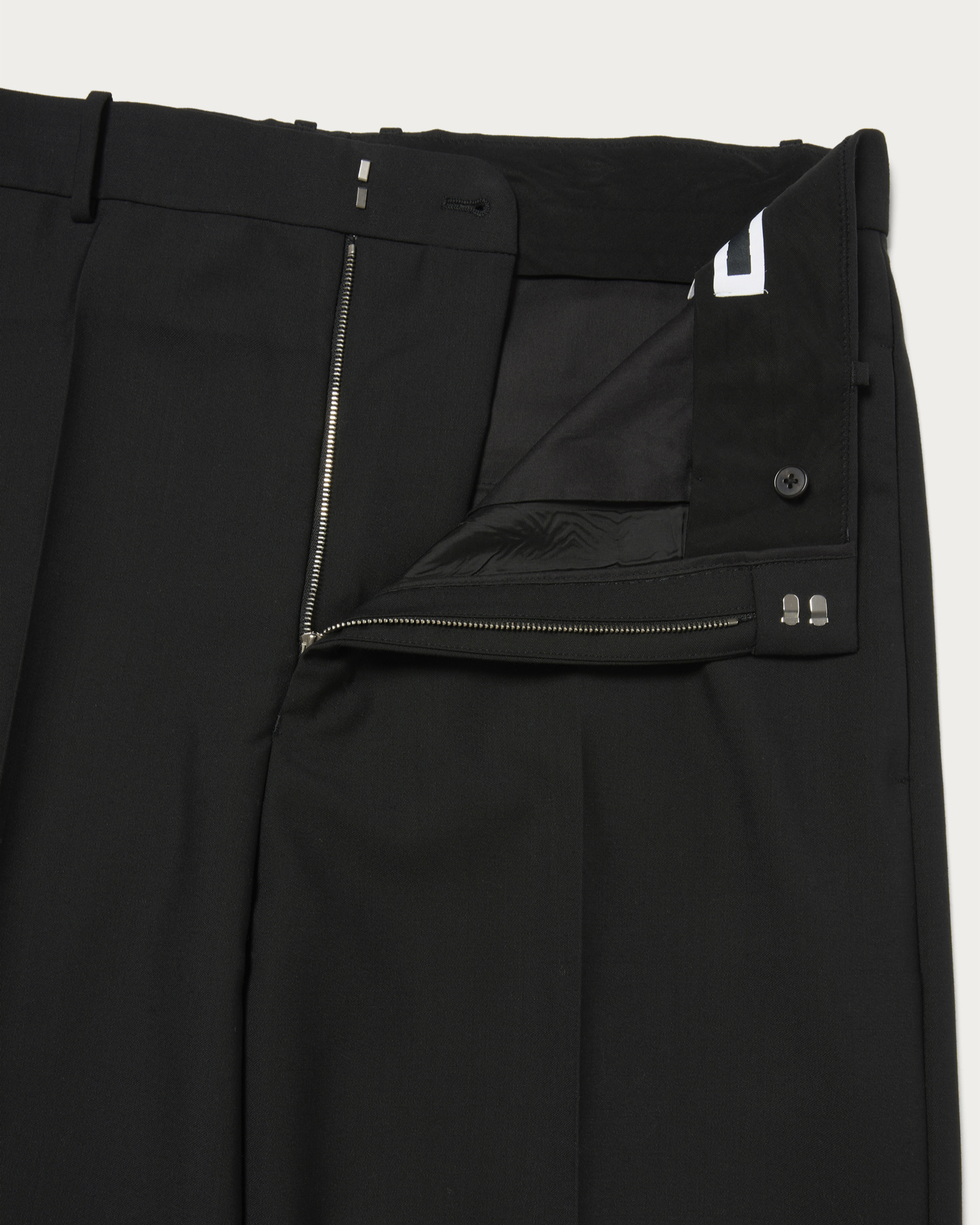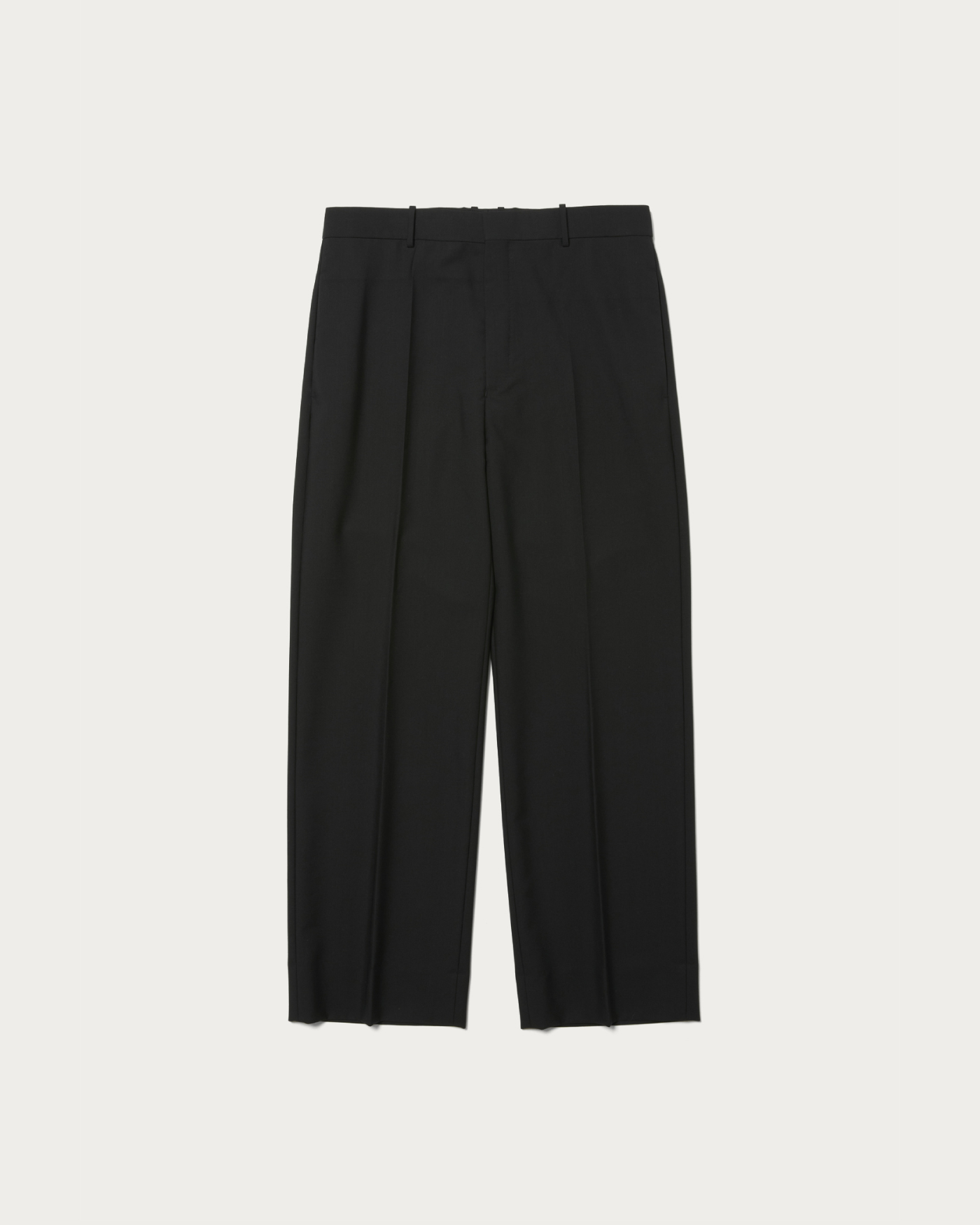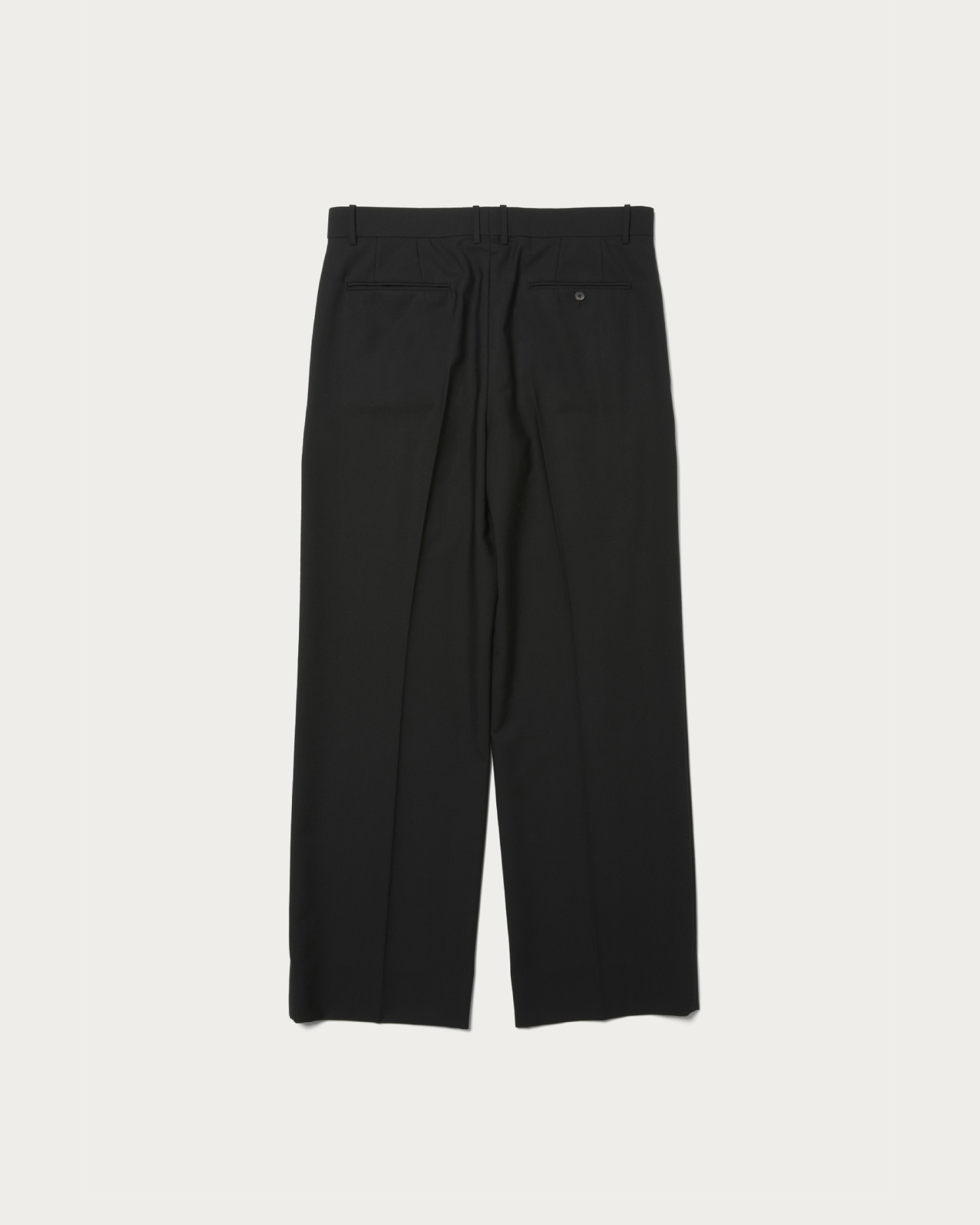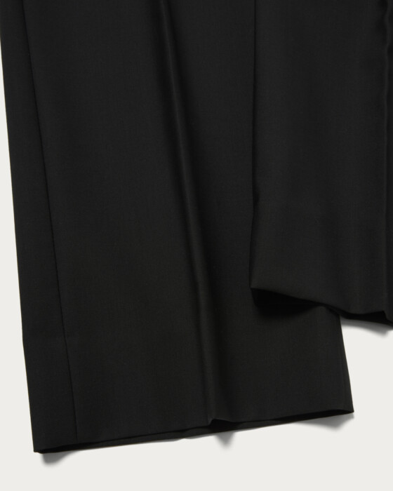 アメリカのヴィンテージワークパンツがデザインのベース。太いベルトループが特徴。シルエットはワイドストレートですが腰回りはスッキリとさせています。経糸に80番手の上質なコットンを三子撚りした糸を使用。緯糸には防縮加工した梳毛糸を使用して高密度に織り上げたコットンウールギャバジン。ウールの上品さとコットンのカジュアルさを併せ持った万能な生地感が特徴です。